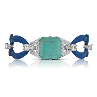 “Two expressions of timeless elegance: the Helena Choker in emerald green and in ruby pink. Sleek CZ bands meet regal gemstones, creating jewels that whisper grace yet radiate unmistakable power.”