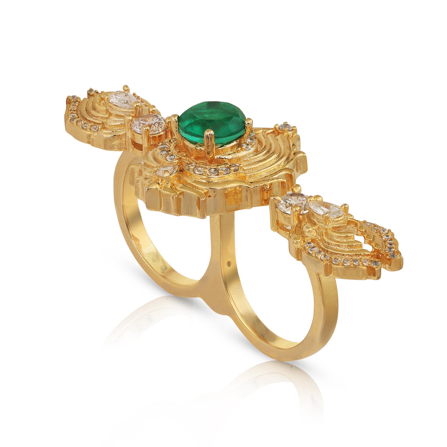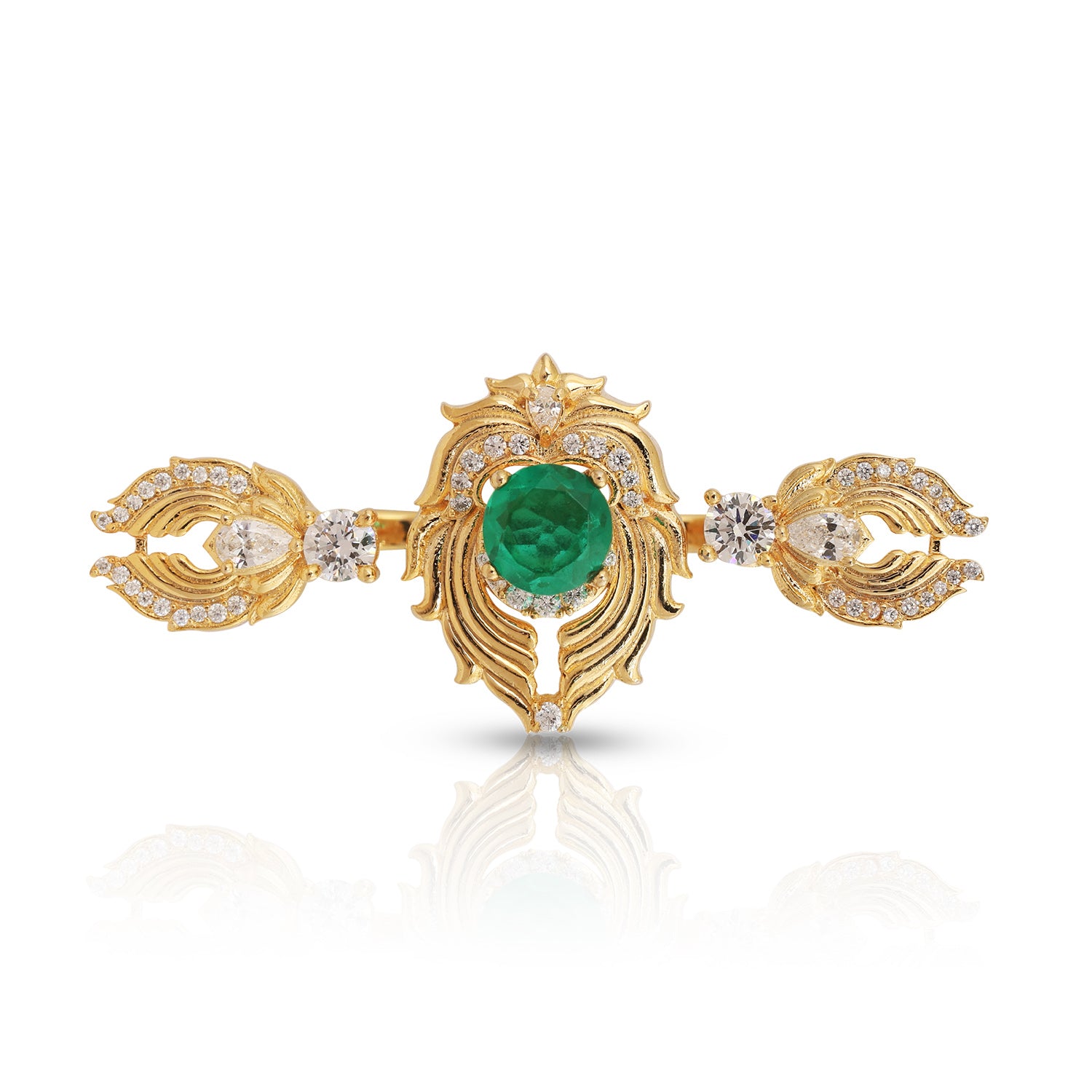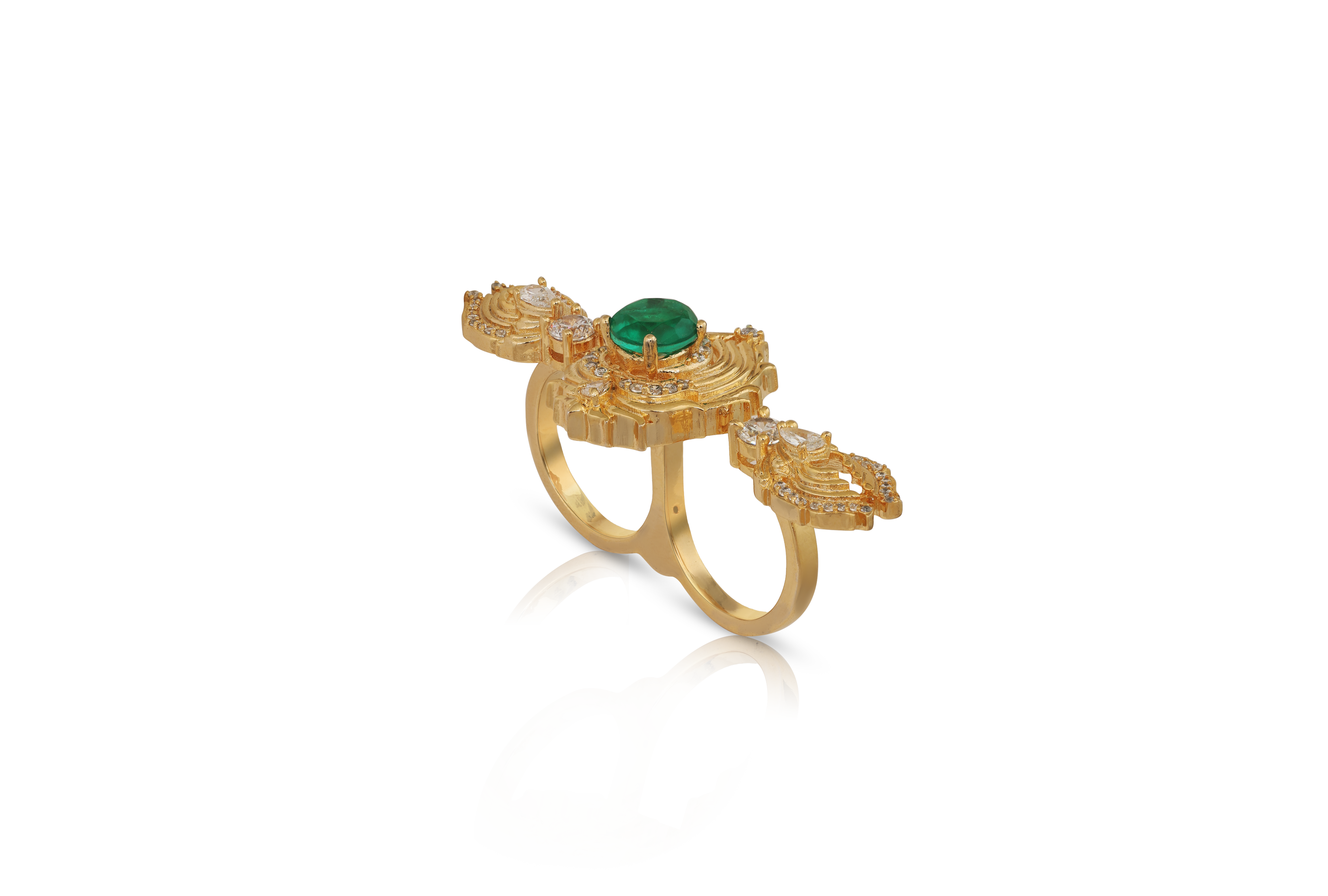 Bold and sculptural, the Azmira Ring is designed to captivate with architectural elegance. A vivid emerald-toned centre stone anchors the design, framed by fluid gold detailing and delicate crystal accents that create depth and movement.