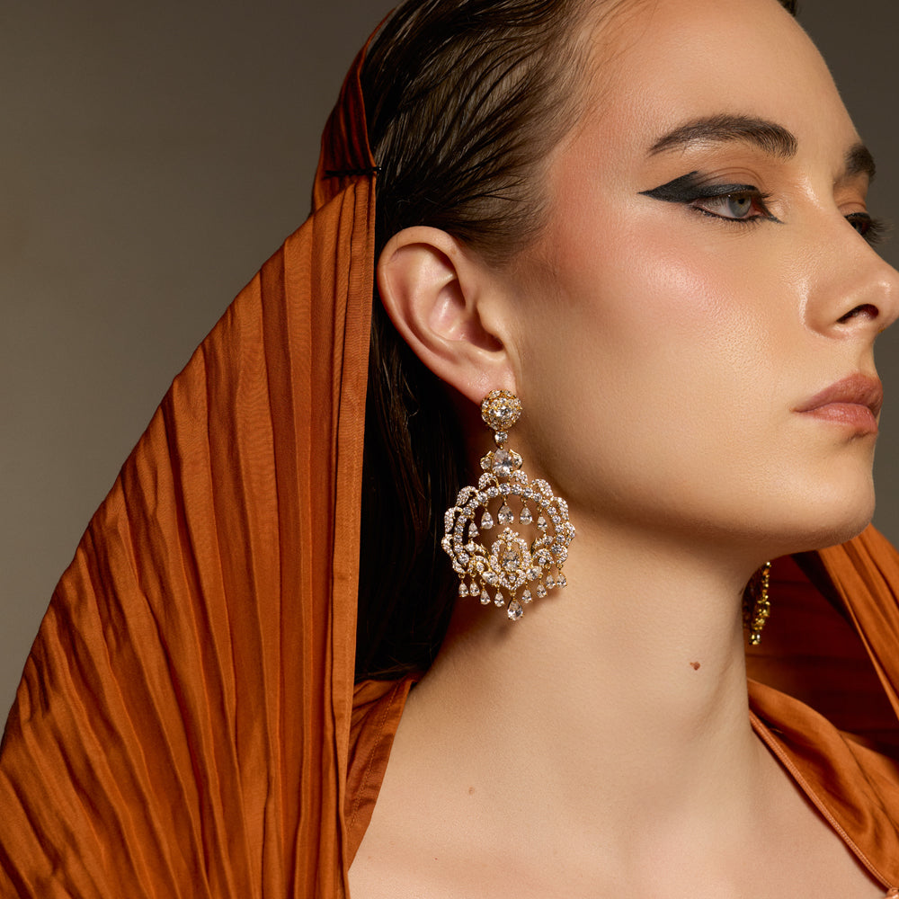 Intricately crafted and undeniably regal, the Maysa Dangle Earrings are a celebration of ornate design and luminous brilliance. CZ stone encrusted stud gives way to delicately layered filigree work, forming a sculpted circular silhouette adorned with cascading teardrop accents.