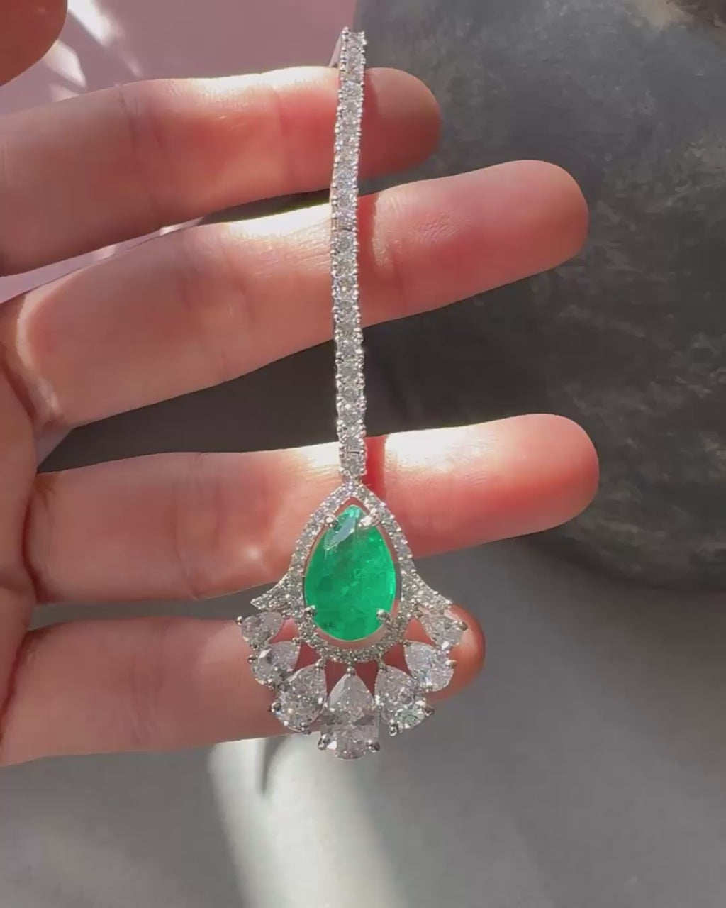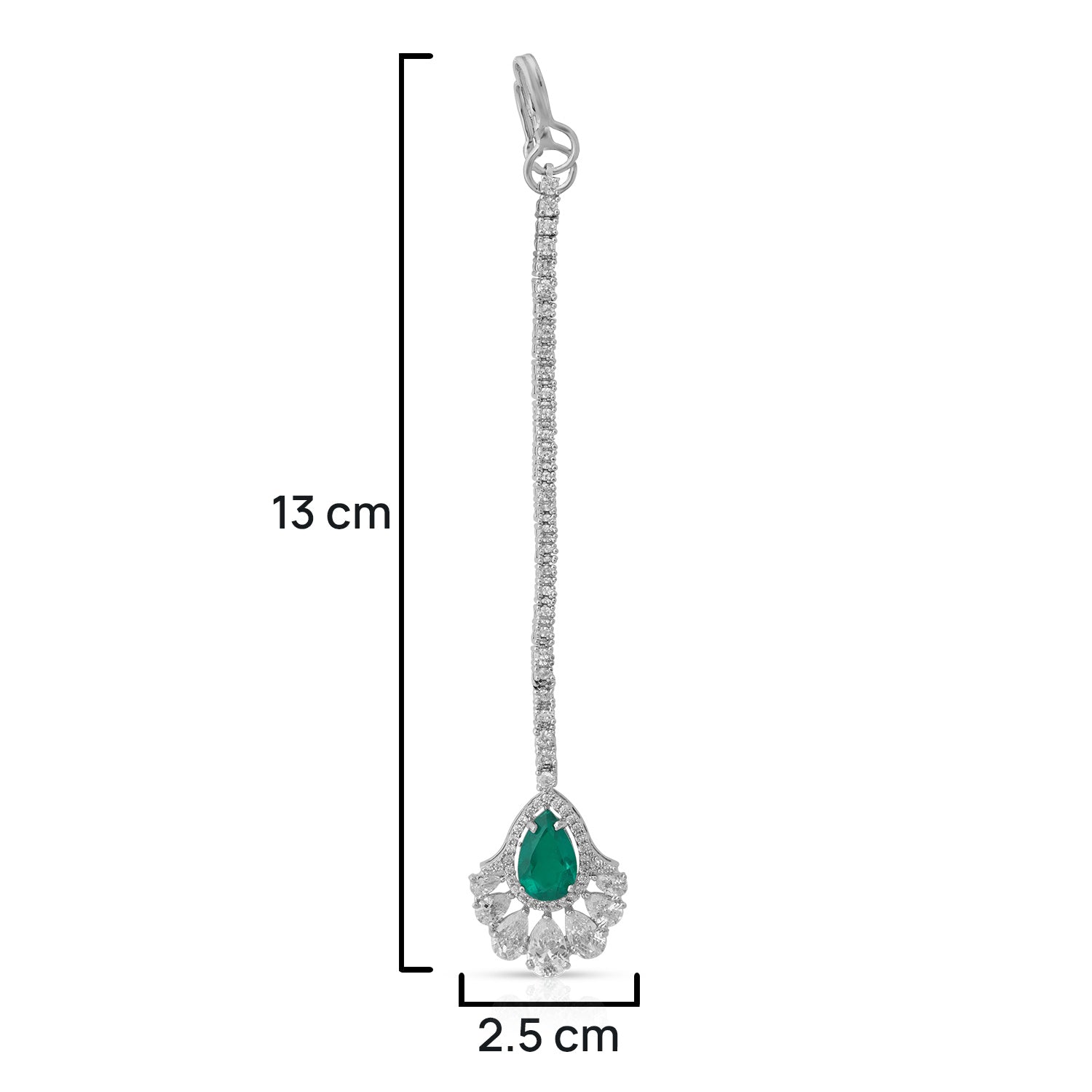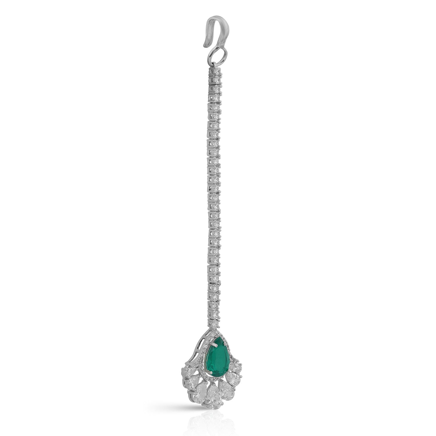 Elevate your style with Amira Maang Tikka - a maang tikka adorned with sparkling cubic zirconia and a vibrant emerald green stone. Perfect for adding a touch of modern elegance to any traditional or contemporary look.