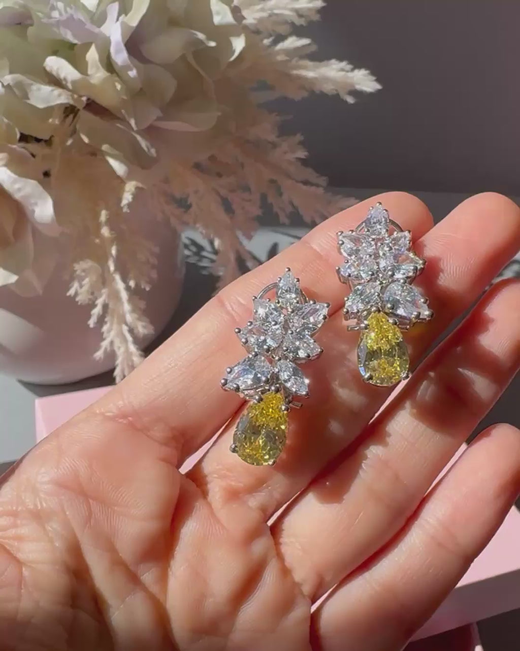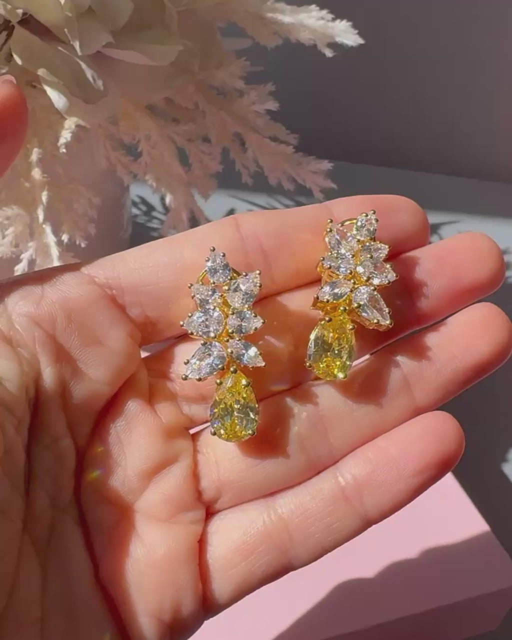 Be the centre of attention with our Khadeeja yellow CZ earrings. The cubic zirconia adds extra sparkle to these unique earrings. Perfect for adding a touch of glam to any outfit. Shine on!
