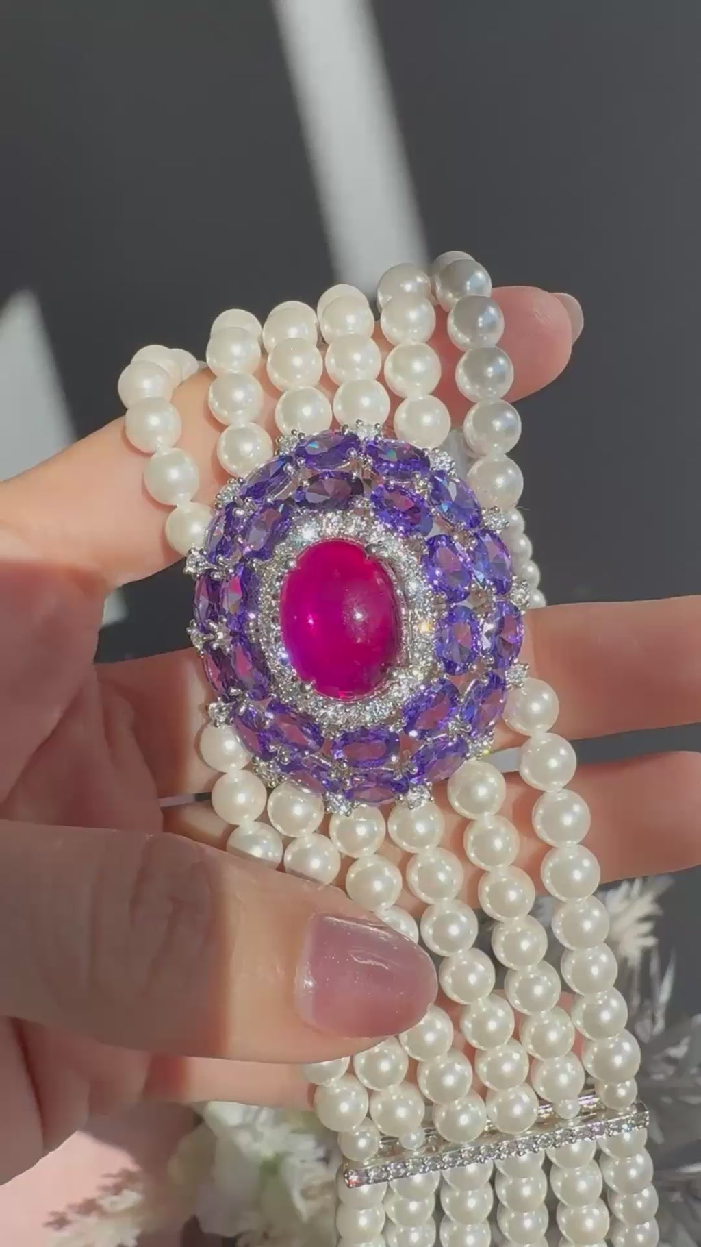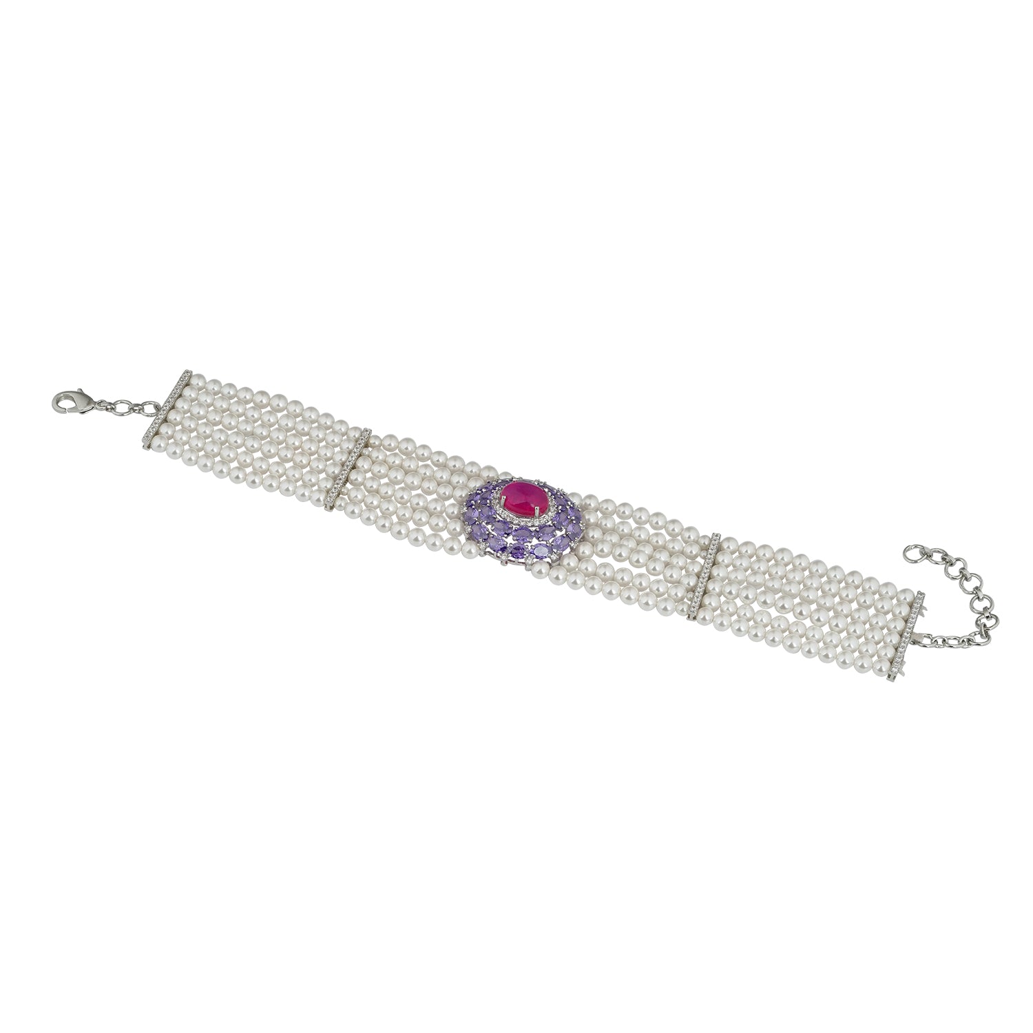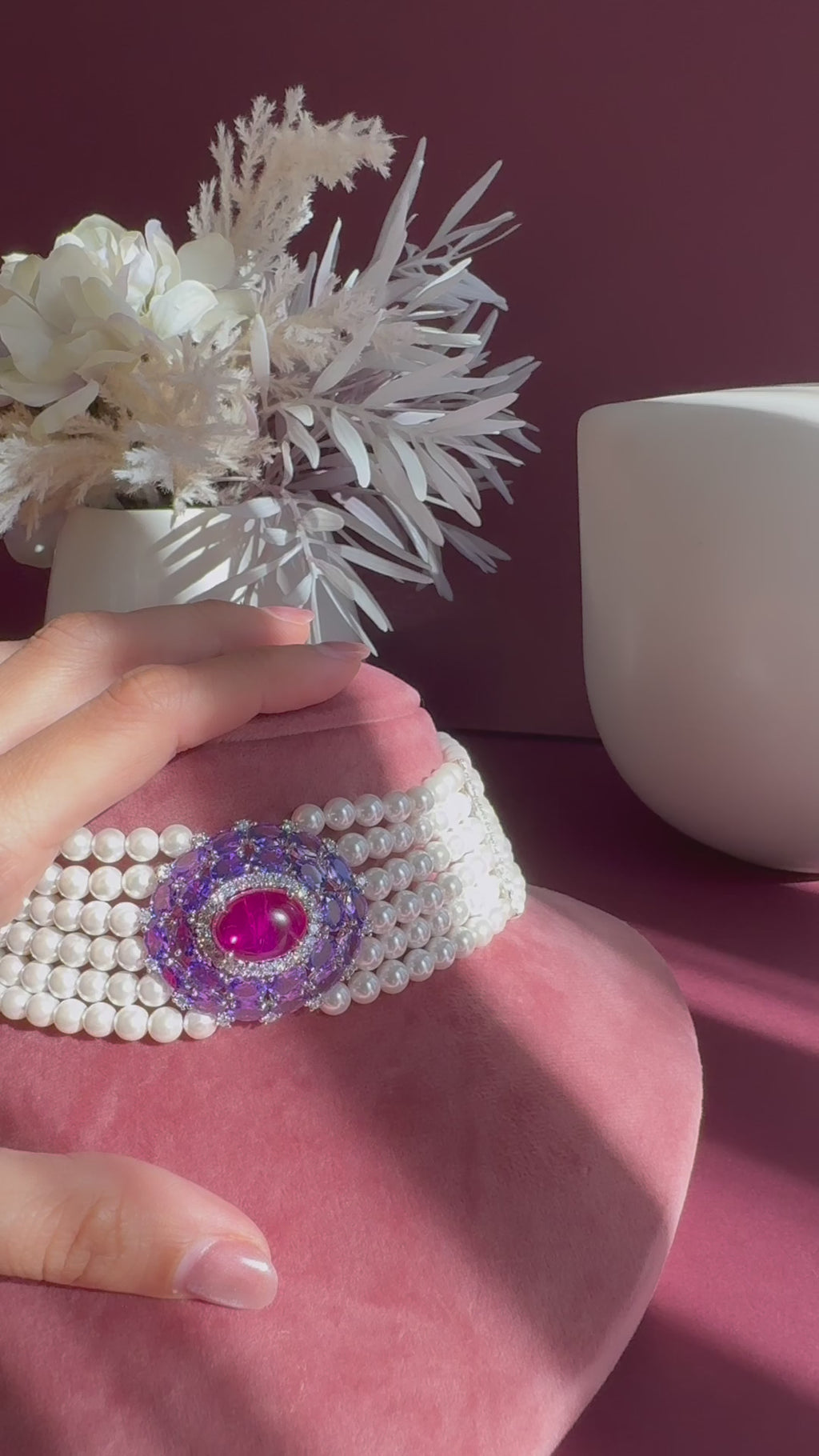 The Adelina Choker Set is an ode to timeless grandeur. Rows of radiant pearls create a regal band, crowned at the center with a vivid crimson stone embraced by a halo of violet gems and delicate CZ accents.