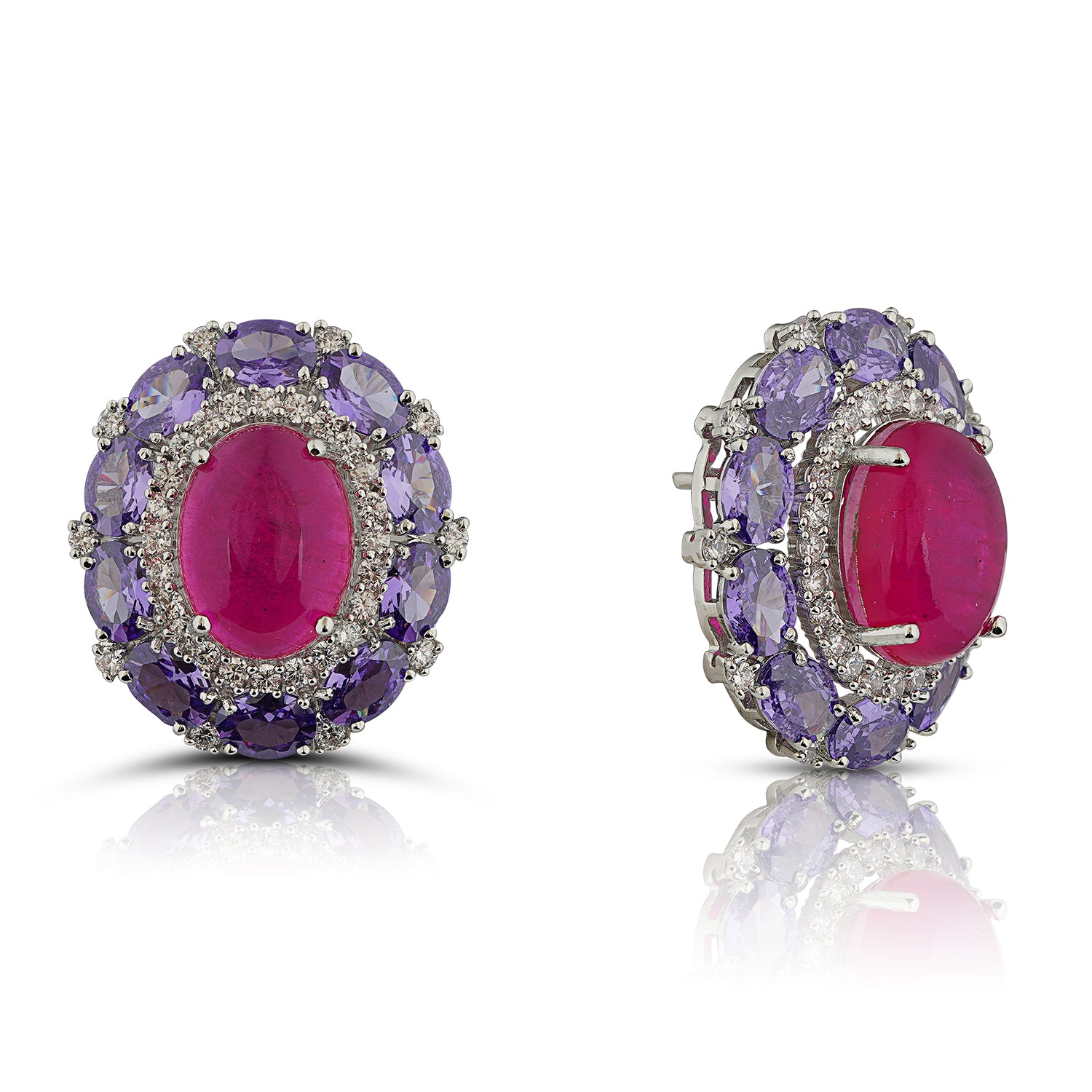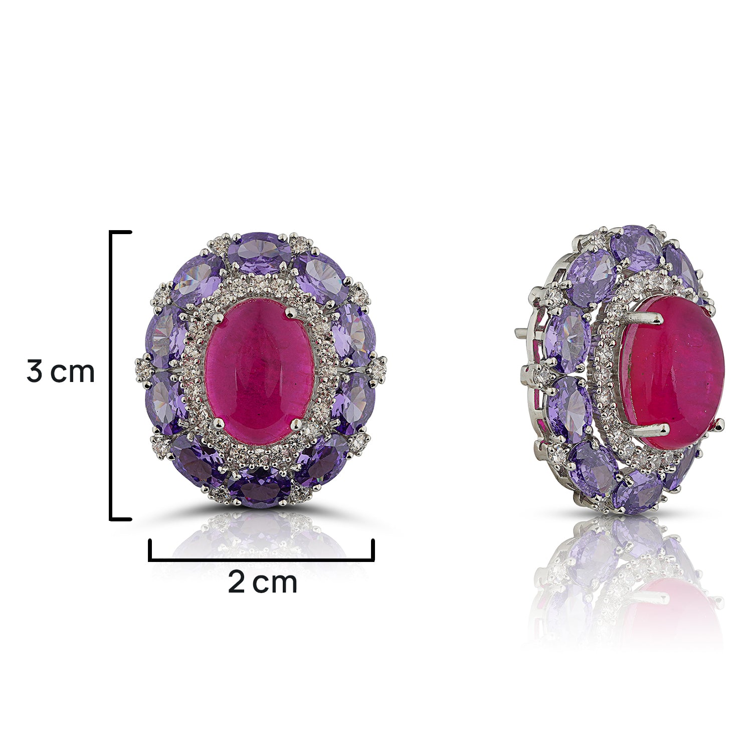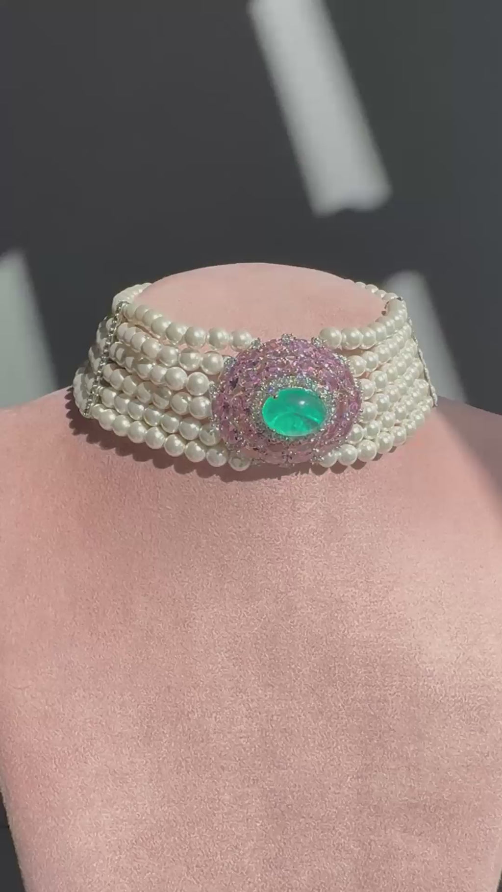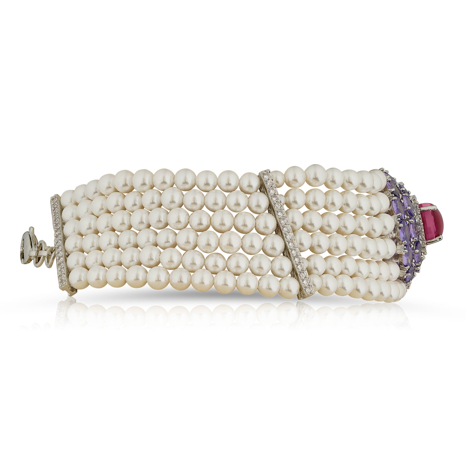 The Adelina Choker Set is an ode to timeless grandeur. Rows of radiant pearls create a regal band, crowned at the center with a vivid crimson stone embraced by a halo of violet gems and delicate CZ accents.