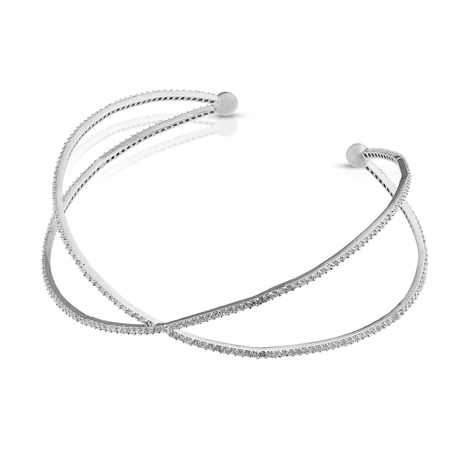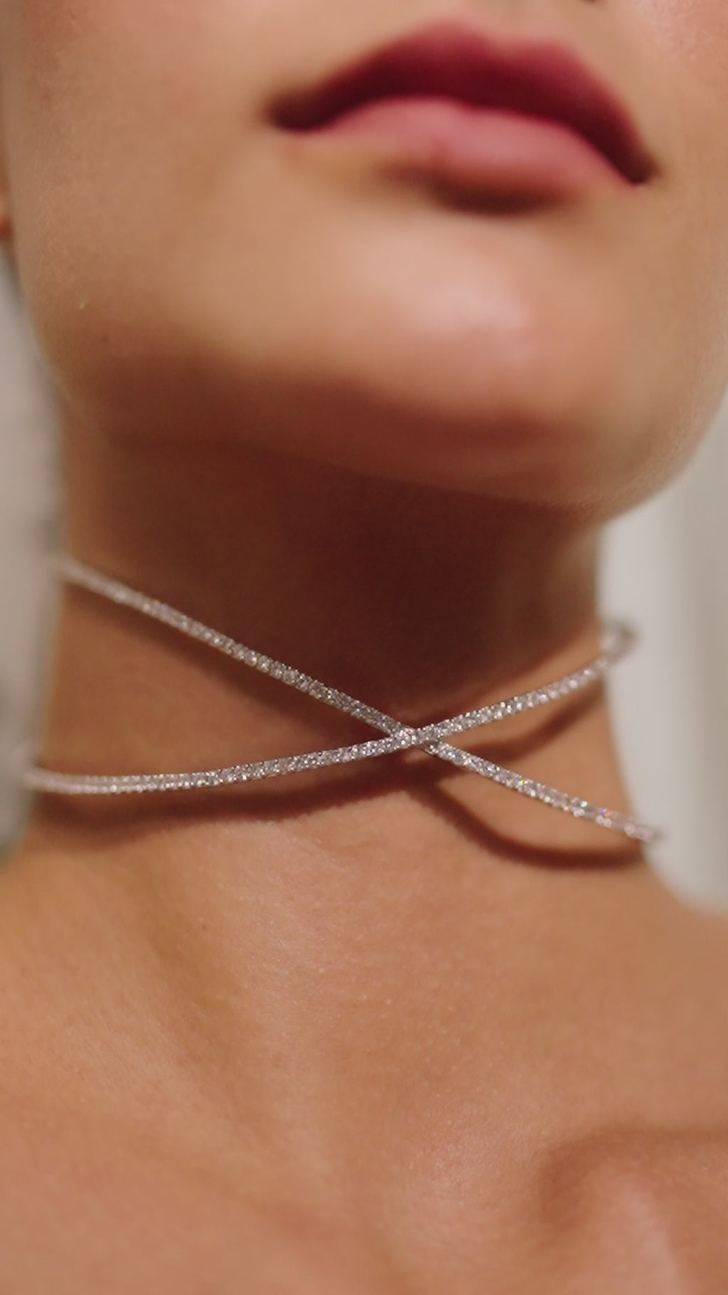 A whisper of modern grace, the Claudia Choker is designed with slender lines that cross delicately, forming a silhouette as fluid as it is striking. Encrusted with glistening CZ stones, it captures the light with every movement, like stars scattered across a twilight sky. Its open-ended form makes it both effortless and bold—an adornment for the woman who embodies quiet strength and luminous elegance.