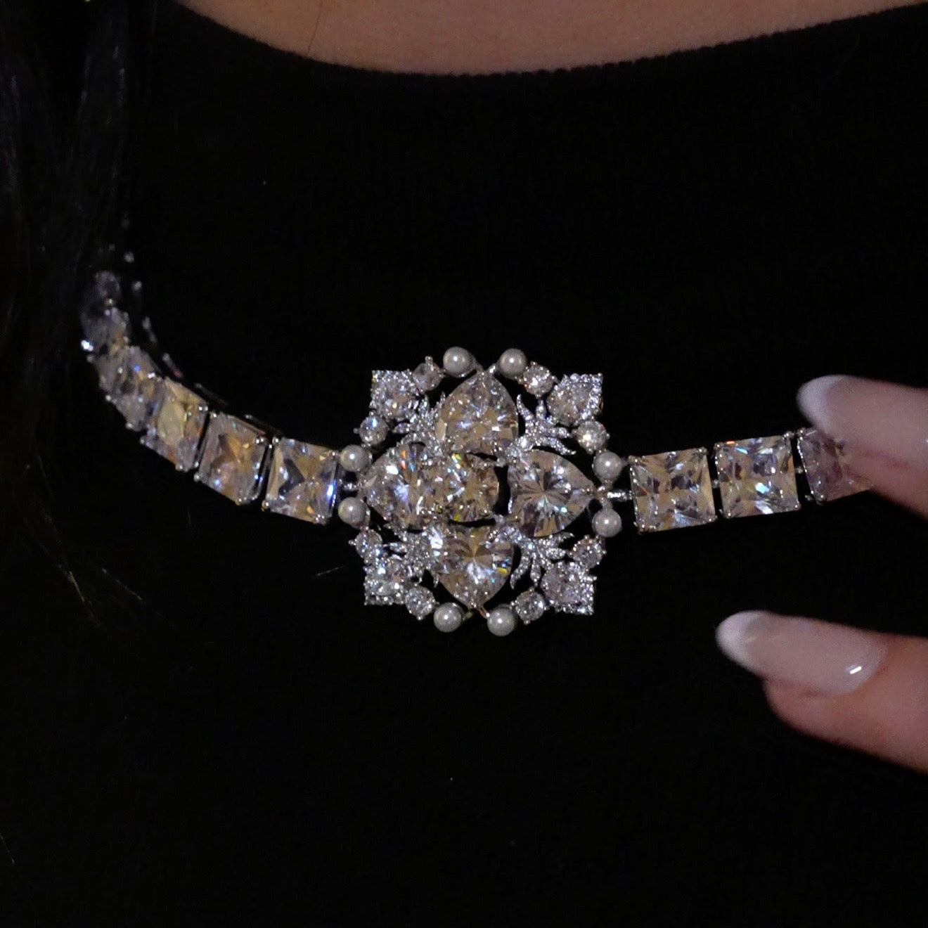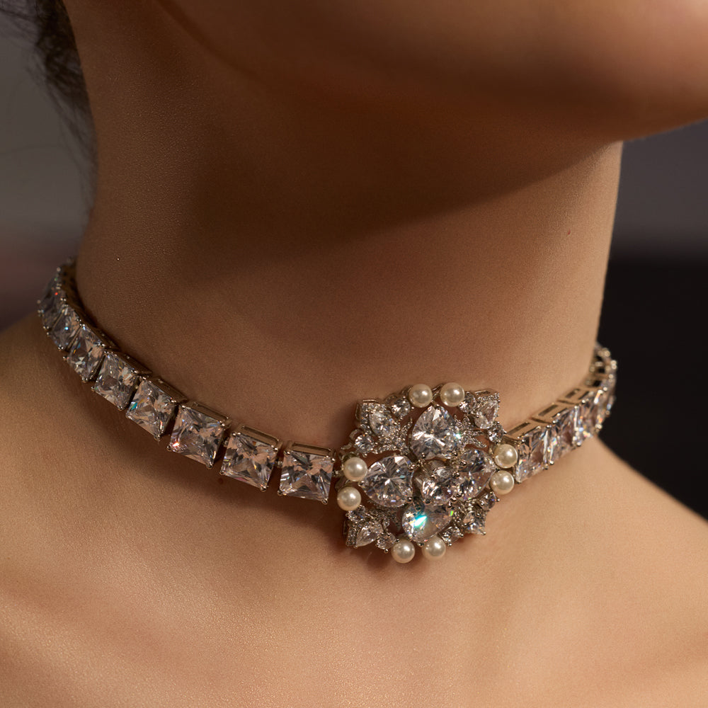 Elegant in structure and radiant in detail, the Aida Choker is a statement of modern sophistication. A sculpted floral-inspired centre motif, set with brilliant-cut CZ stones and delicate pearl accents. The sleek band of precision-cut crystals contours the neckline, creating a refined silhouette that glimmers with effortless grace.