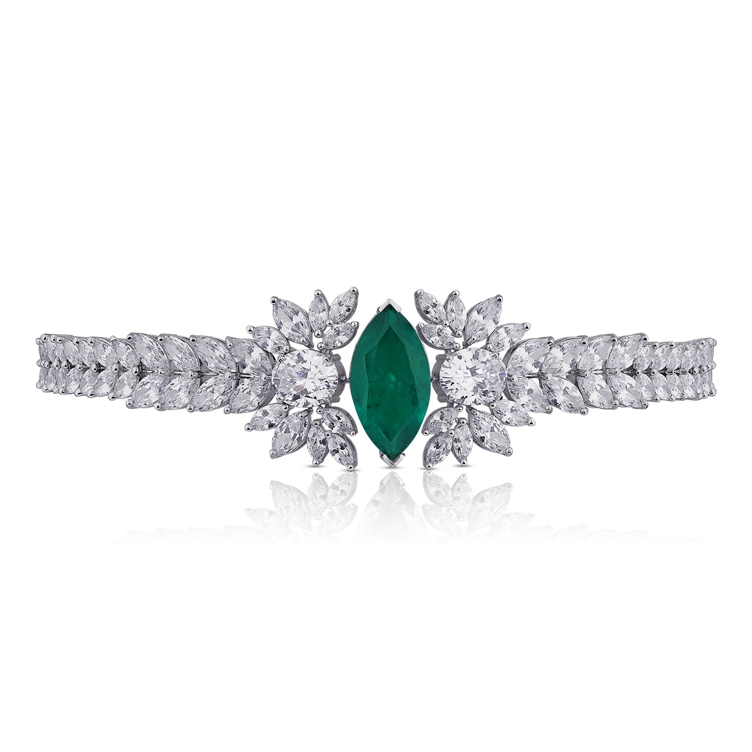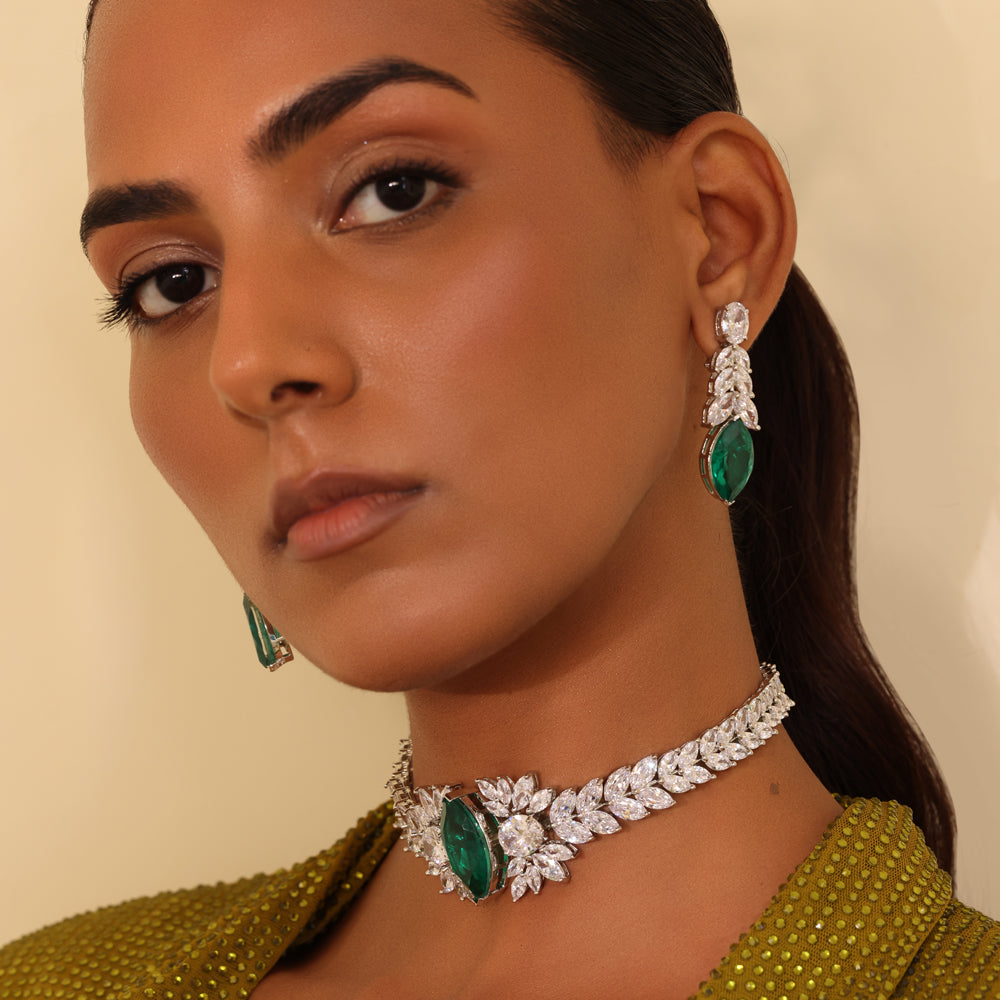 Emerald fire meets crystalline brilliance in the Juliet Choker—an exquisite harmony of depth and light. At its center gleams a marquise-cut emerald stone, regal and magnetic, framed by a constellation of leaf-set CZ crystals that shimmer like frost in moonlight. The band, adorned with graduated brilliance, wraps gracefully around the neck, striking a balance between drama and refinement.
