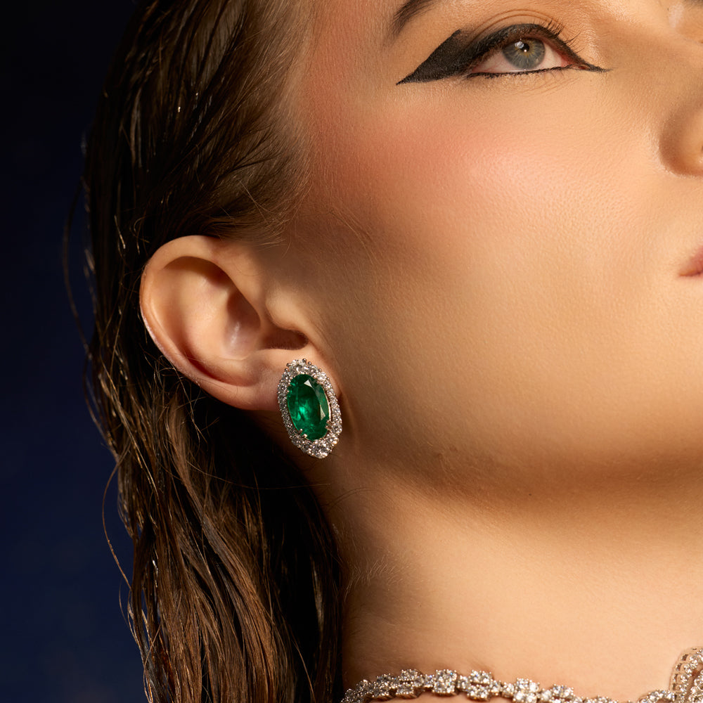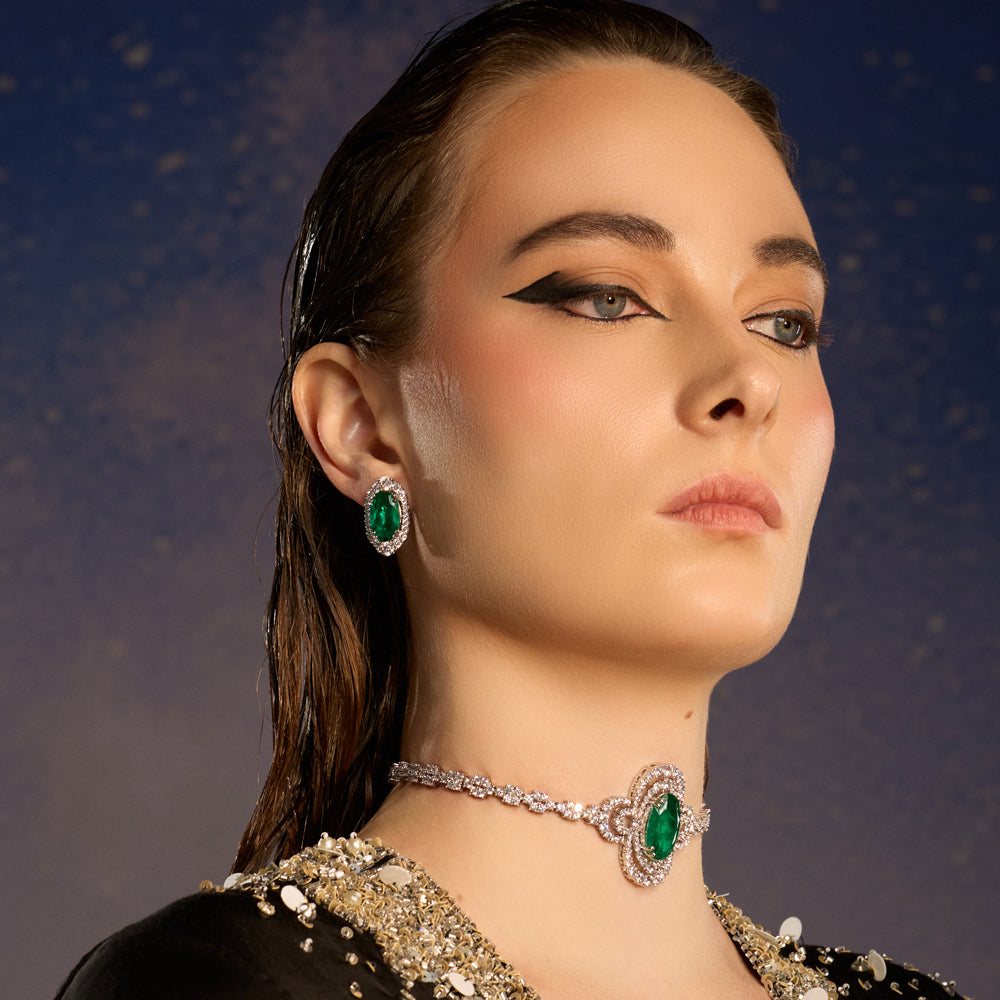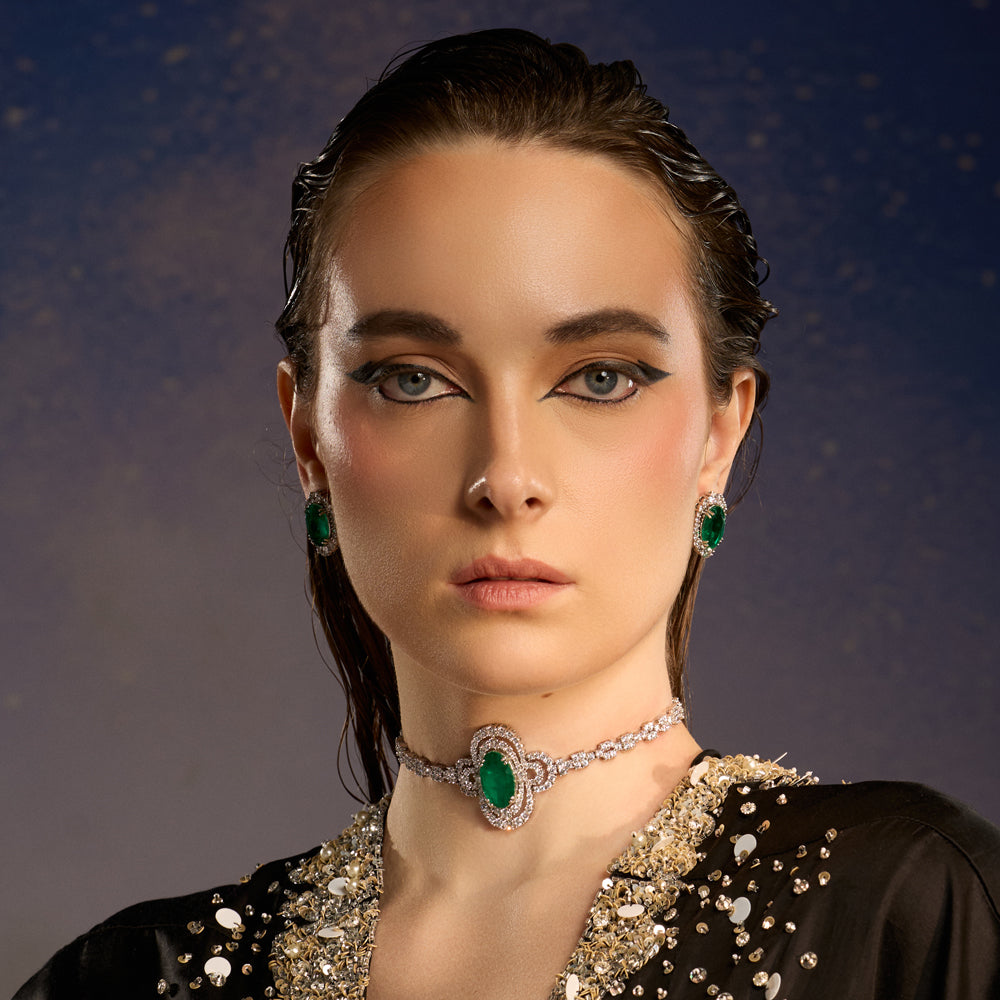 Gracefully sculpted and timeless in design, the Nour Choker Set is a celebration of refined brilliance. A vivid emerald-toned centre stone anchors the choker, encircled by layers of delicately set crystals that radiate luminous depth. The slender, stone-studded band contours the neckline with understated sophistication, allowing the central motif to shine.