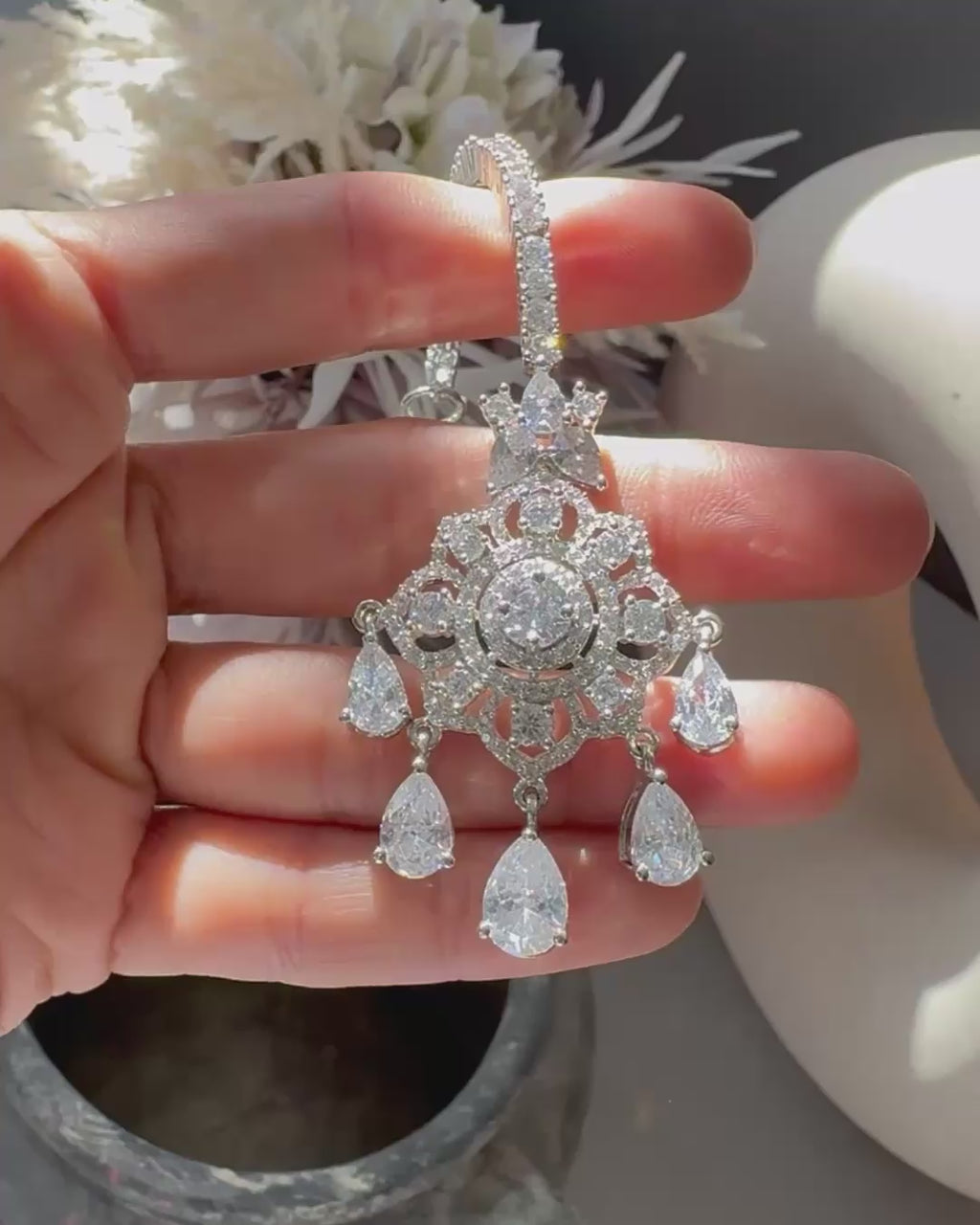 Elevate your look with Faizah, the exquisite American diamond maang tikka. This sparkling accessory adds a touch of elegance and glamour to any outfit.