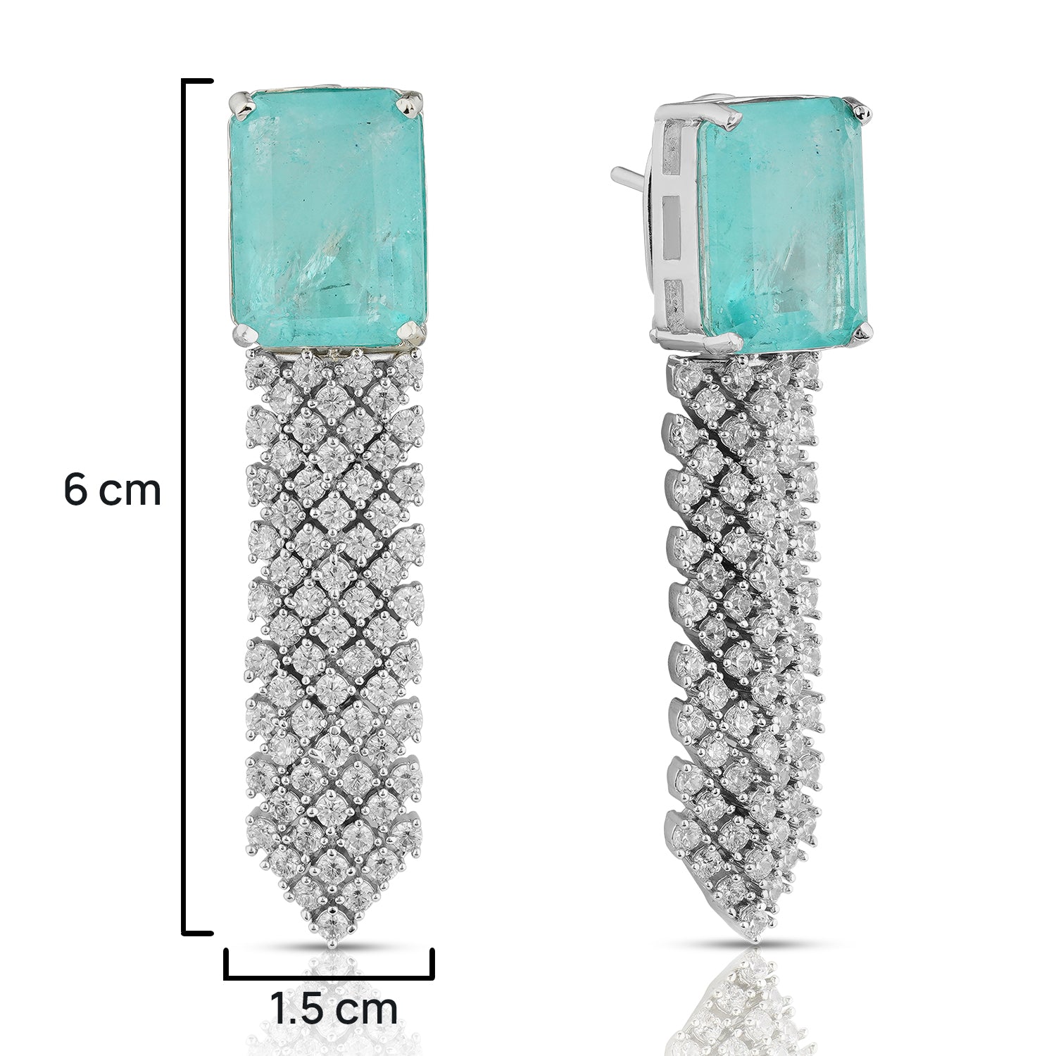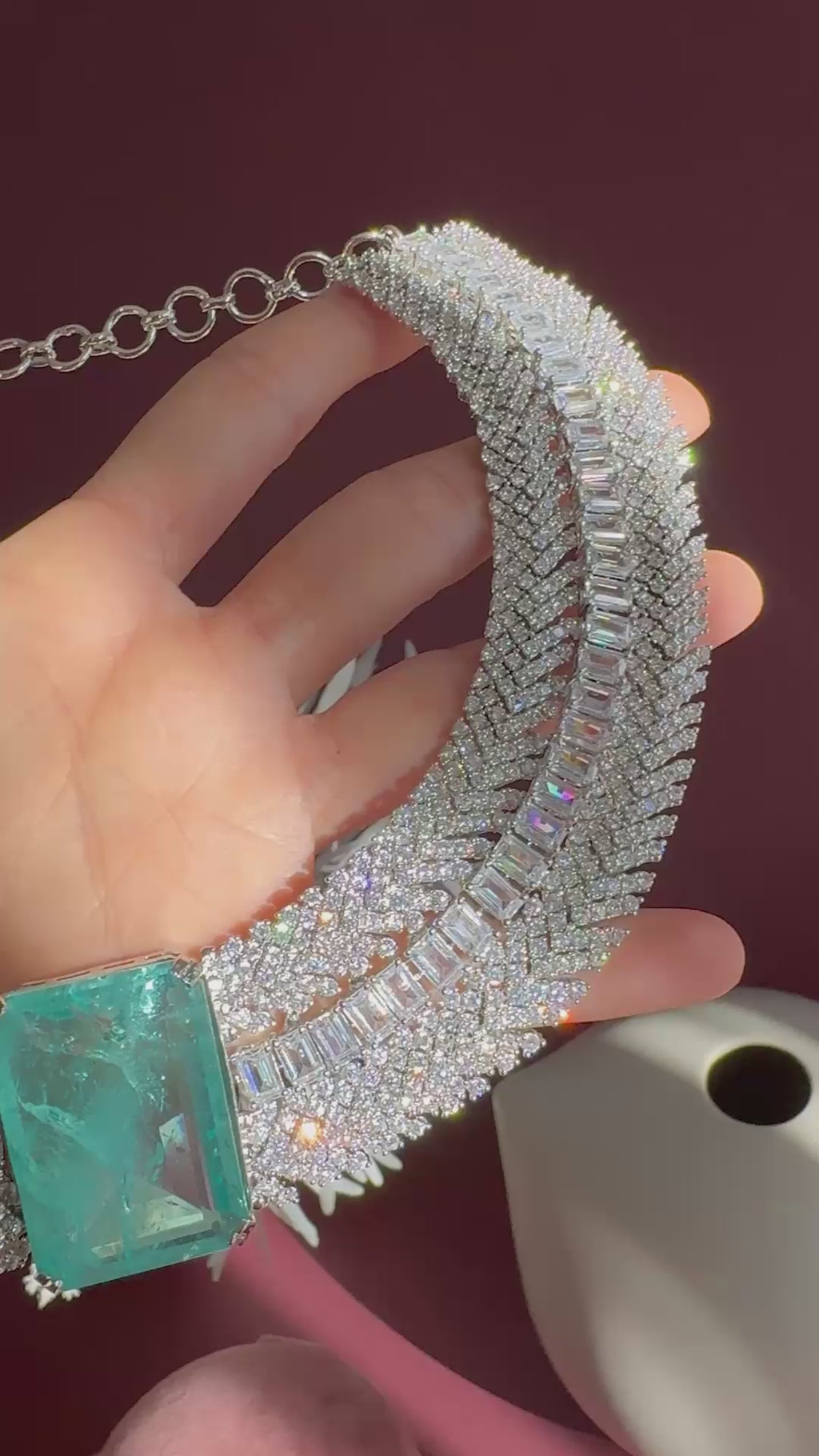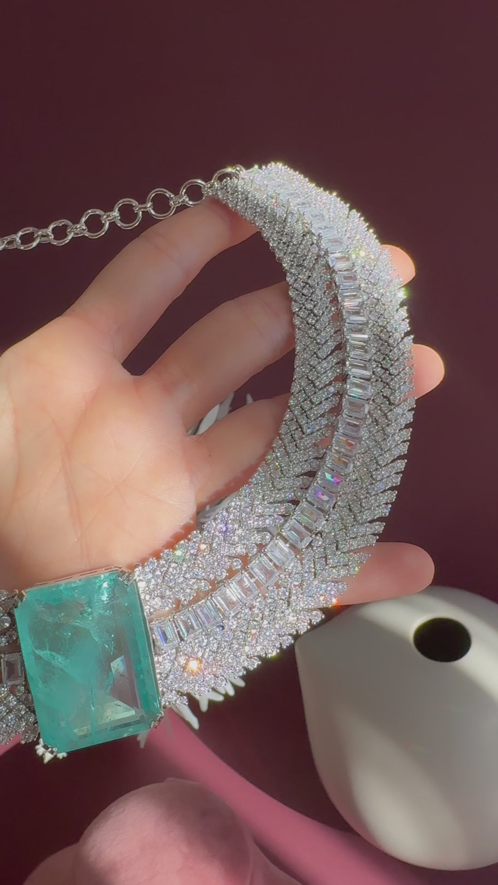 The Freya Necklace Set whispers of ocean tides and celestial skies — a vision carved in light. Its centrepiece, an aqua-hued emerald-cut stone, radiates serenity and strength, capturing the tranquillity of waters kissed by dawn. Encircling it are immaculate rows of baguette and pavé-set CZ stones, woven in patterns reminiscent of armour crafted for queens of old.
