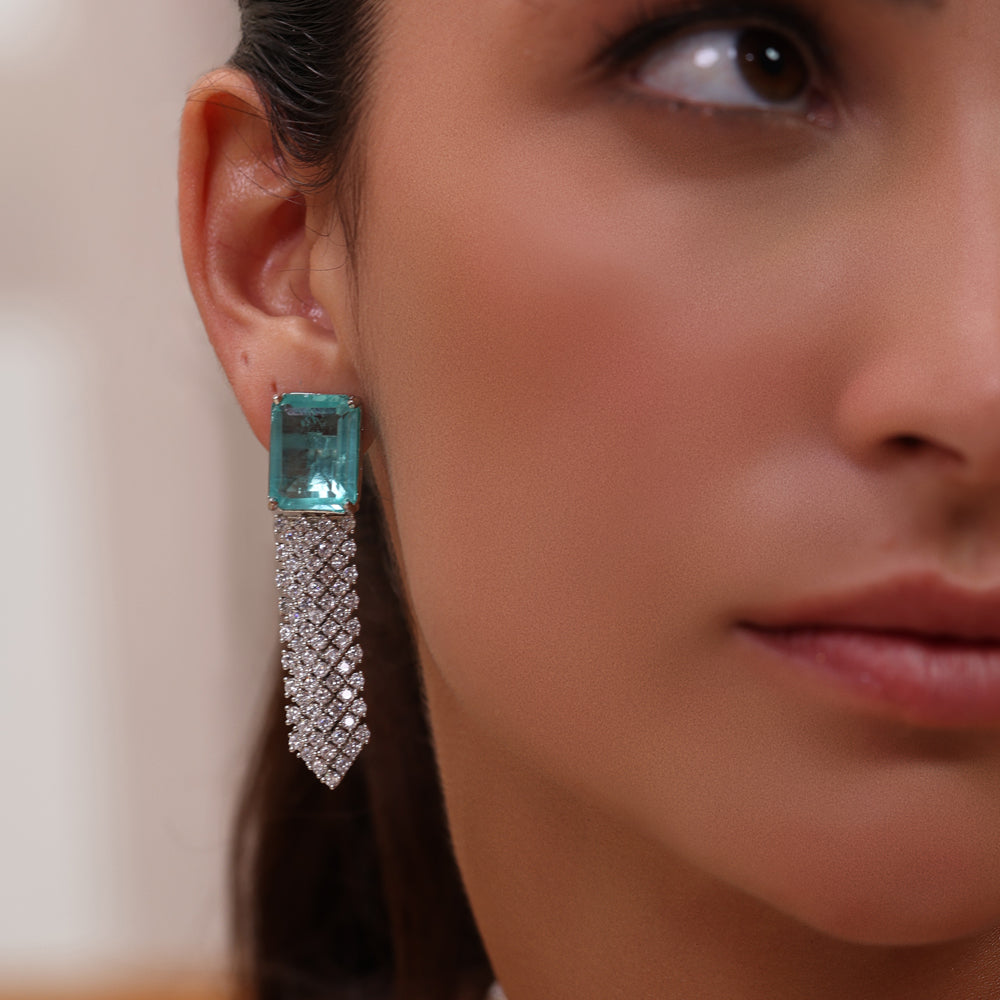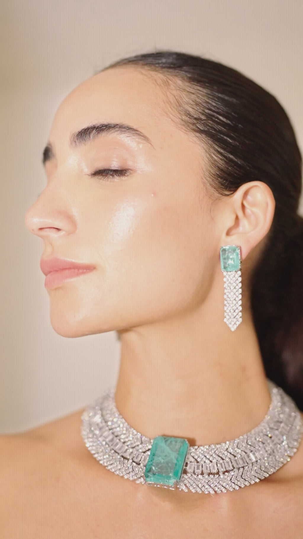 The earrings echo the same luminous narrative, with cascading brilliance that moves like falling starlight. Together, the set is not just jewellery, but a symphony of grace and power — for the woman who carries the calm of the sea and the command of the crown.