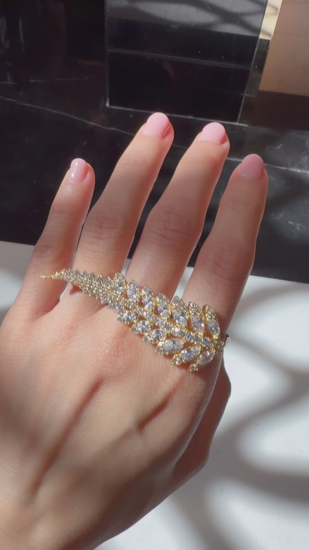 Graceful yet commanding, the Azalia Ring is designed to elongate the hand with effortless sophistication. A sweeping cascade of marquise-cut CZ stones forms a feather-like silhouette, set along a slender band that curves delicately around the finger.