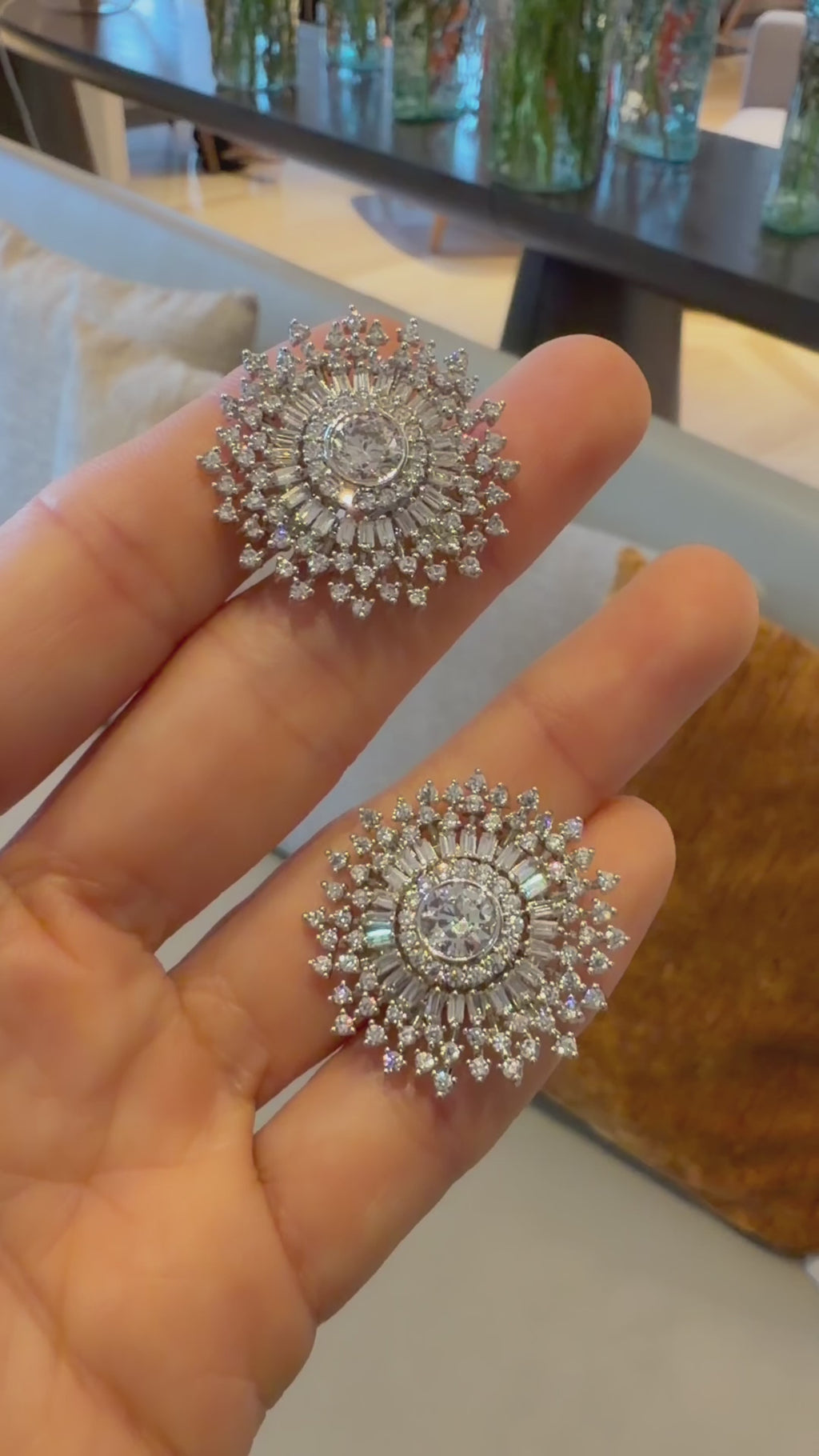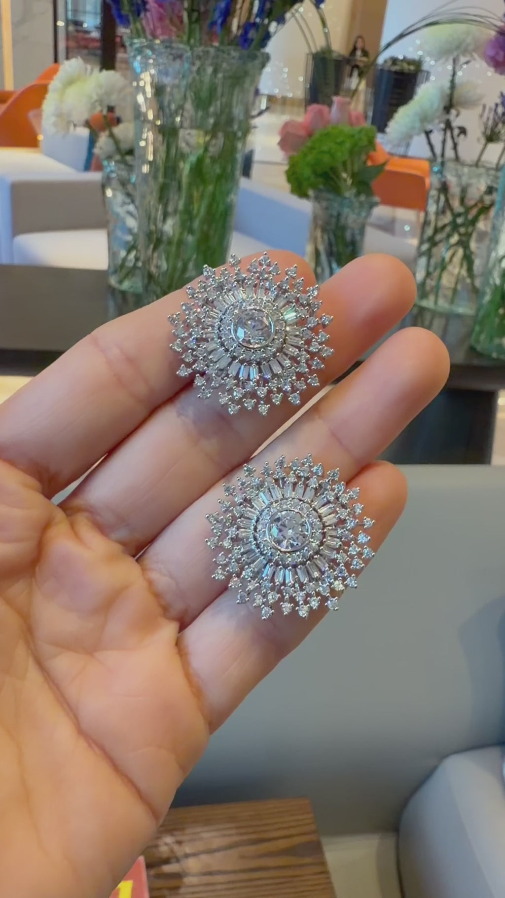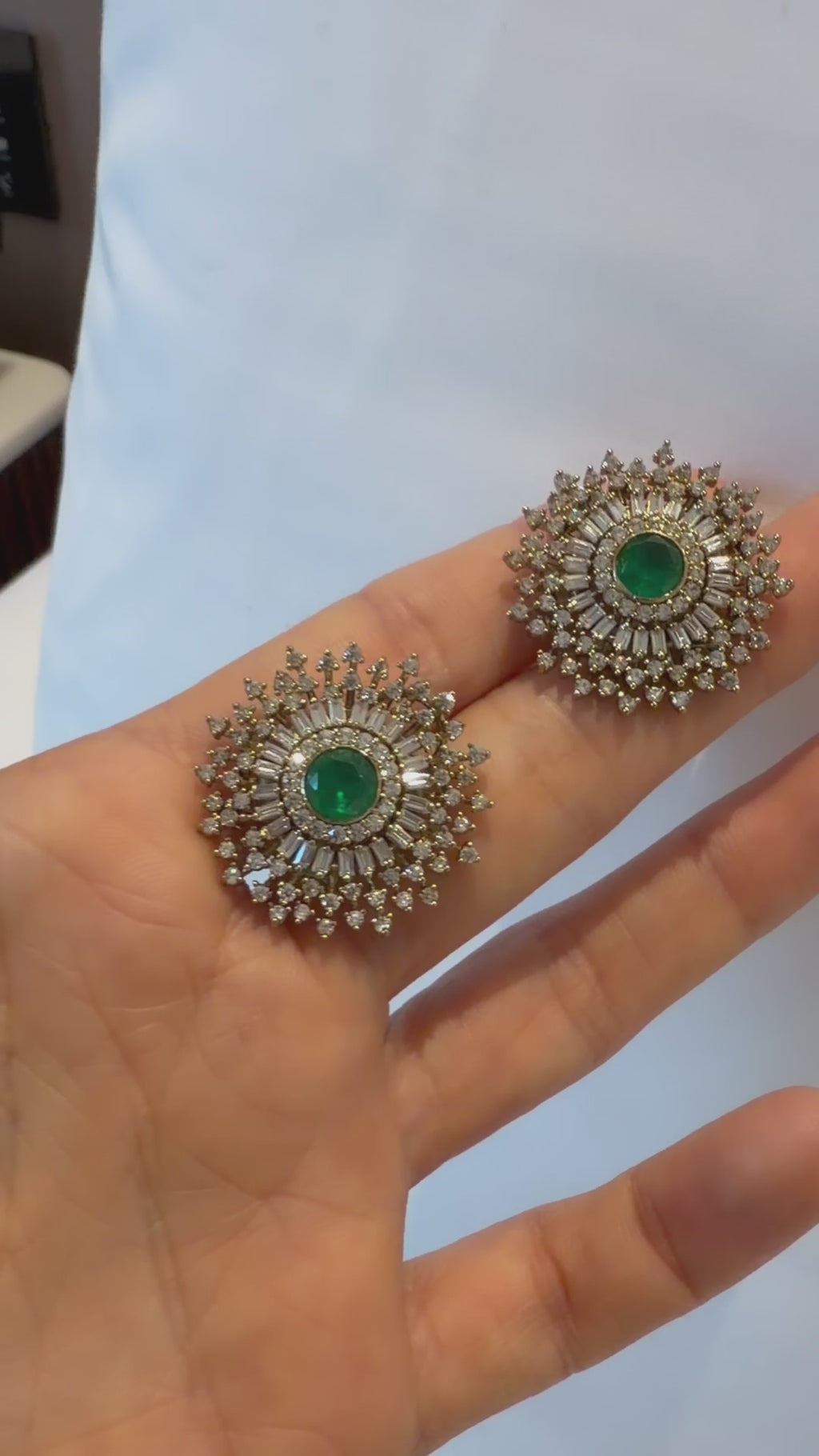 Delicate yet radiant, the Zayra Stud Earrings are inspired by blooming florals and intricate craftsmanship. An emerald-toned centre stone anchors the design, surrounded by finely set crystals arranged in a luminous sunburst pattern. The textured gold setting enhances the brilliance, creating a piece that feels both regal and refined.