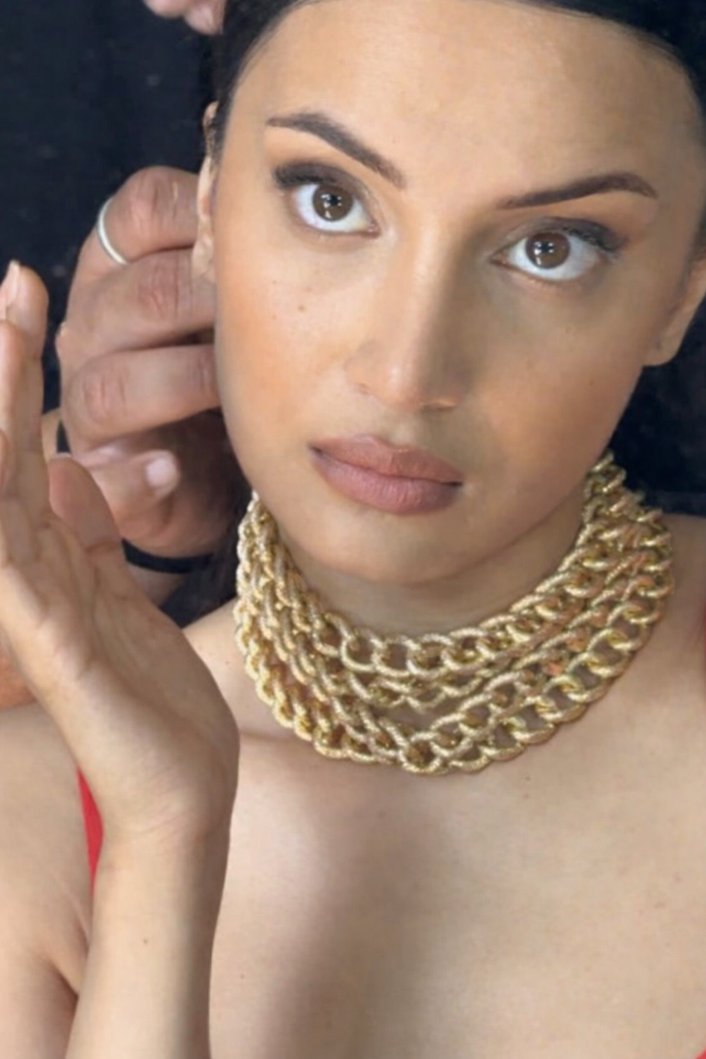 Bold yet timeless, the Roza Chain Necklace redefines statement elegance. Crafted with sculptural precision, it features interlinked textured chains that cascade fluidly around the neckline—creating a look that is both powerful and refined.