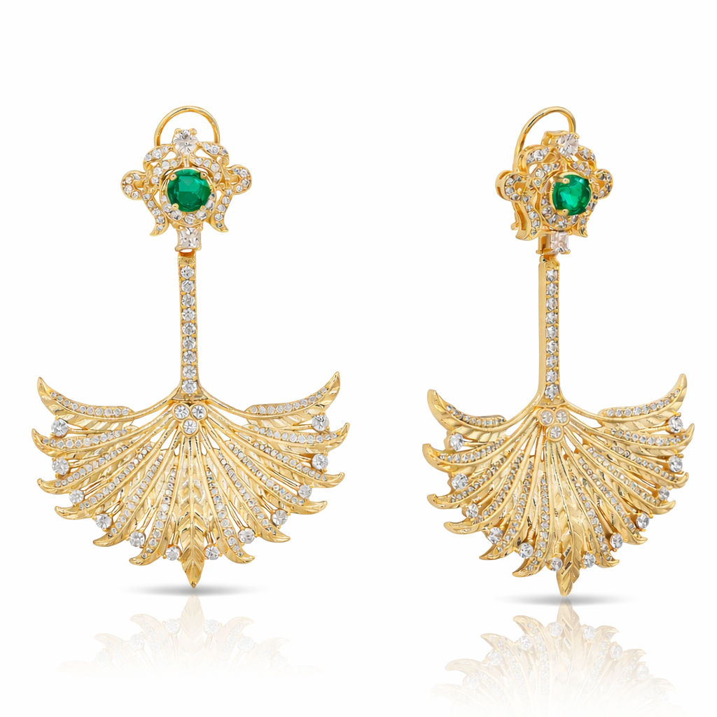 Featuring a vibrant emerald-hued center framed in delicate brilliance, the design flows into a fan-shaped cascade of finely detailed goldwork and shimmering stones.