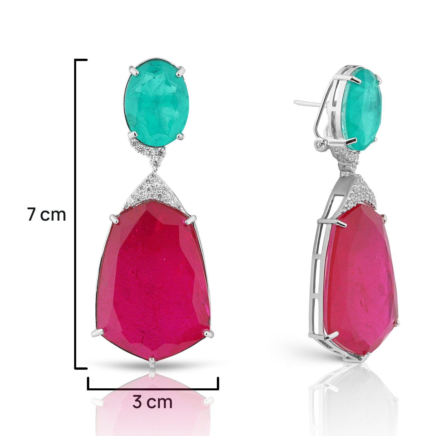 The Ava Dangle Earrings are a bold play of contrast and color. An oval aqua-hued stone crowns the design, flowing into a striking ruby-toned drop, with a shimmer of CZ stones adding subtle brilliance in between. The faceted cuts catch the light with every move, creating a look that is both dramatic and effortlessly refined.