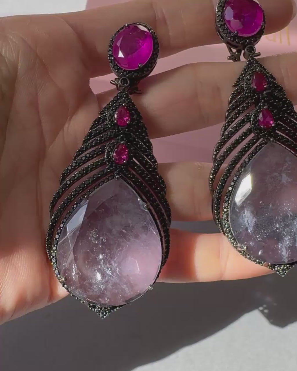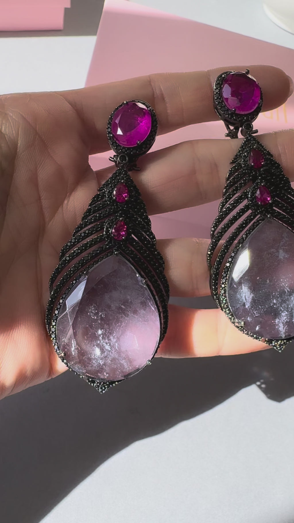MATERIAL: Black Rhodium plated metal alloy, Pink doublet, AAA CZ. Doublet stones often have natural cracks and imperfections, which are typical characteristics and not considered defects.
