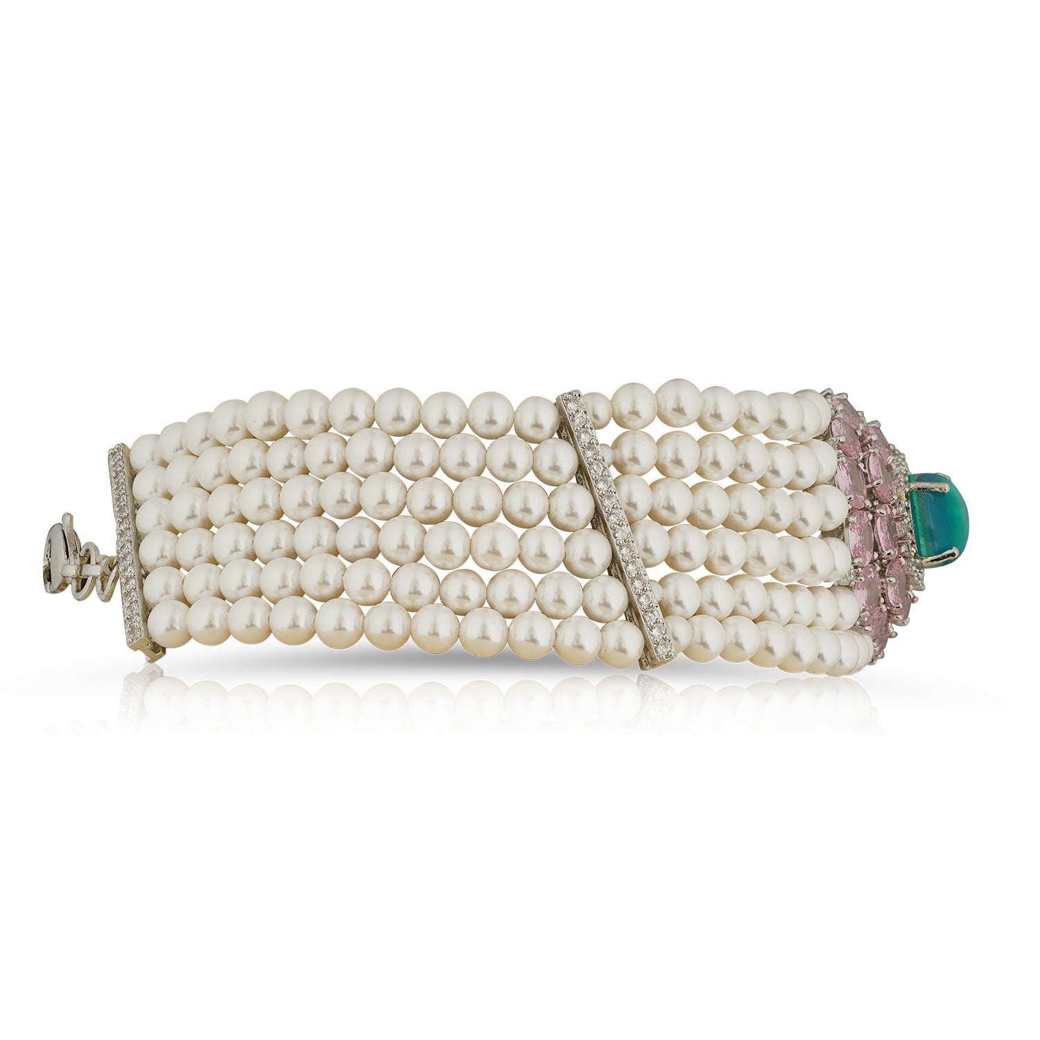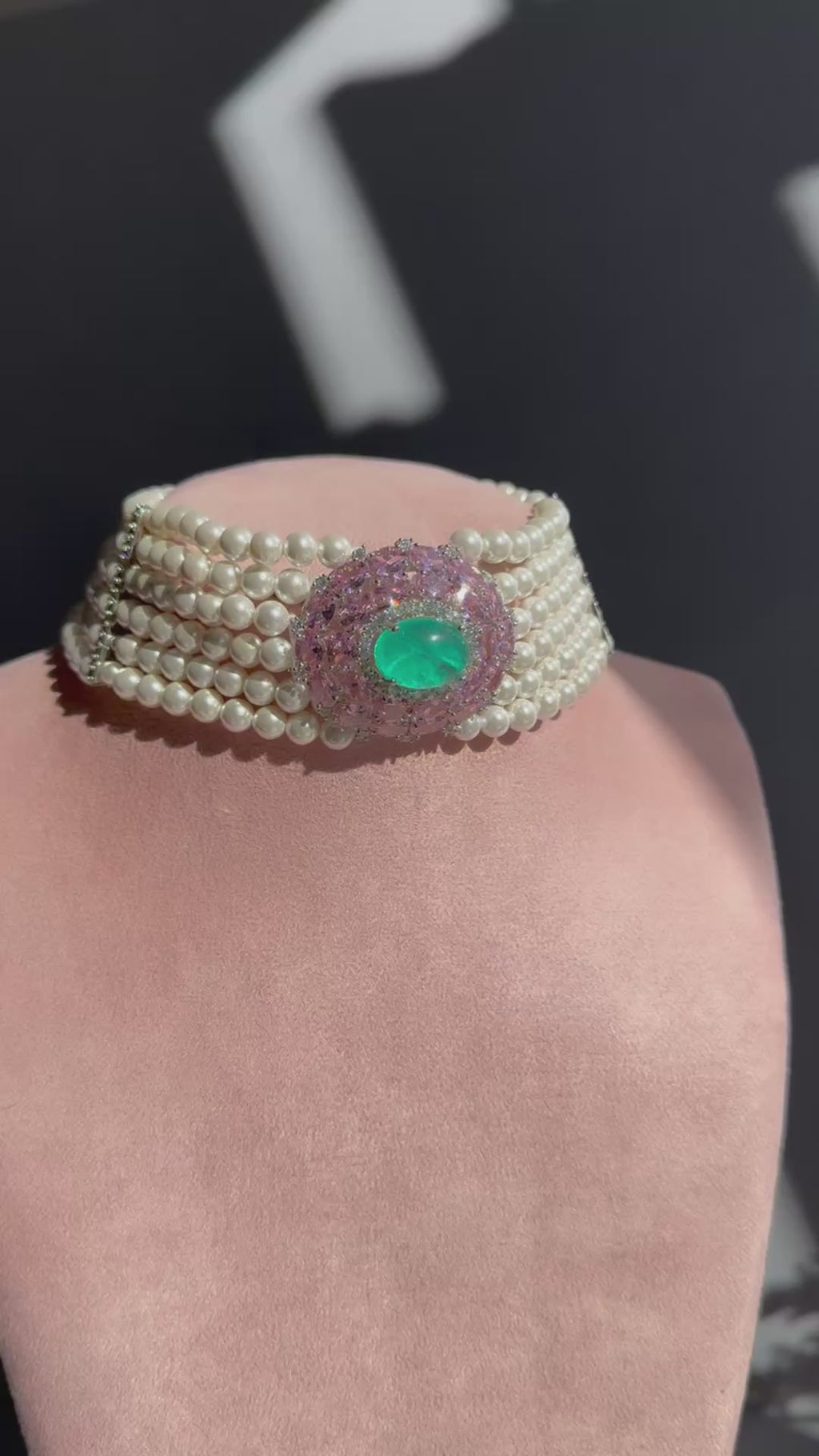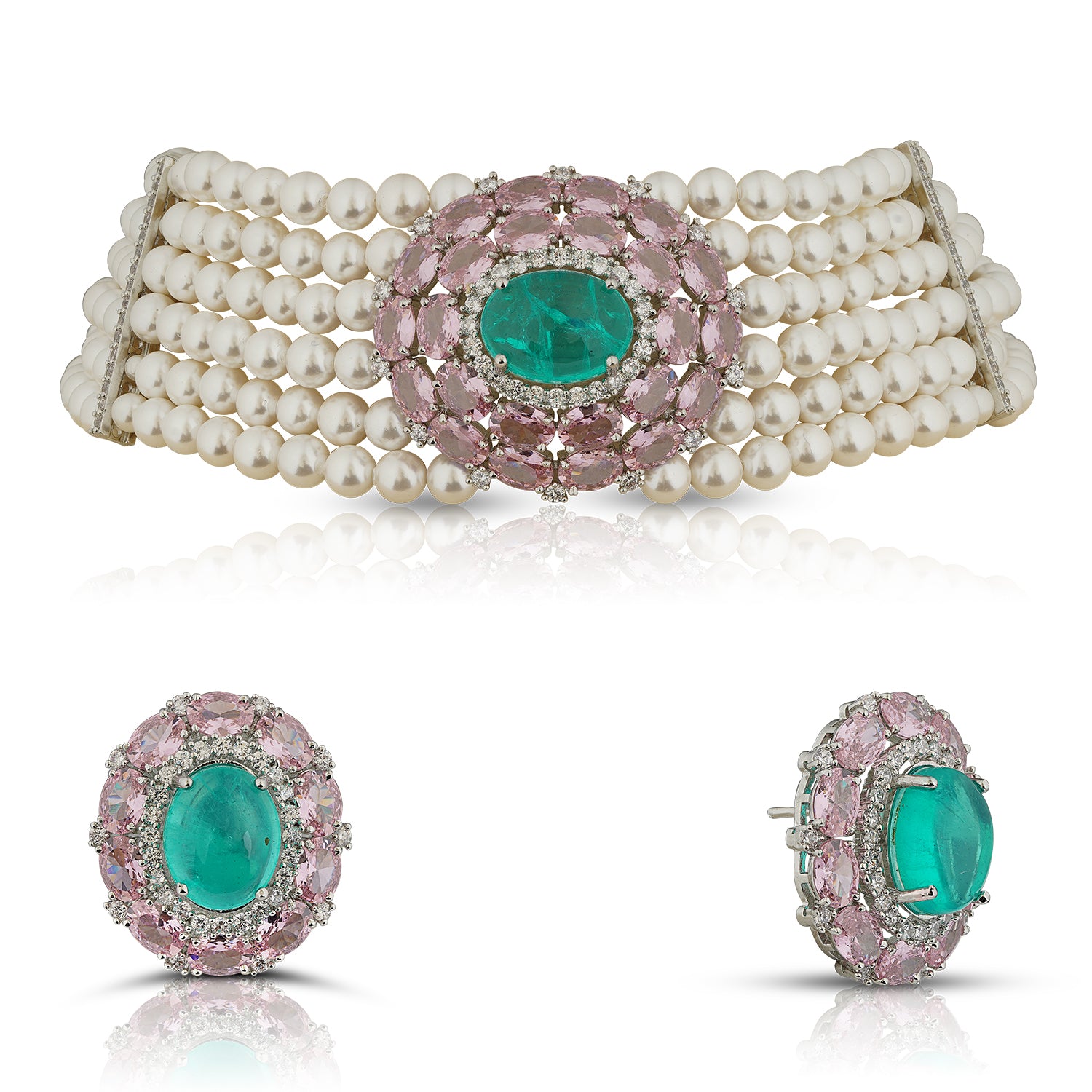 The Adelina Choker Set captures timeless elegance with a touch of regality. A multi-strand arrangement of lustrous pearls forms the foundation, while the center piece dazzles with an oval green stone framed by a halo of delicate blush-pink gems and shimmering CZ accents.