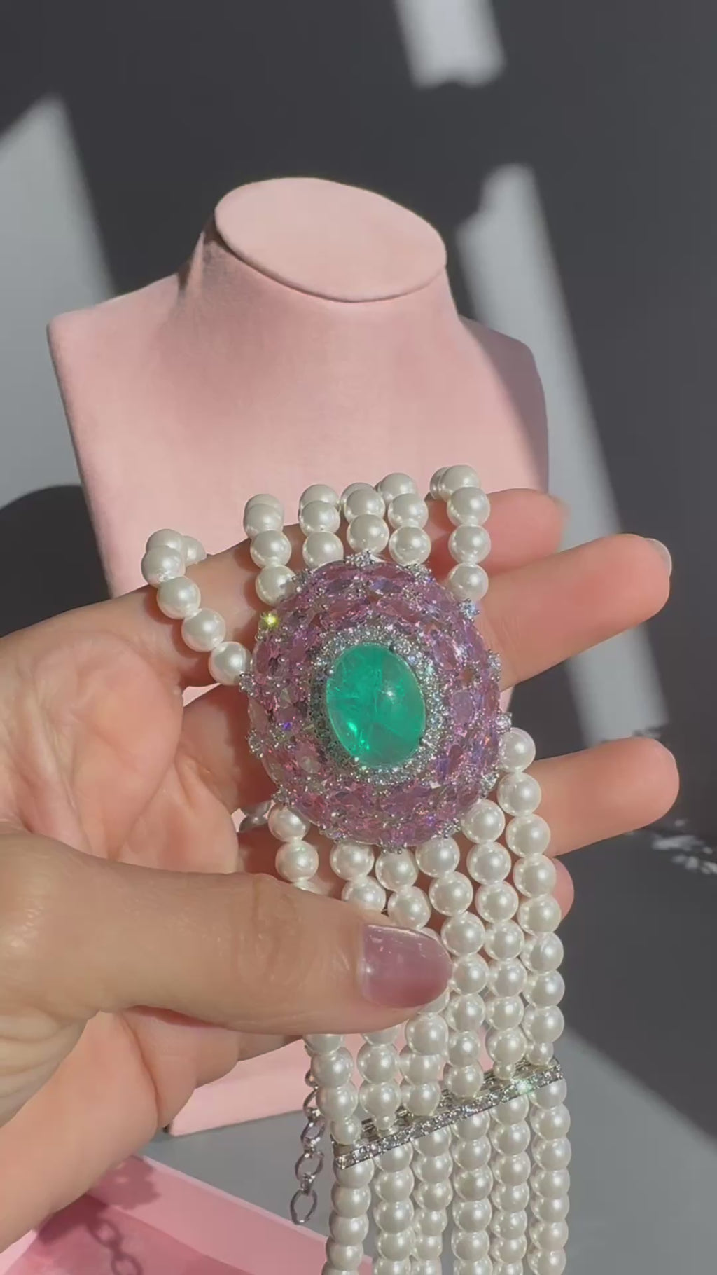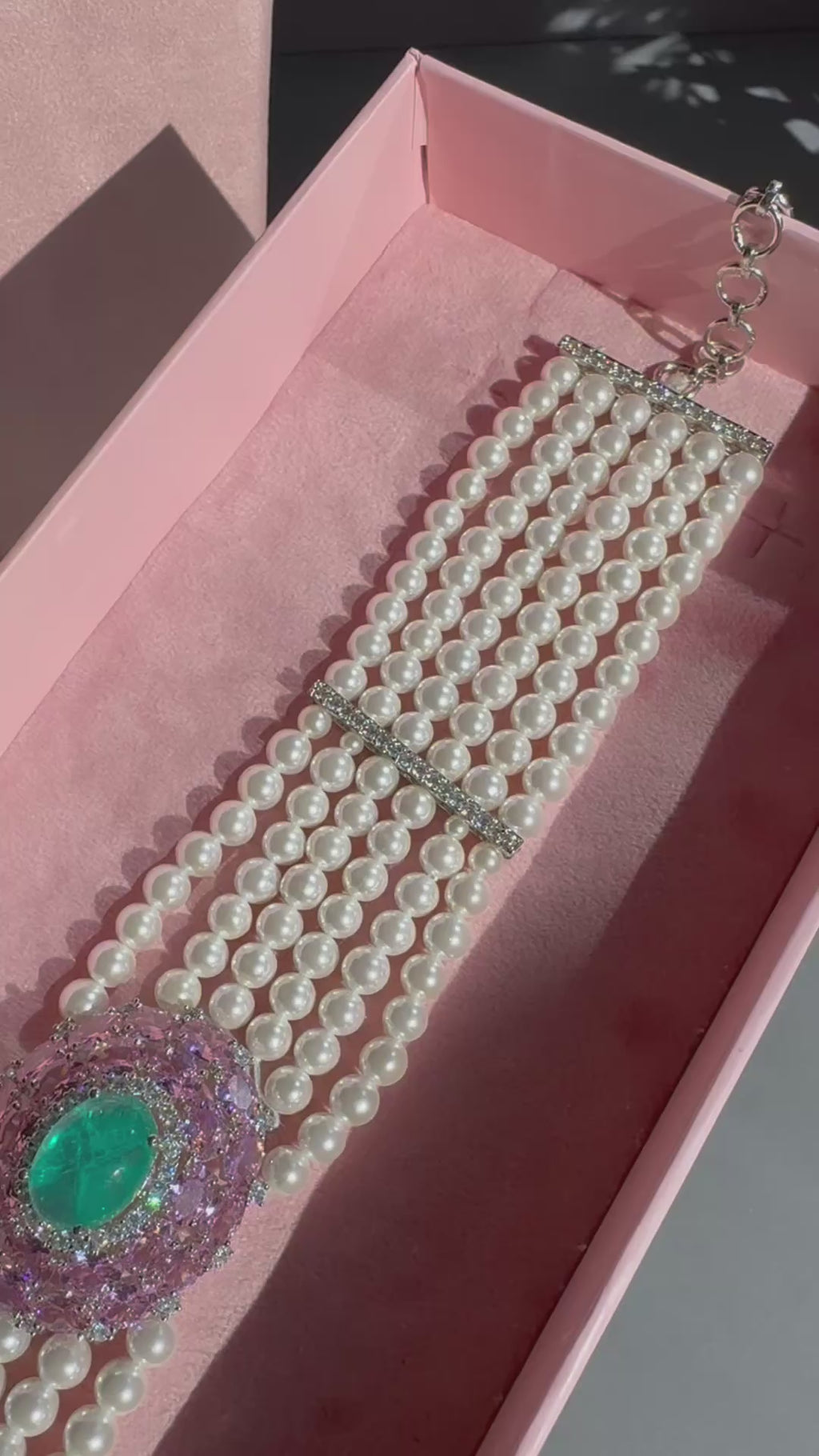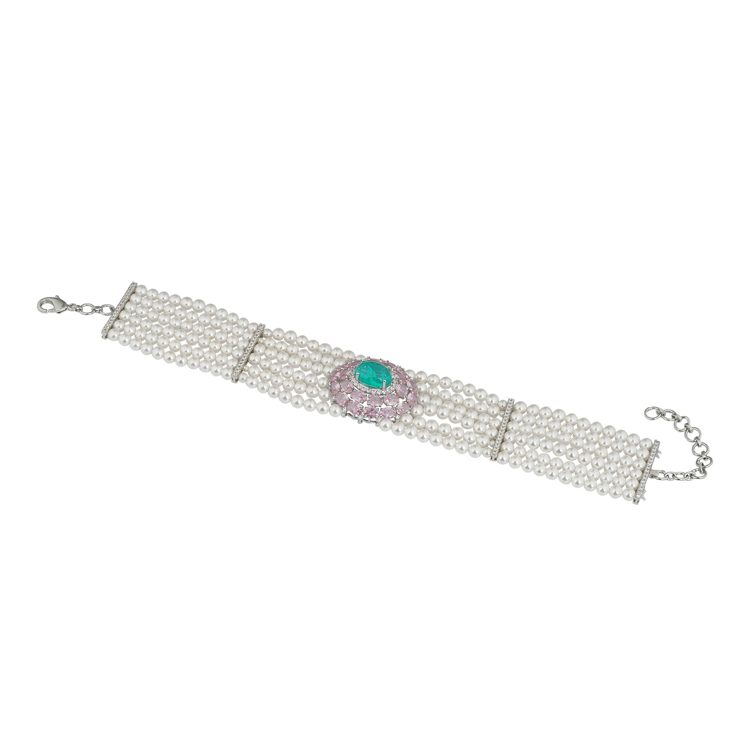 The Adelina Choker Set captures timeless elegance with a touch of regality. A multi-strand arrangement of lustrous pearls forms the foundation, while the center piece dazzles with an oval green stone framed by a halo of delicate blush-pink gems and shimmering CZ accents.