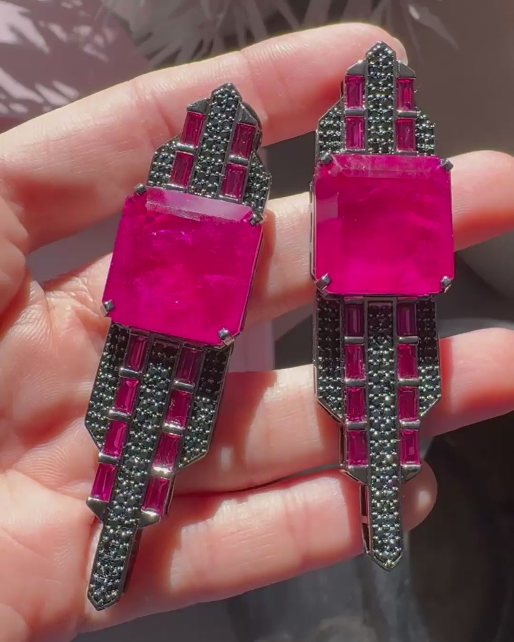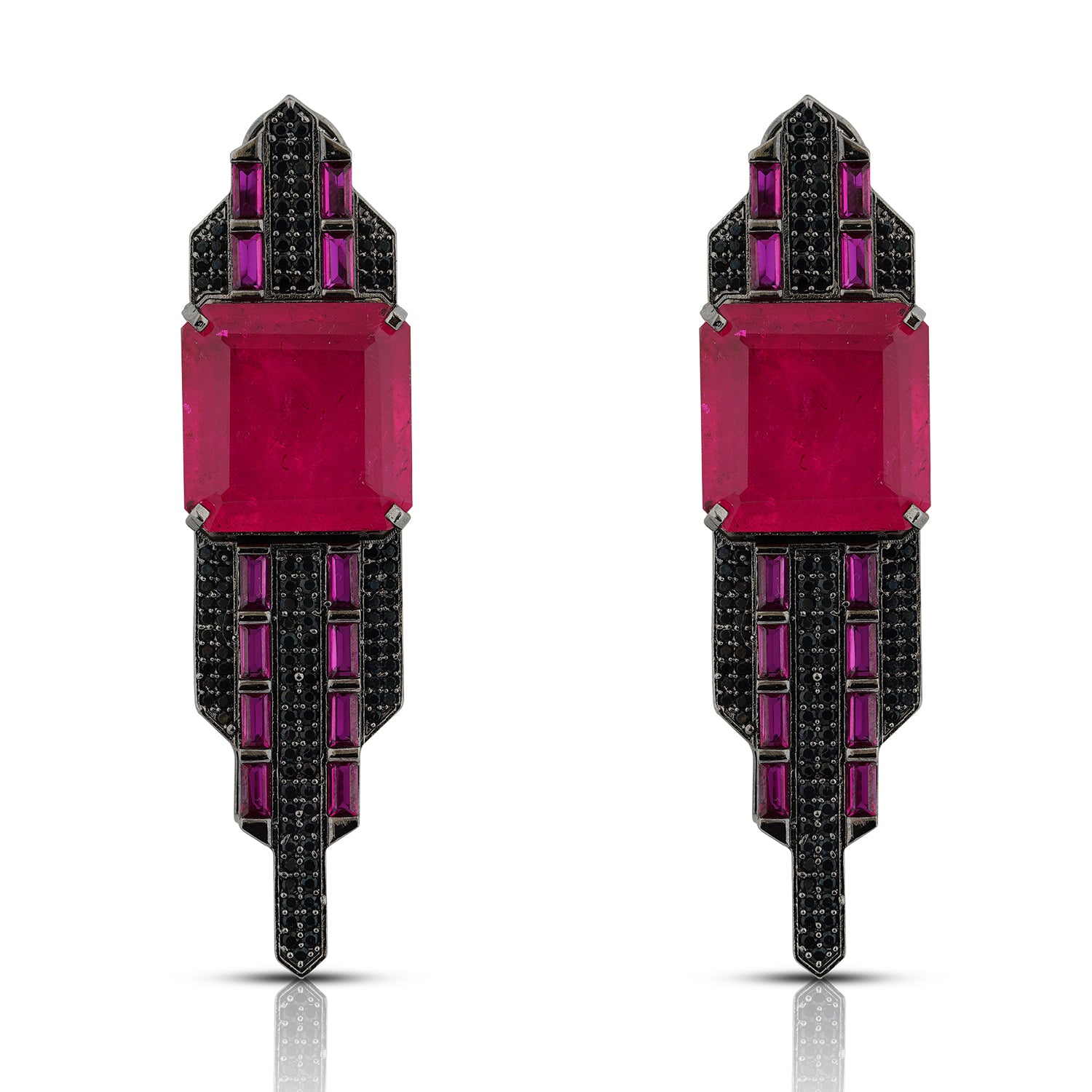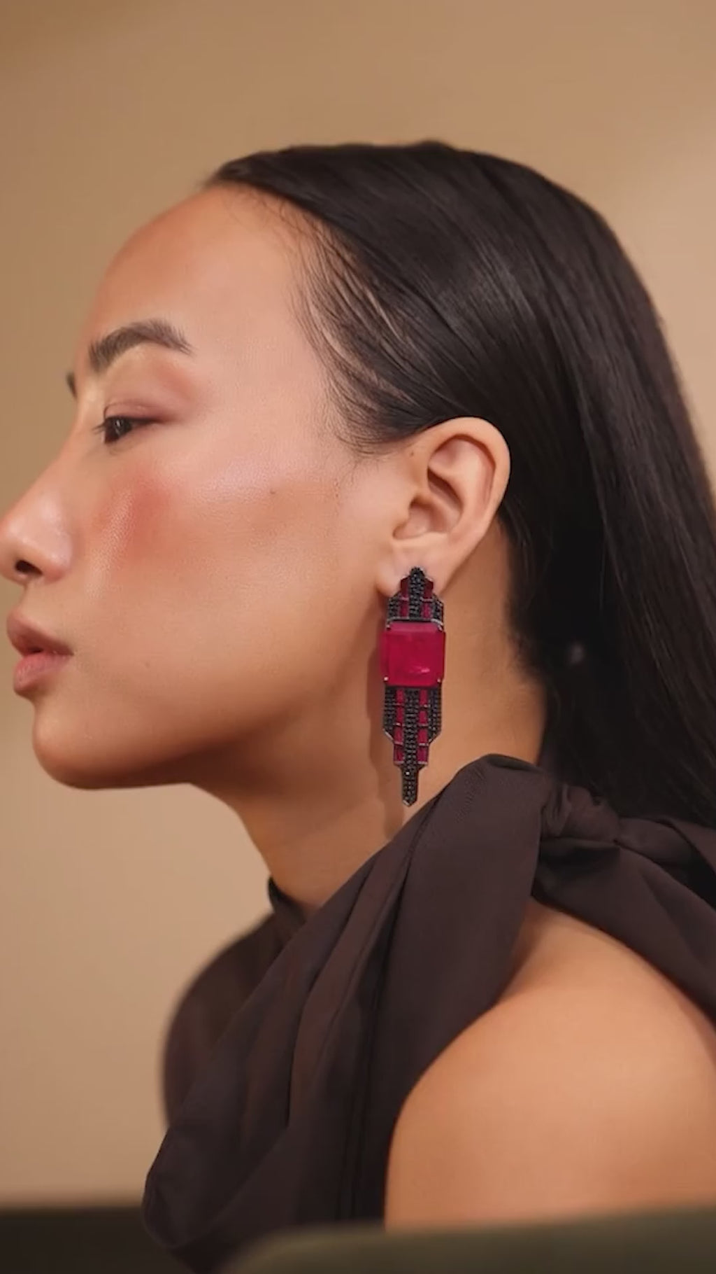 Bold and architectural, the Alice Drop Earrings are an ode to Art Deco drama. A striking ruby-hued centrepiece commands attention, framed by sharp lines of baguette cuts and CZ detailing in deep noir. Their silhouette evokes the skyline of a modern city — powerful, elegant, and endlessly alluring.