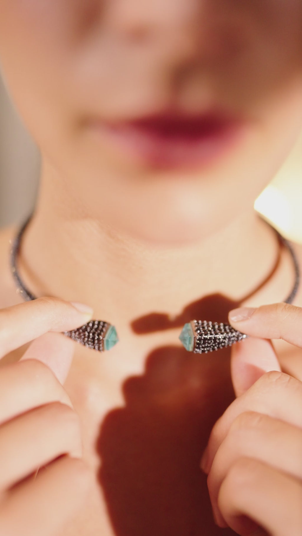 The Astrid Choker is a study in contrasts — midnight-black pavé CZ set against aqua pyramid-cut stones that gleam with a quiet, otherworldly light. Each edge is deliberate, each angle sculpted, evoking strength and modernity, yet softened by the shimmer that dances across its surface.