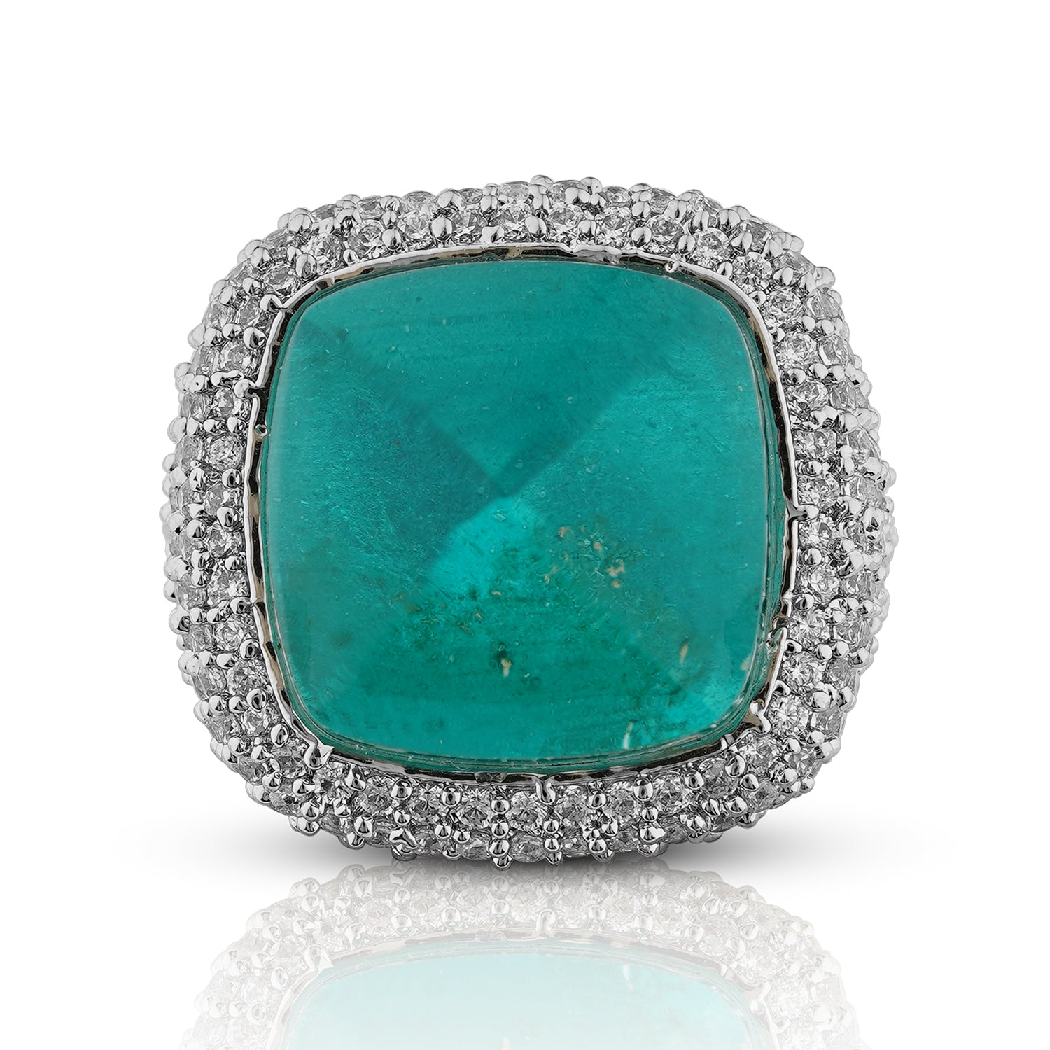 The Caroline Ring in emerald green is a celebration of bold beauty. At its center, a cushion-cut emerald-hued stone radiates richness and depth, framed by a halo of shimmering CZ stones and set on a pavé-encrusted band that sparkles from every angle.