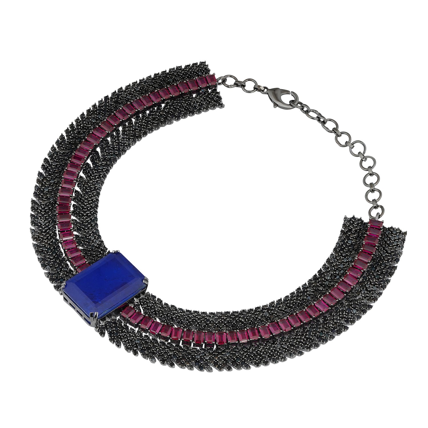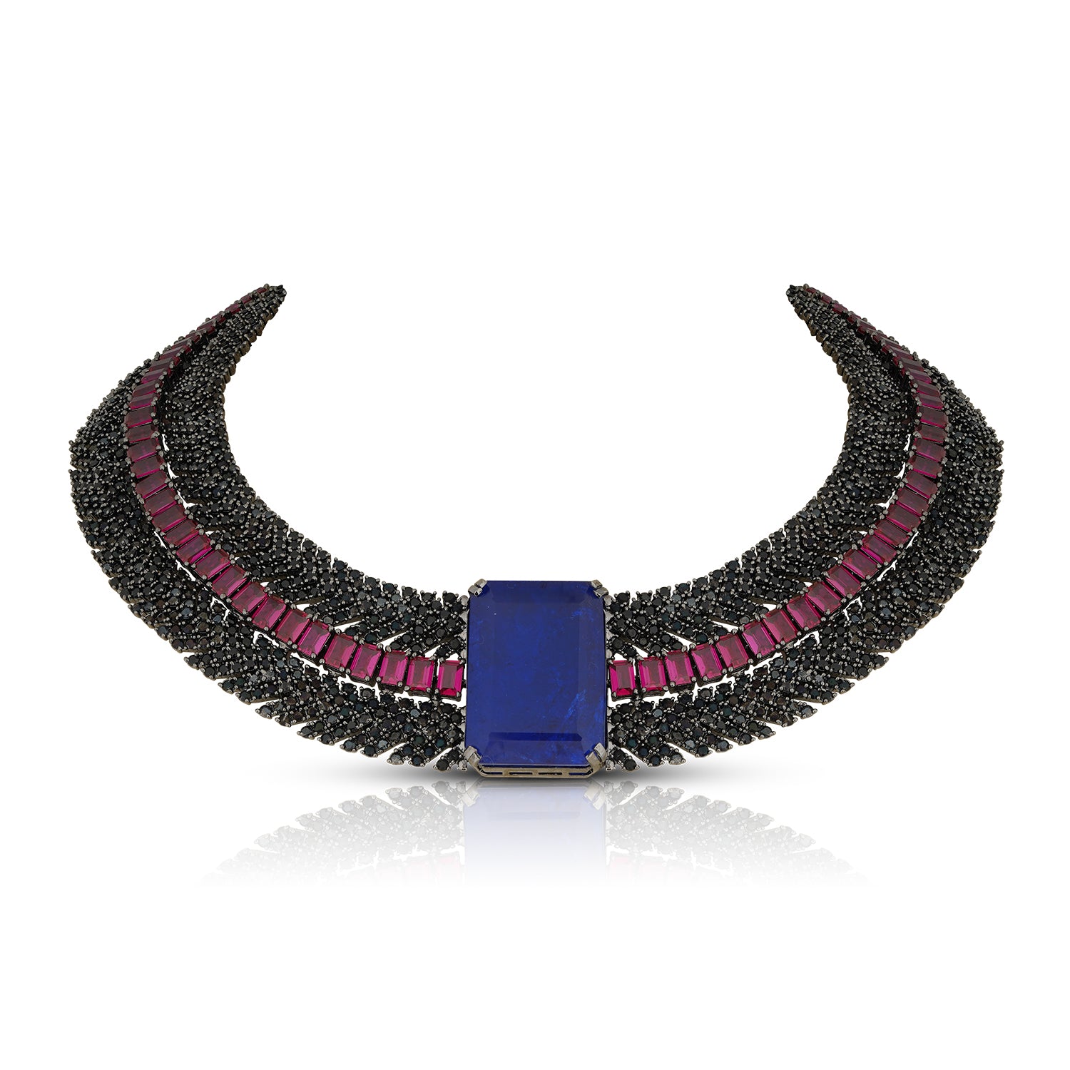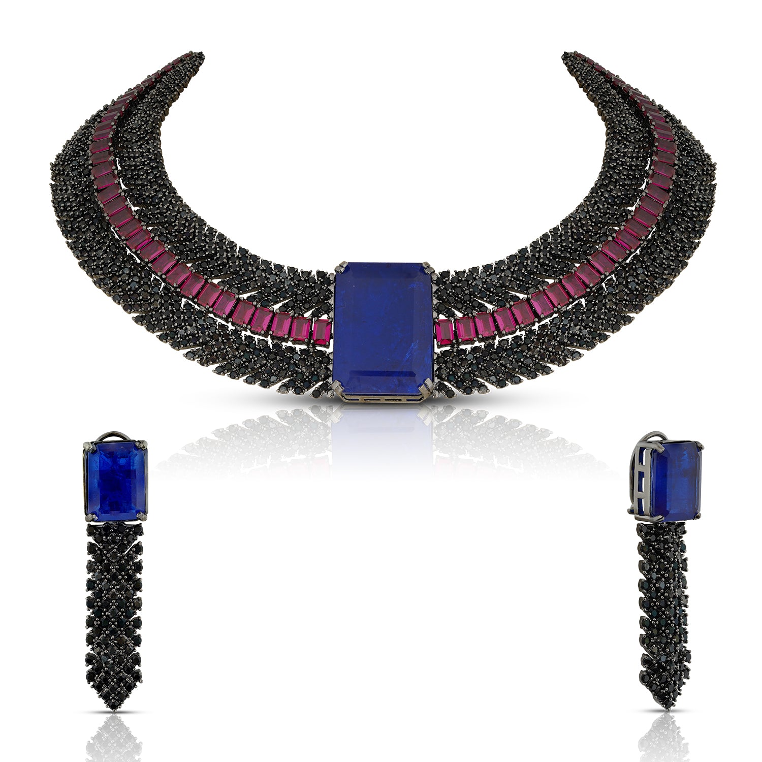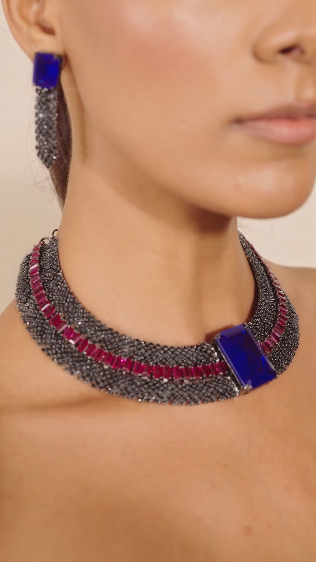 The Freya Necklace is a vision of power and allure, crafted for the woman who embodies bold elegance. At its heart, an emerald-cut sapphire-blue stone radiates with depth and mystery, framed by rows of fiery rubies and shimmering black CZ stones that evoke the night sky ablaze with stars.