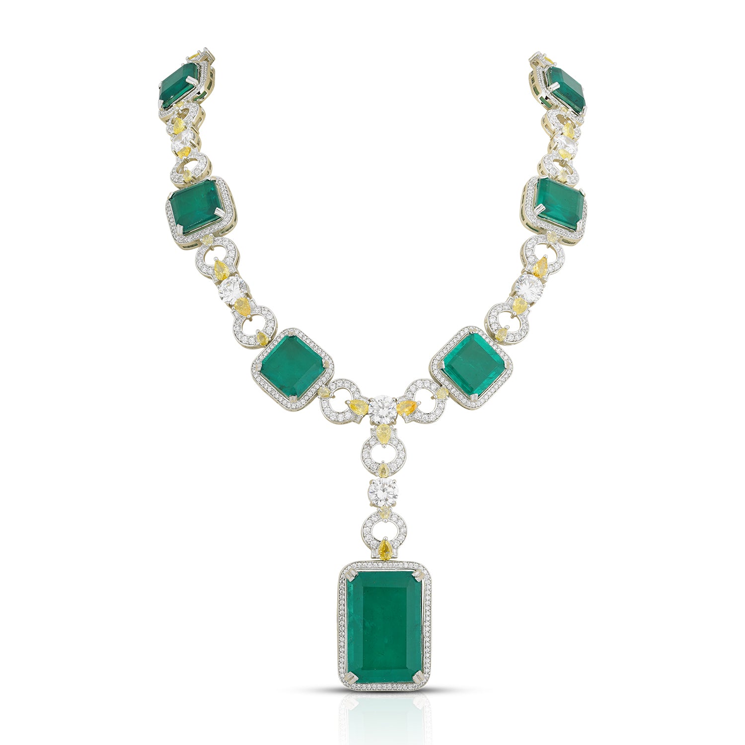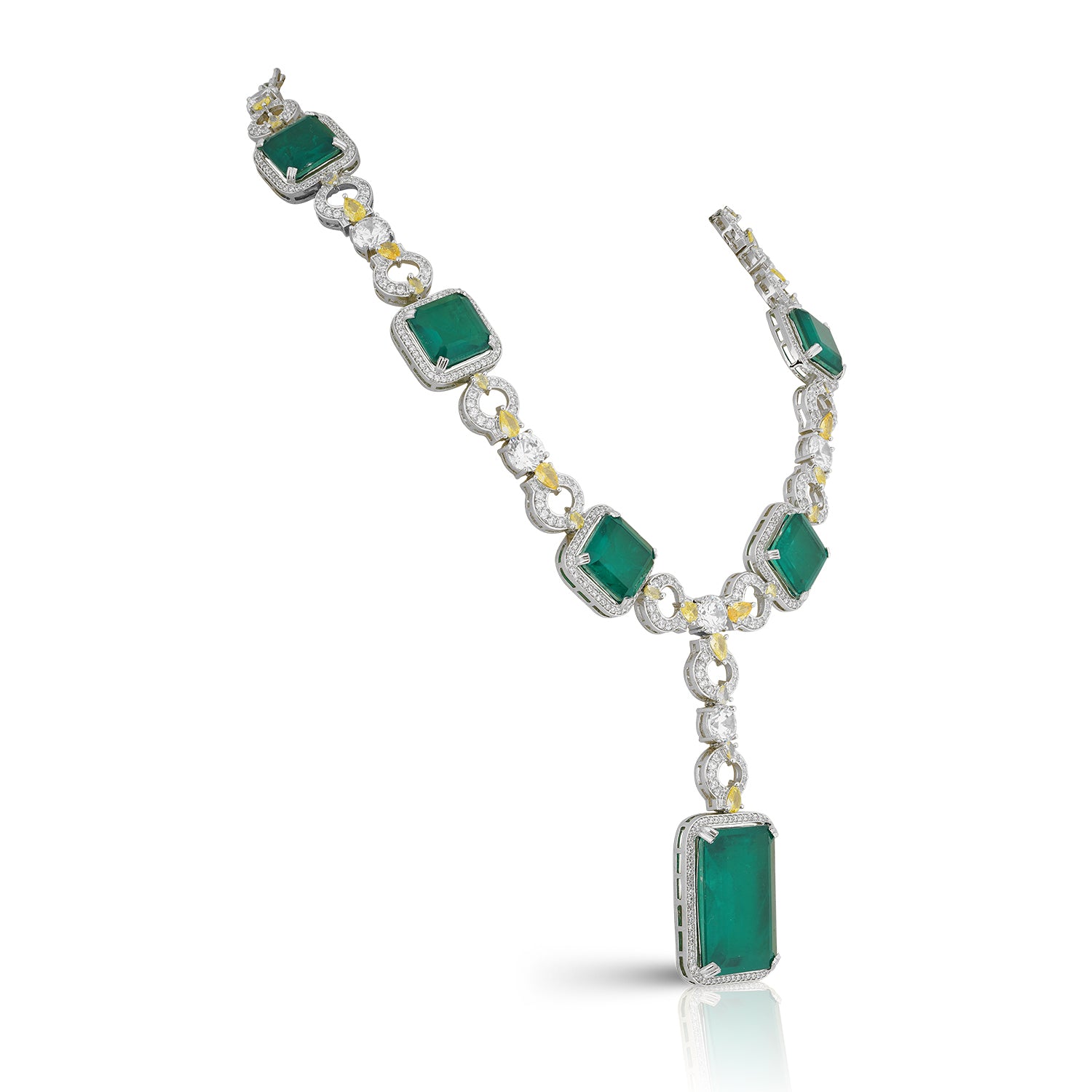 Golden accents weave warmth into the design, echoing the glow of sunlit palaces, while diamond-studded links add rhythm and radiance. At its heart rests a majestic emerald drop, commanding attention with quiet power.