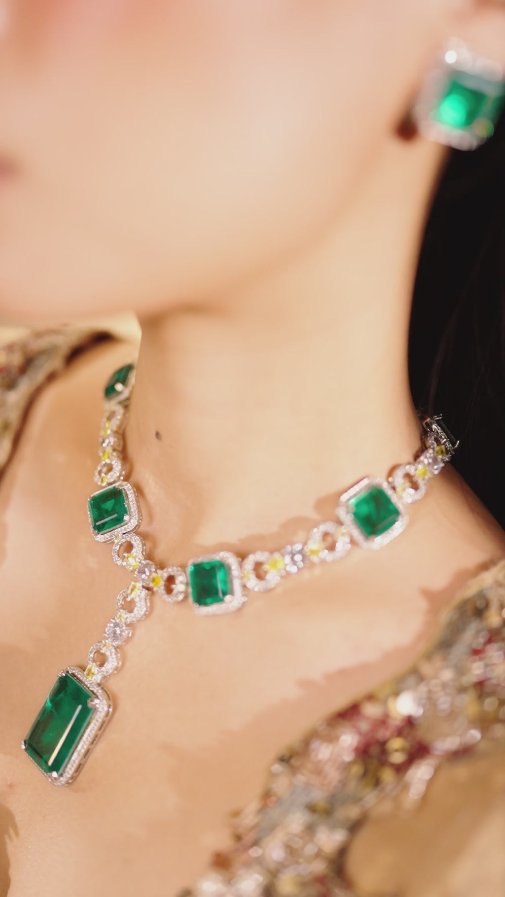 The Ingrid Necklace Set is an ode to timeless regality — where emeralds gleam like treasures unearthed from ancient kingdoms. Each square-cut stone, framed in a halo of brilliance, speaks of heritage and heirloom, carried forward through generations.