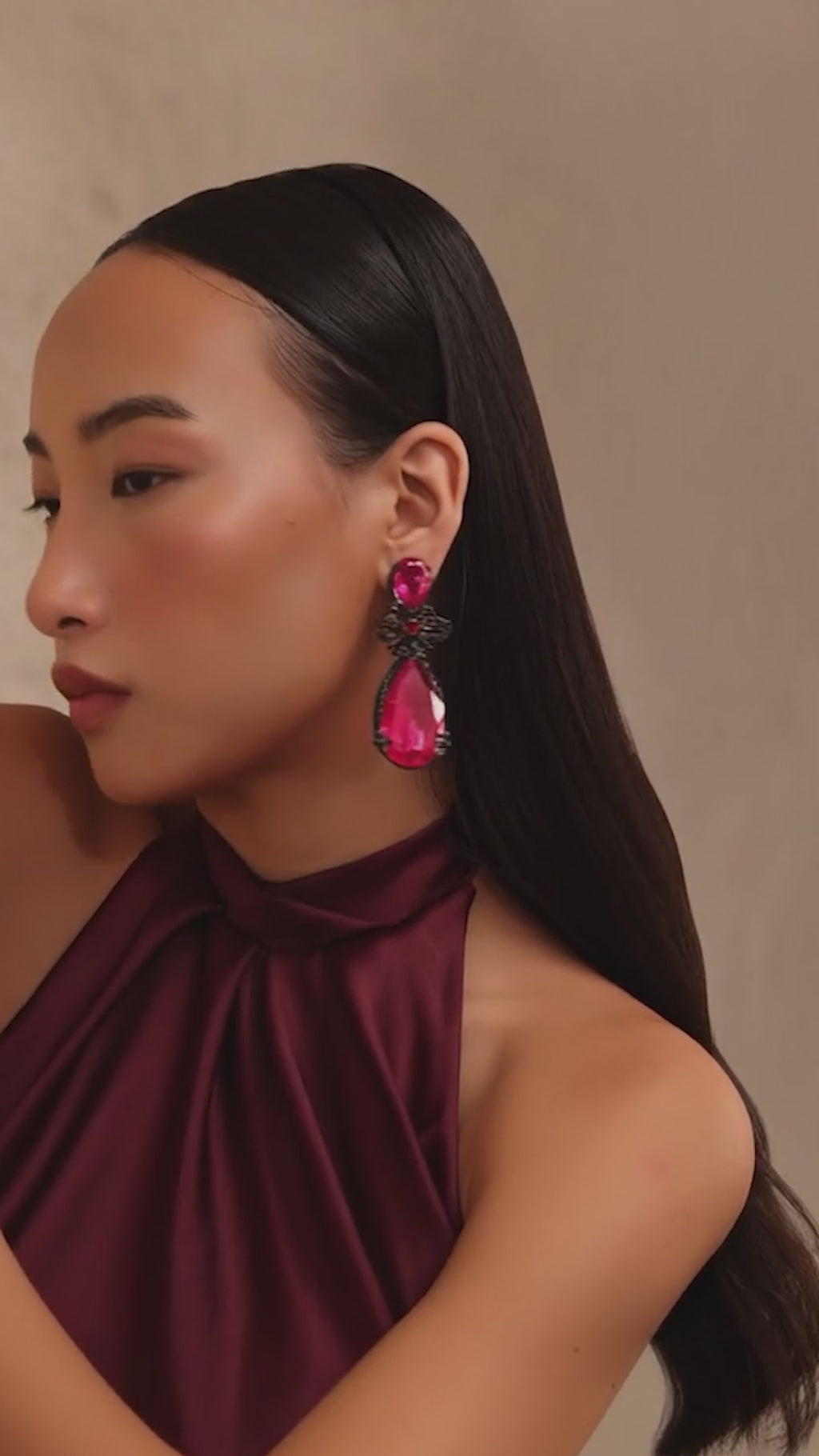 The Ivy Dangle Earrings are a striking blend of romance and regality. Designed with an opulent teardrop silhouette in deep crimson, each earring is adorned with a delicate bow motif, encrusted with dark accents that heighten its drama.