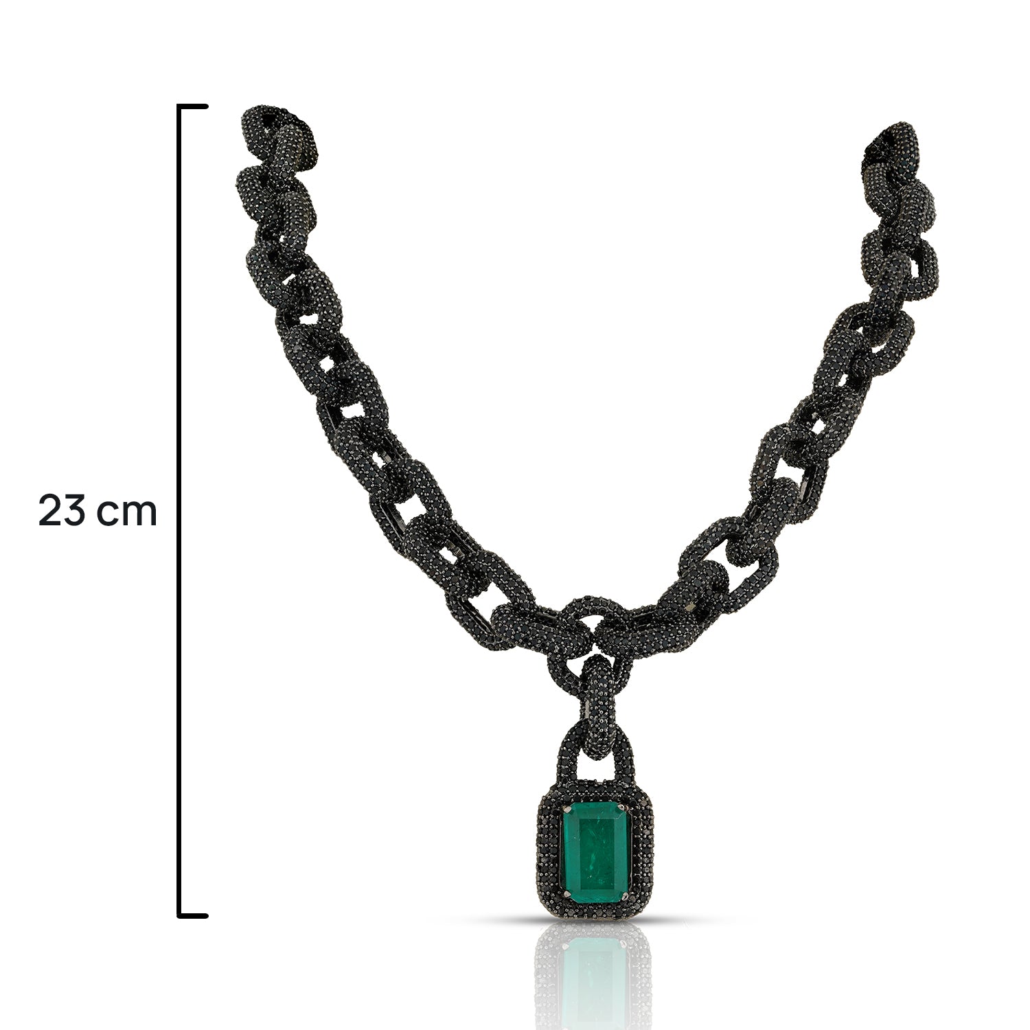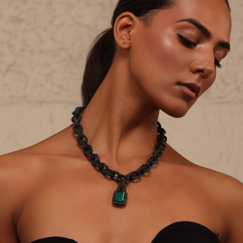 The Karina Necklace is bold poetry cast in shimmering links. Dark, crystal-encrusted chains form a sculptural rhythm, anchoring a striking emerald-hued stone at its heart. Fierce yet refined, it embodies the power of contrast—mystery entwined with brilliance, strength softened by elegance.