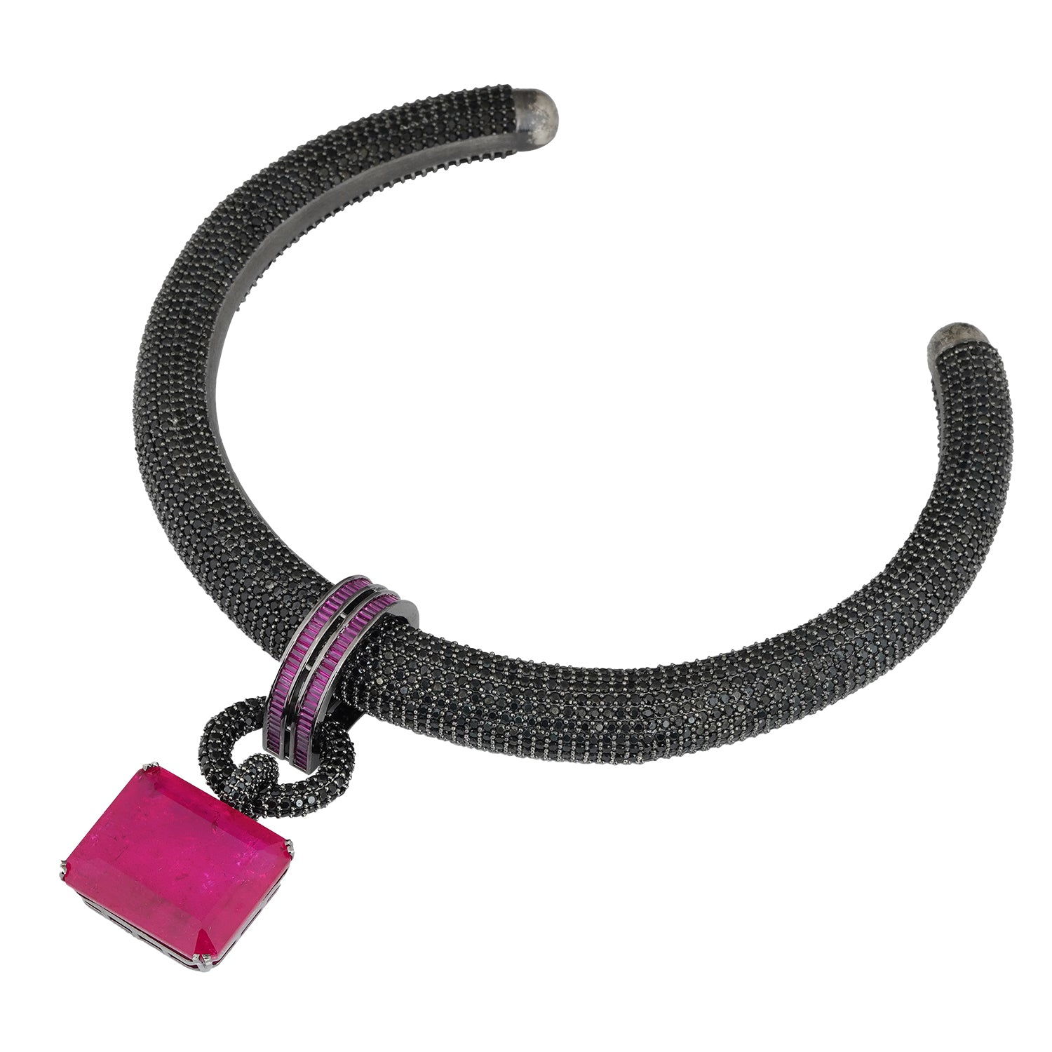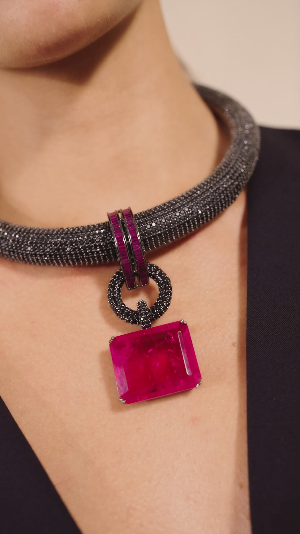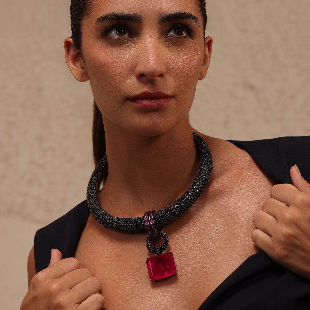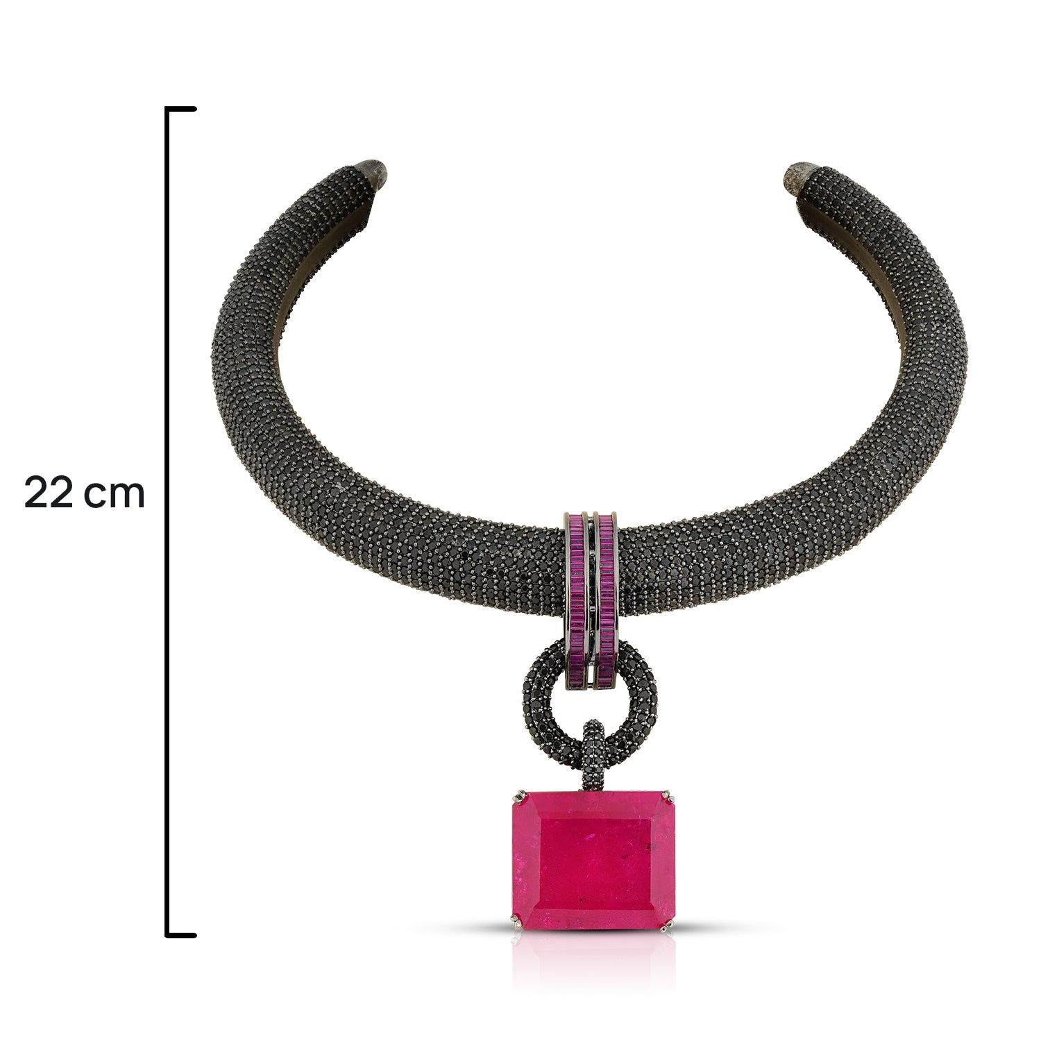 A striking embodiment of bold glamour, the Madelyn Necklace is crafted with a dark CZ collar that exudes an edgy sophistication. At its center hangs a vivid square-cut ruby-hued stone, suspended by sleek circular links adorned with deep magenta baguettes. Designed for the fearless woman, this necklace is a perfect balance of strength and allure.