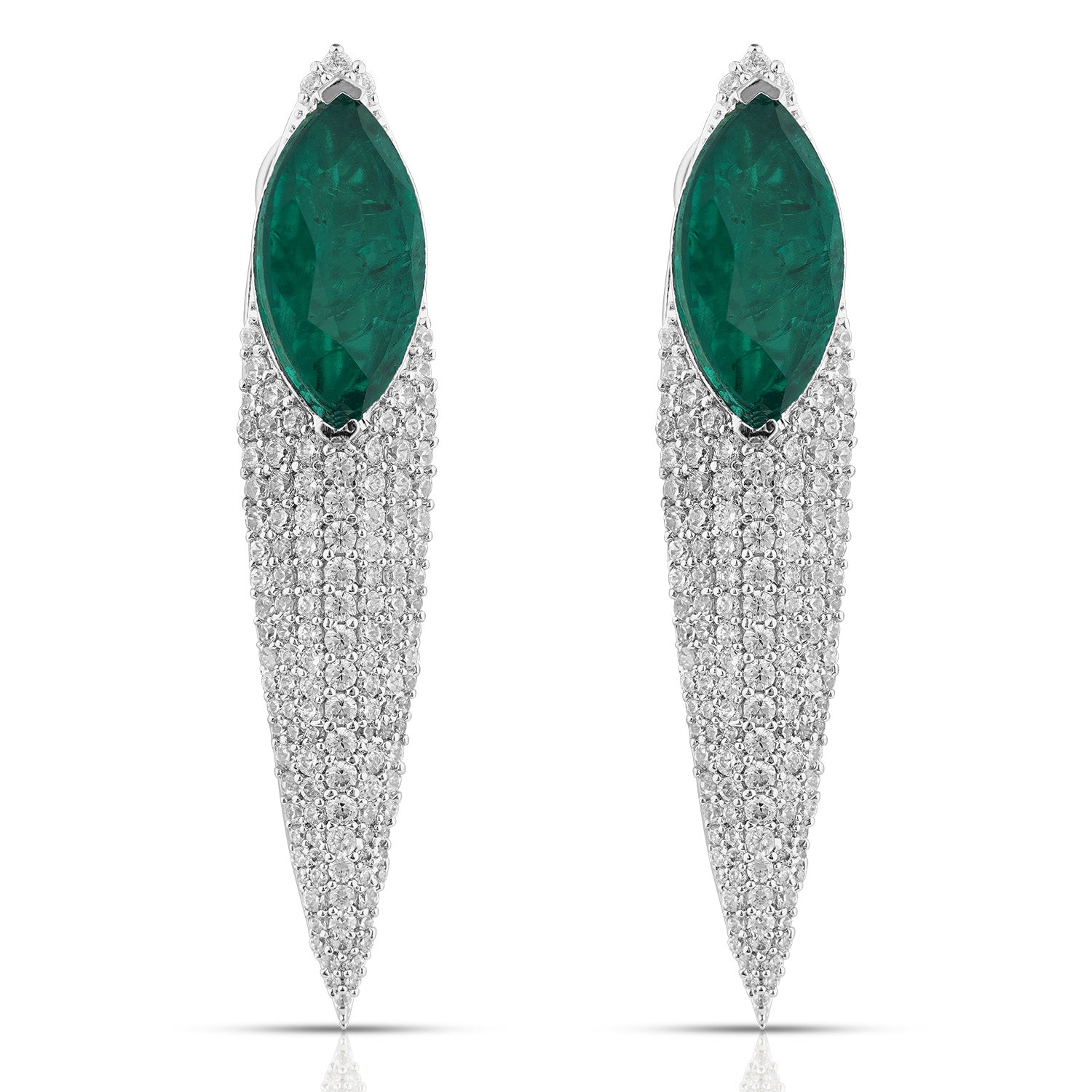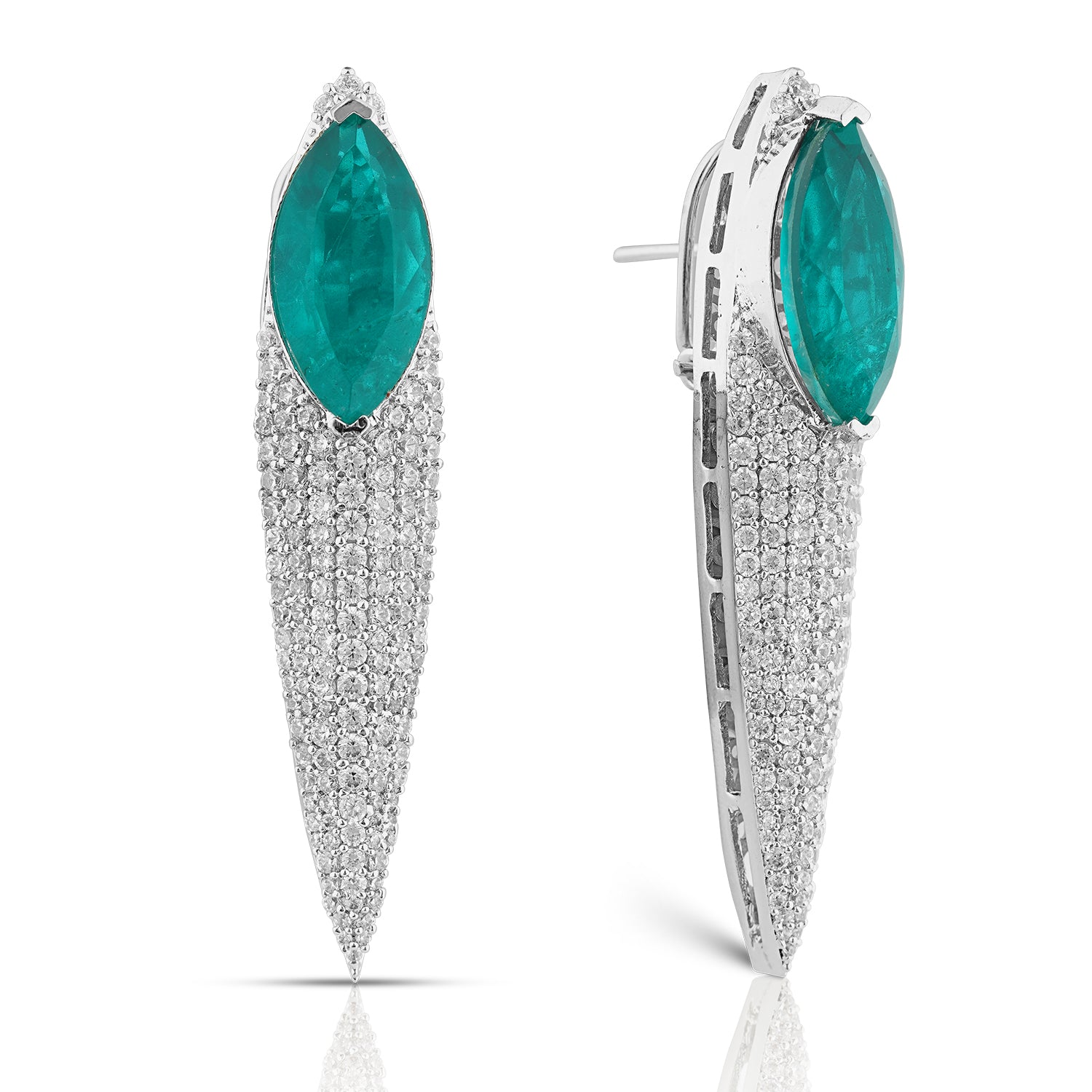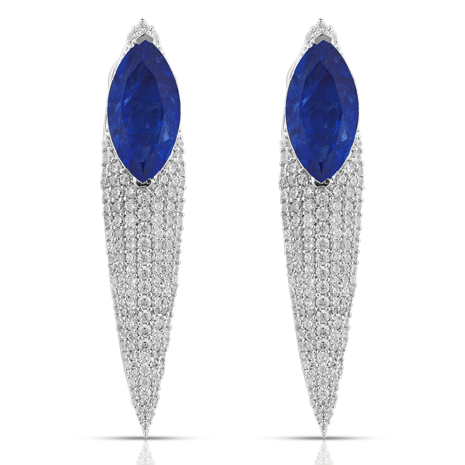 The Meher Earrings redefine statement elegance. A vivid marquise-cut blue stone crowns the design, flowing into a tapered cascade of shimmering CZ stones that create a sleek, elongated silhouette. Radiant and refined, this pair balances bold color with fluid sparkle, making it a striking choice for contemporary glamour.