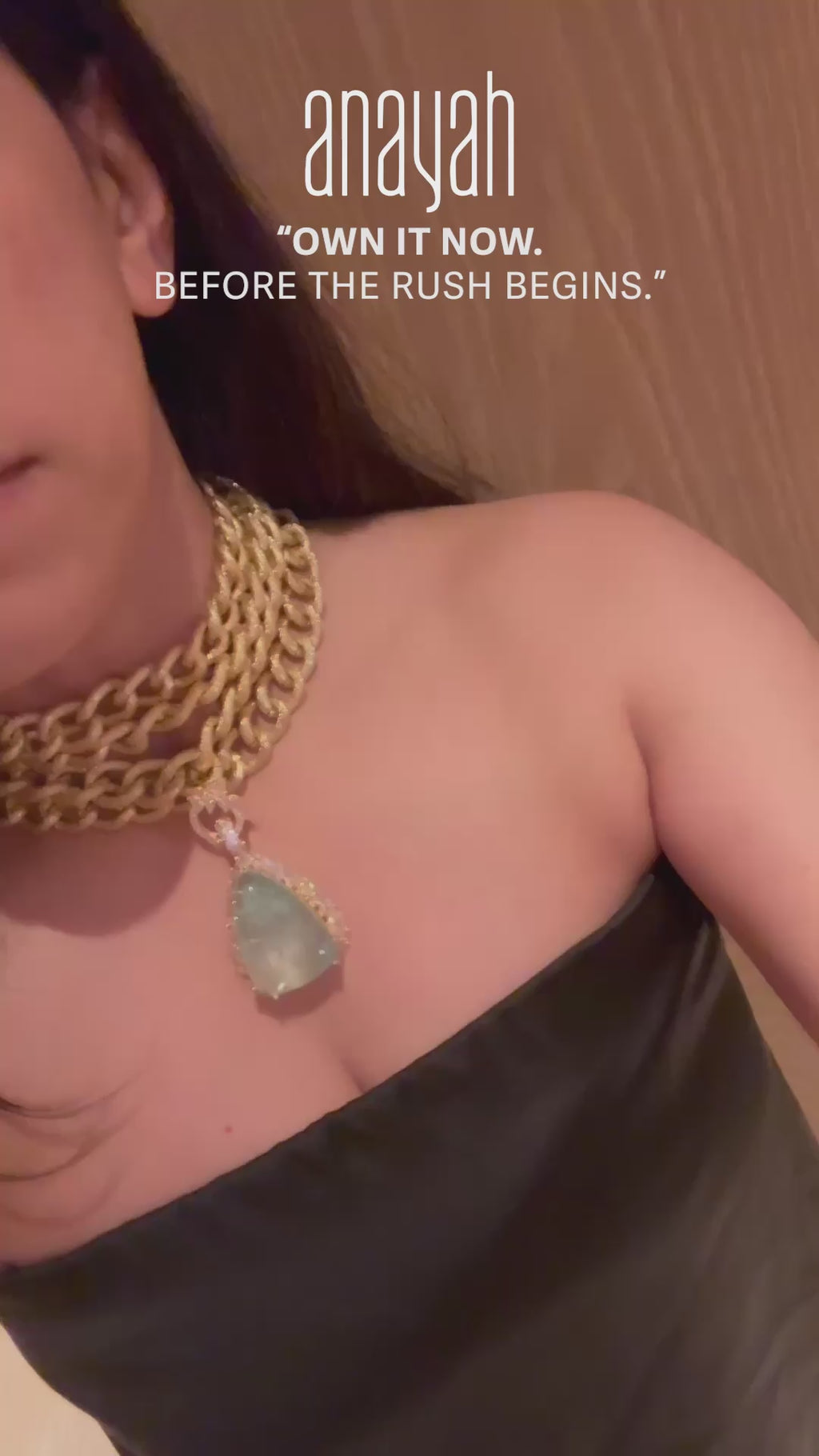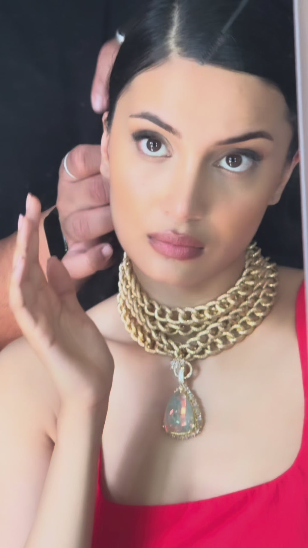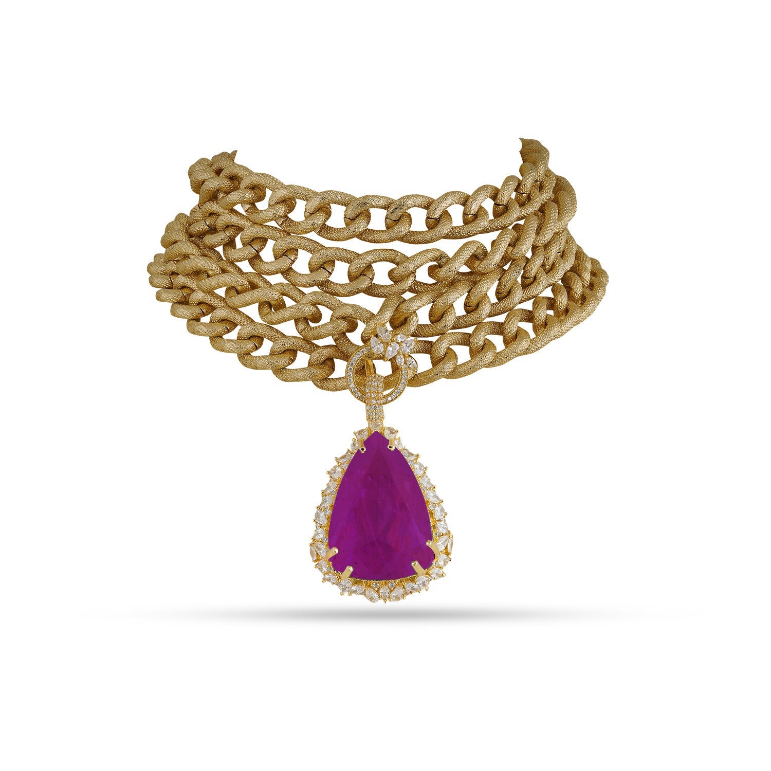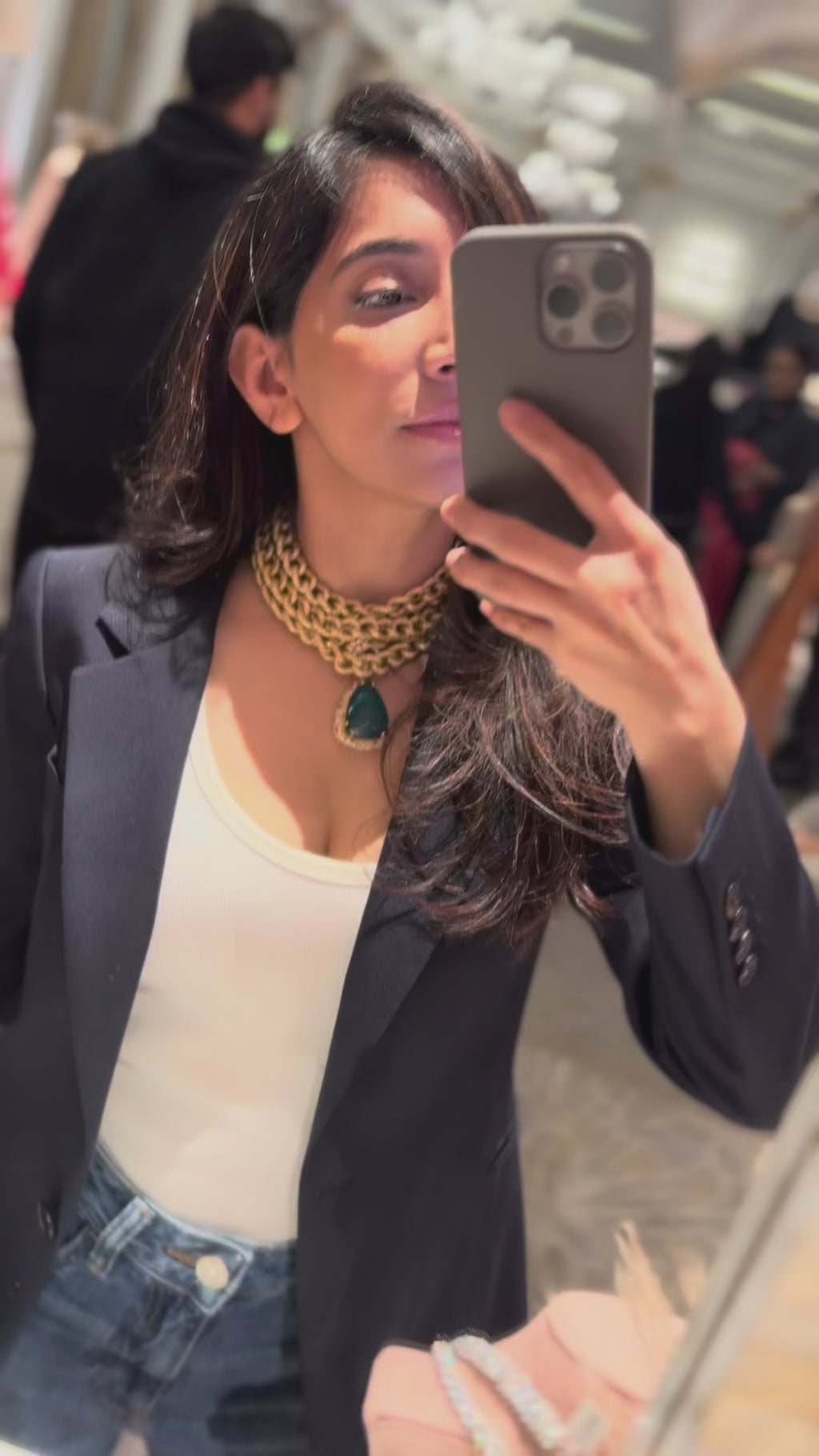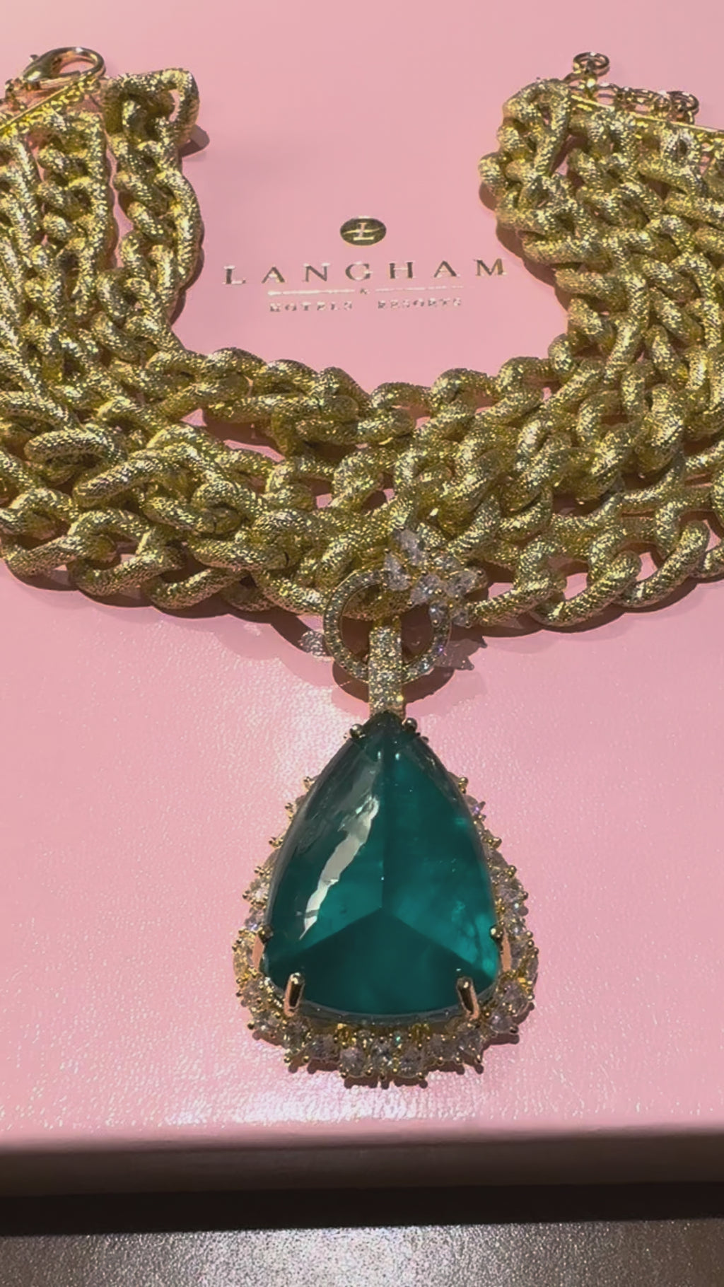 Unleash your inner queen with our Roza necklace! This stunning piece features an emerald green sugarloaf-cut doublet centre stone pendant on a multi-layered gold chain that is super lightweight for comfort and ease of wear.