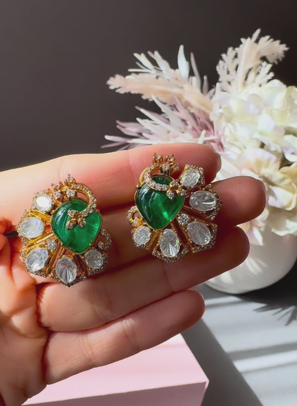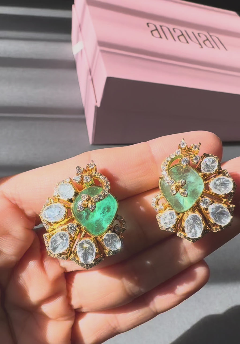 Grace your look with the serene charm of the Akriti - Mint Green Peacock Studs. These earrings feature a soft mint green enamel heart at the center of an exquisitely detailed peacock, accented with kundan-style stones and glimmering cubic zirconia. The antique gold finish adds a traditional richness to their delicate beauty.