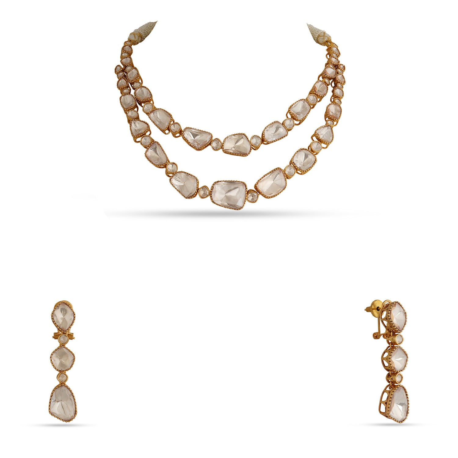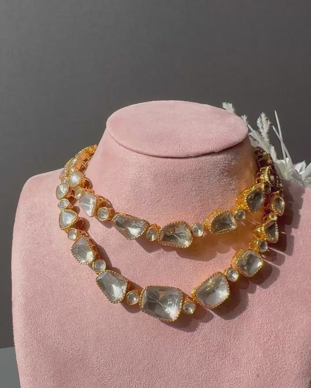 Add a touch of elegance with the Mahek double layer polki necklace set. This set includes a stunning necklace with two layers of intricate polki designs and matching earrings. Complete any outfit with this versatile set that radiates style and sophistication.