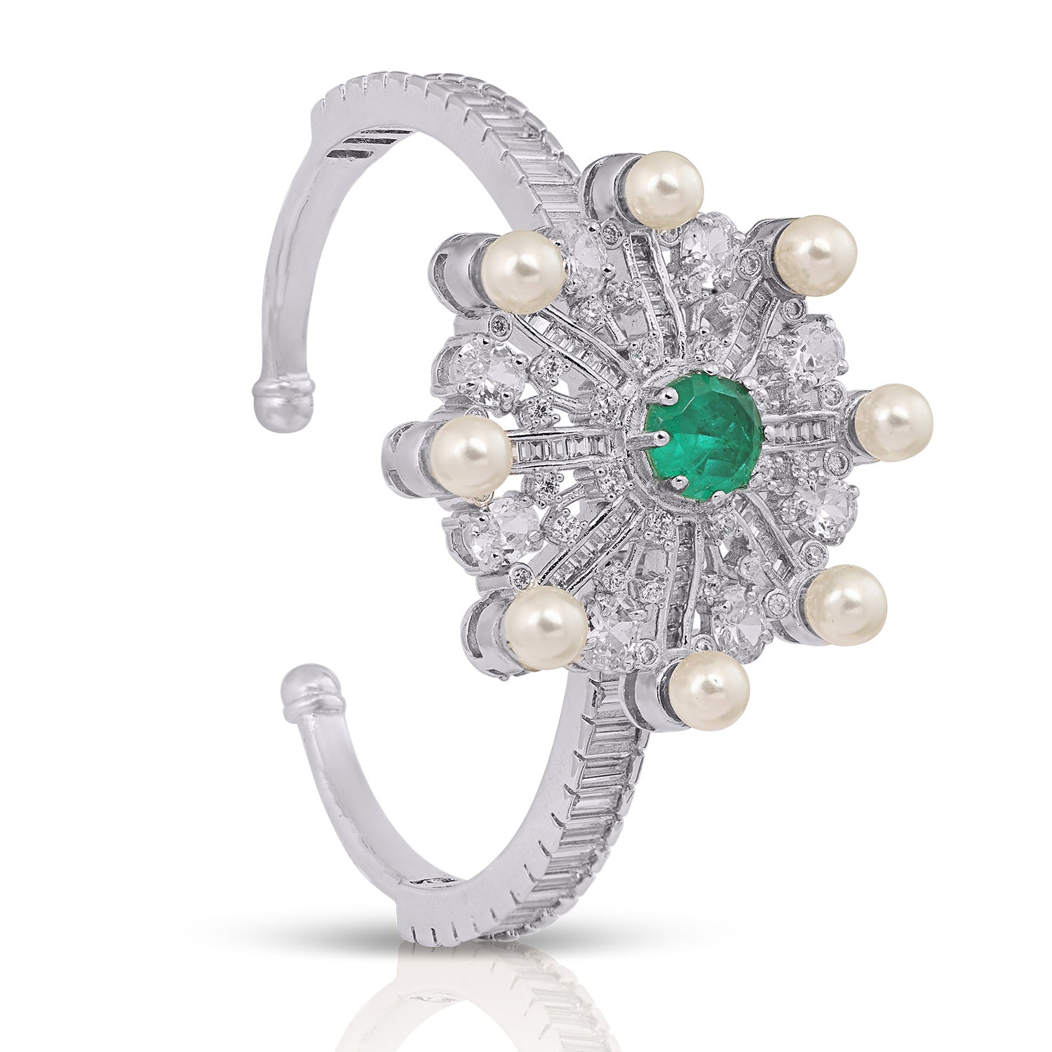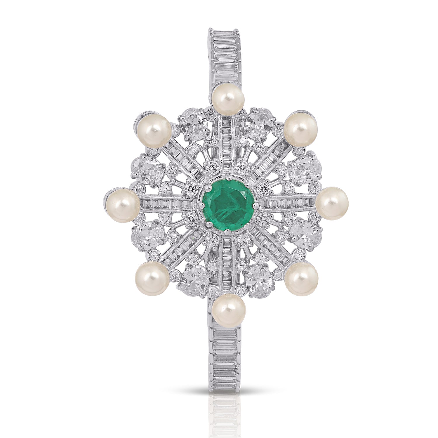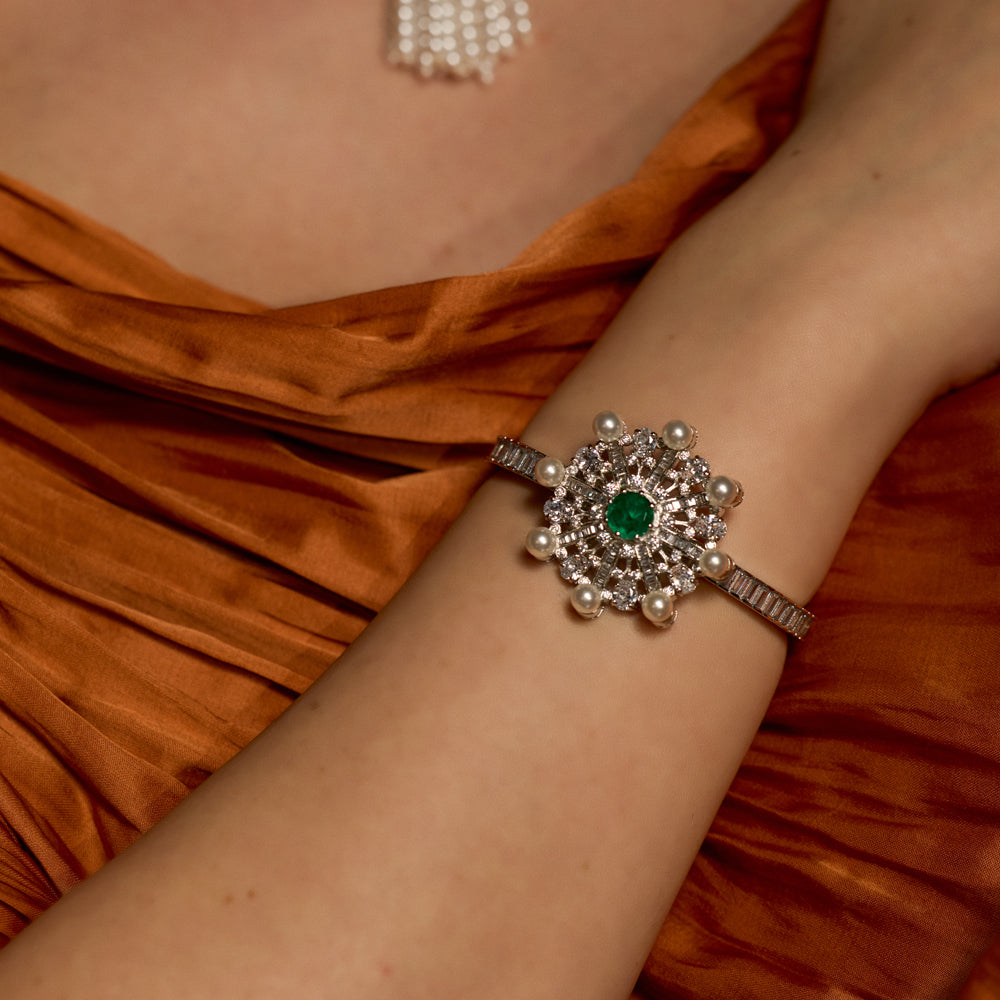 A luminous expression of symmetry and brilliance, the Arisha Bracelet is designed around a striking emerald centre, encircled by radiant stones in a sculpted sunburst formation. Delicate pearls frame the motif, softening its brilliance with a touch of timeless femininity.