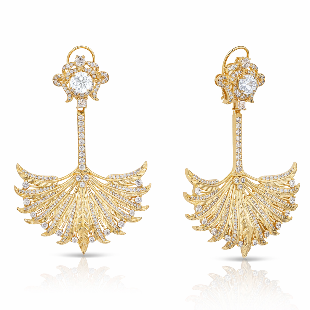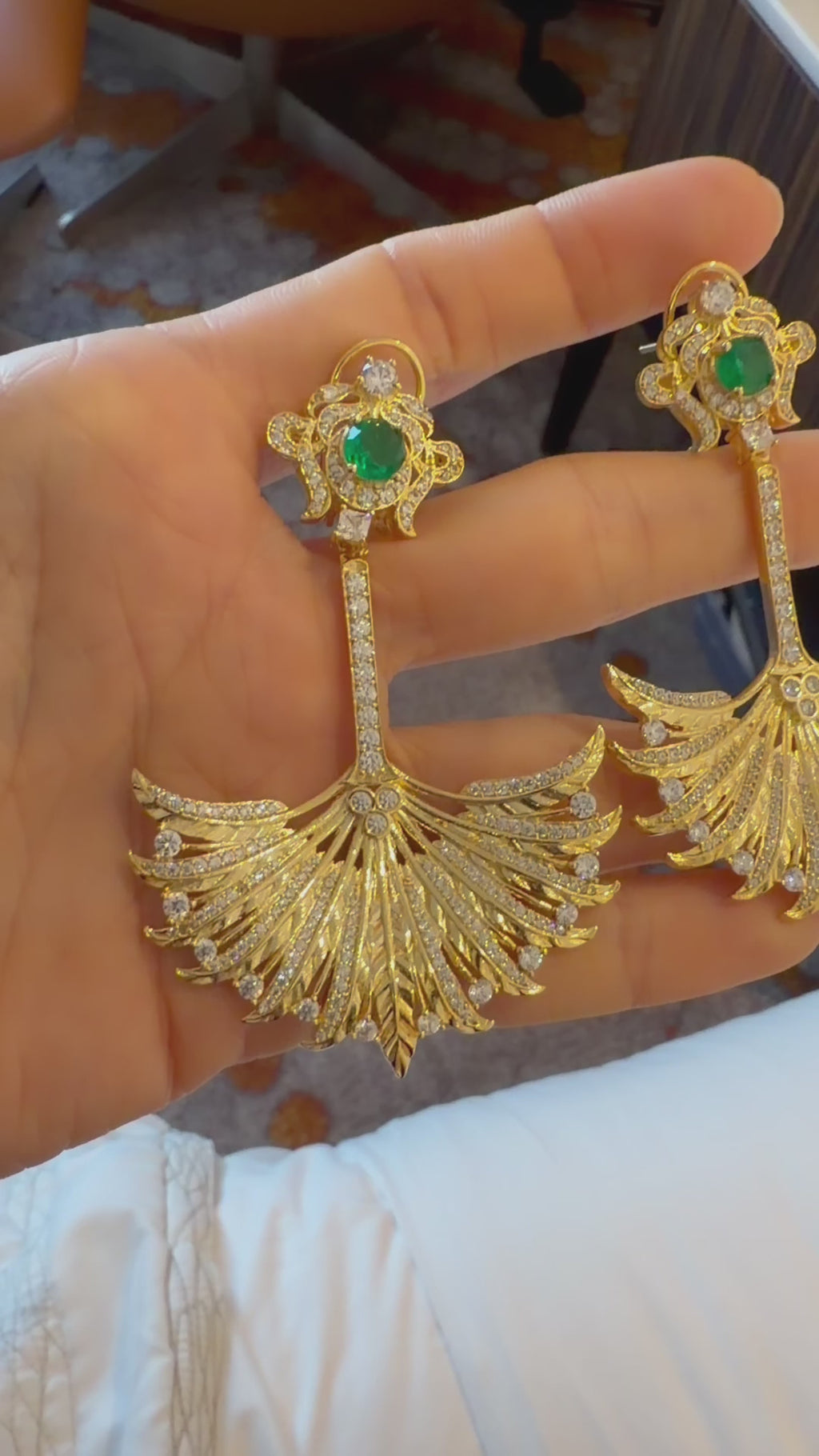 Featuring a vibrant emerald-hued center framed in delicate brilliance, the design flows into a fan-shaped cascade of finely detailed goldwork and shimmering stones.