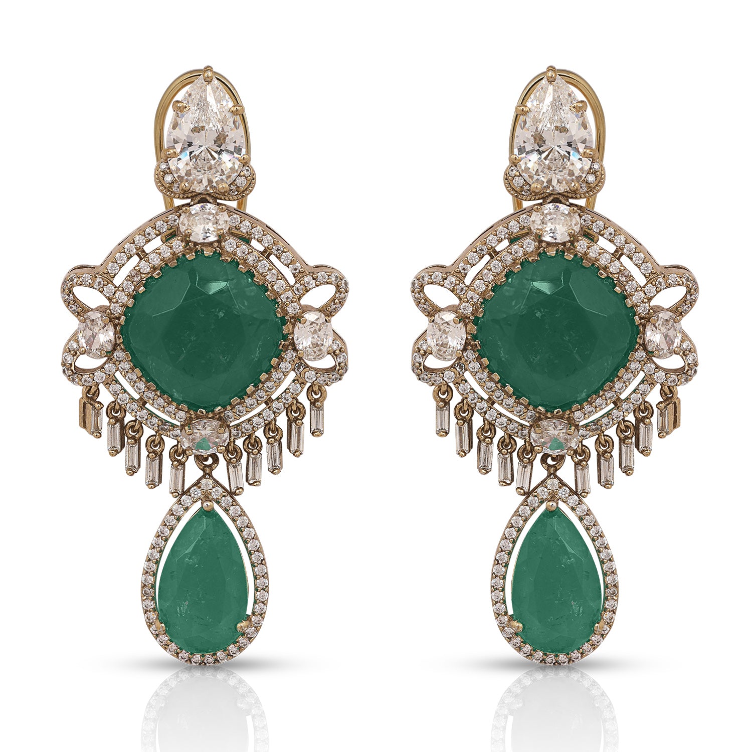 Striking and unapologetically elegant, the Reemah Dangle Earrings are designed to command attention. The centre stone is framed by intricate CZ stone detailing, creating a radiant focal point that captures the light from every angle. Suspended below, a pear-shaped drop adds graceful movement and depth, enhancing the silhouette with refined drama.