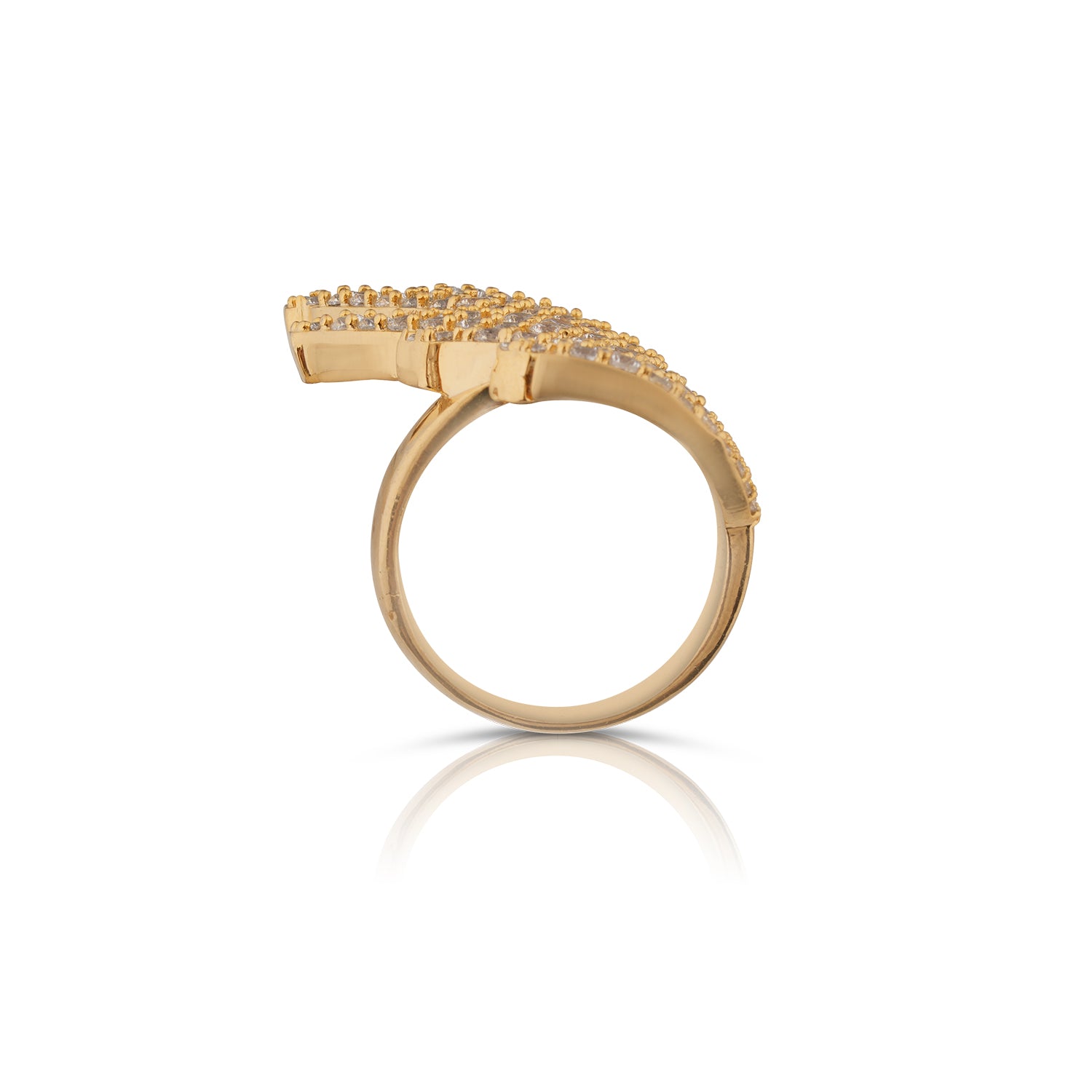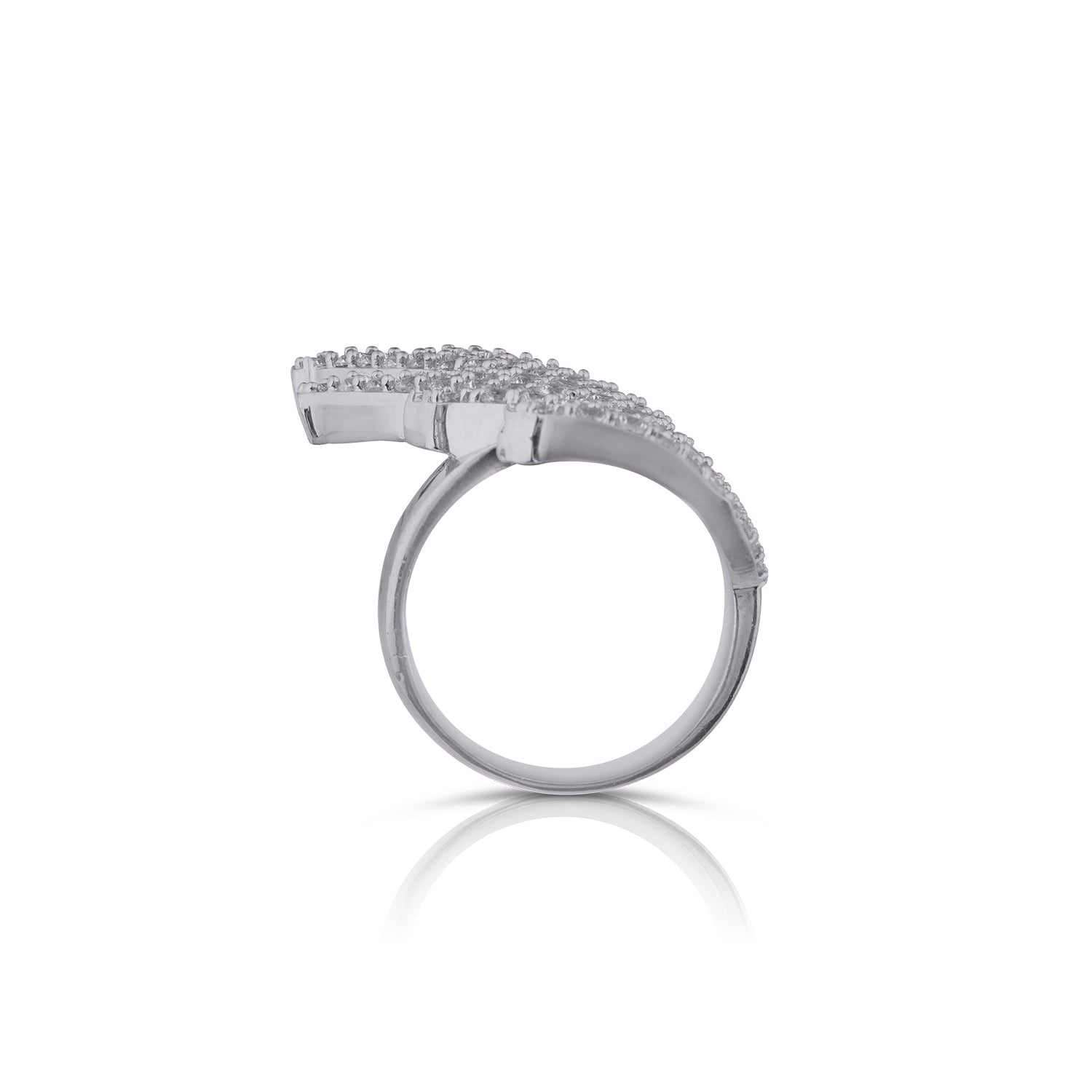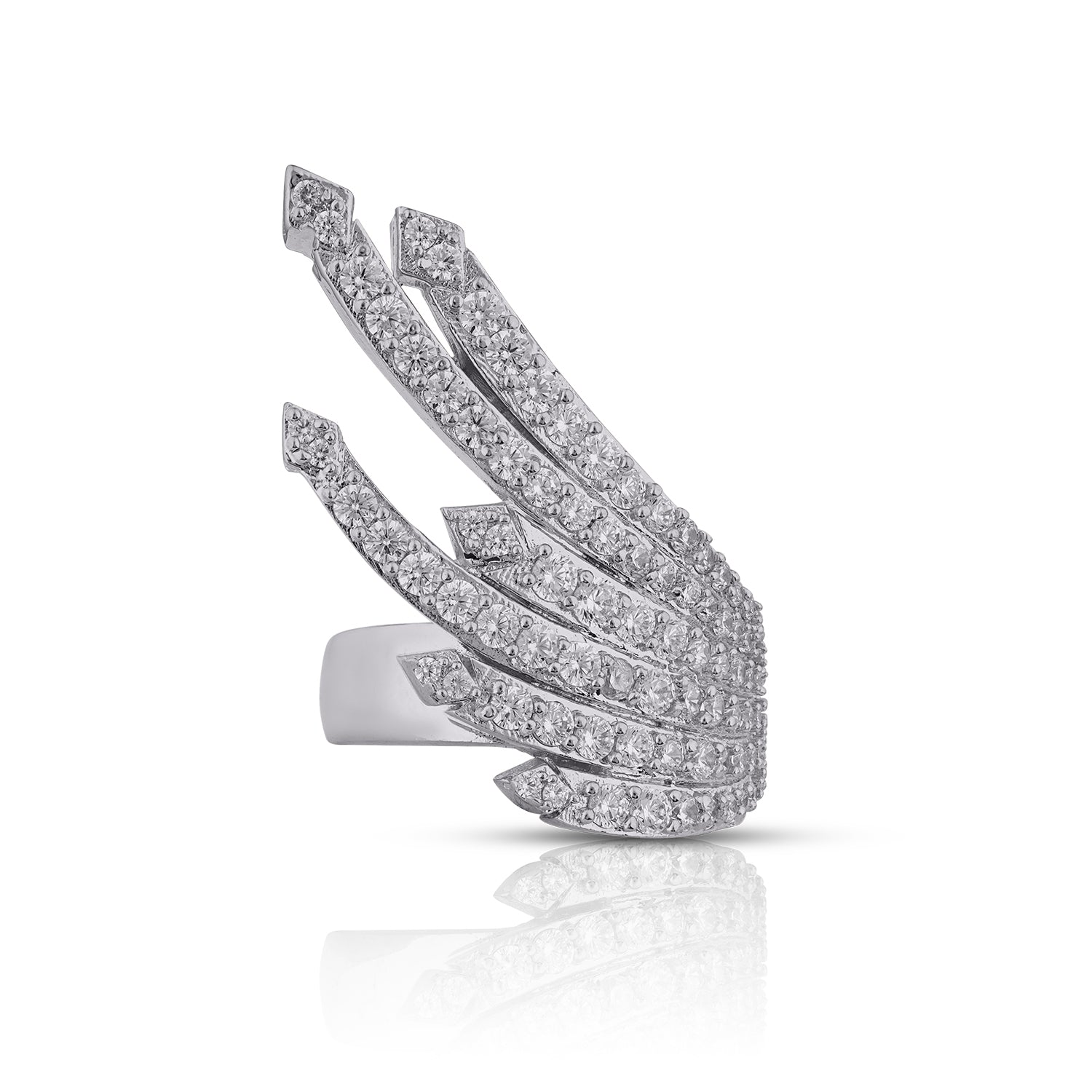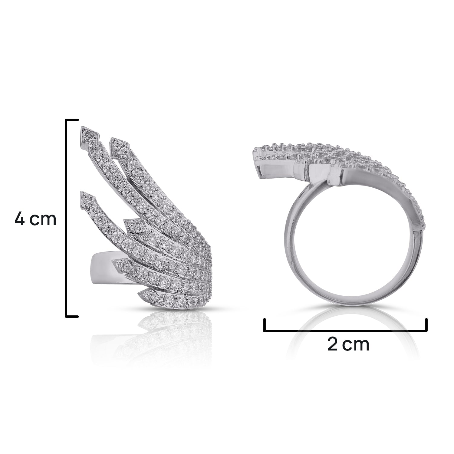 A bold silver statement ring featuring layered, pavé-set crystals that catch the light from every angle. Designed with a sculpted, wrap-style silhouette, this modern crystal ring adds instant glamour to both evening and occasion looks. Perfect for stacking or wearing solo as a standout silver cocktail ring.