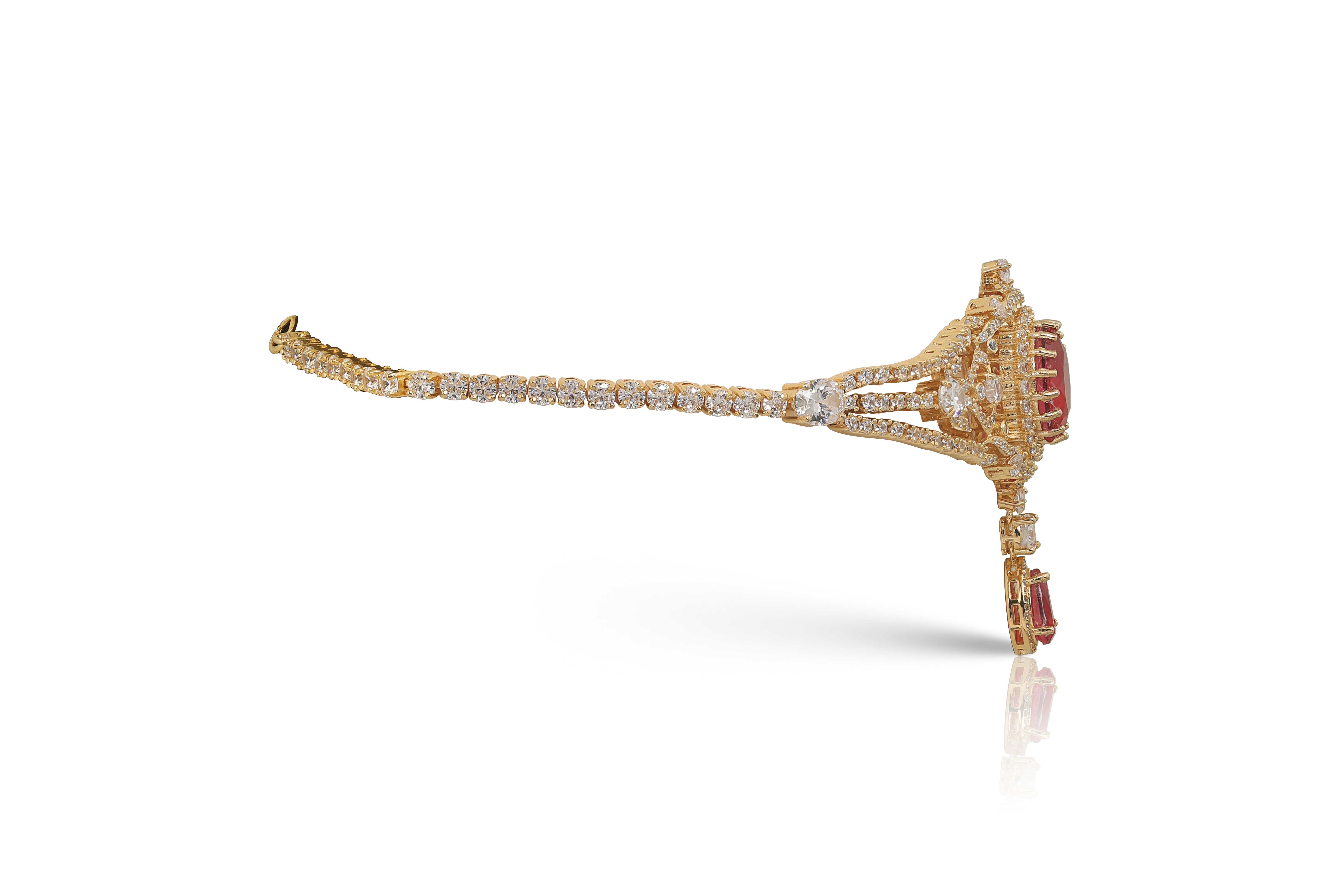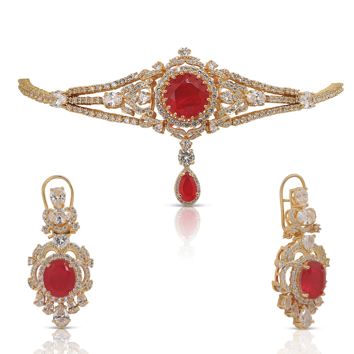 Majestic and intricately detailed, the Samia Choker is designed to frame the neckline with commanding elegance. A radiant ruby-toned centre stone sits within an ornate lattice of finely set CZ stones, creating depth, texture, and luminous brilliance. Delicate layered bands contour gracefully around the neck, culminating in a suspended teardrop ruby accent that adds movement and refined drama.