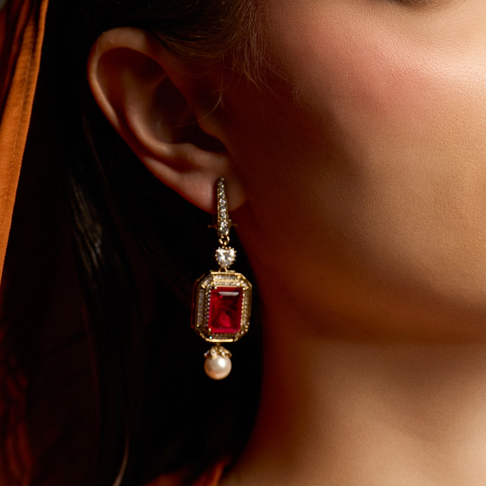 Timeless with a touch of vintage romance, the Sareen Dangle Earrings are defined by their striking emerald-cut ruby-hued centre stone, framed in a delicately textured gold setting. Suspended from a crystal-accented hoop, the geometric silhouette is softened by a luminous pearl drop that adds graceful movement and balance.