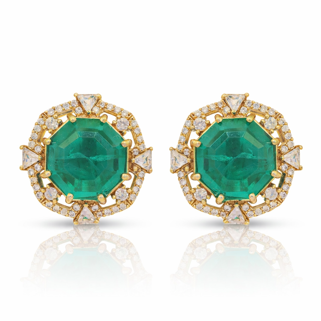 Bold yet beautifully balanced, the Selma Stud Earrings feature a striking emerald-toned centre stone in a sculpted geometric cut, encircled by delicate CZ accents. The textured gold setting enhances the richness of the colour, creating depth and dimension within a clean, structured silhouette.