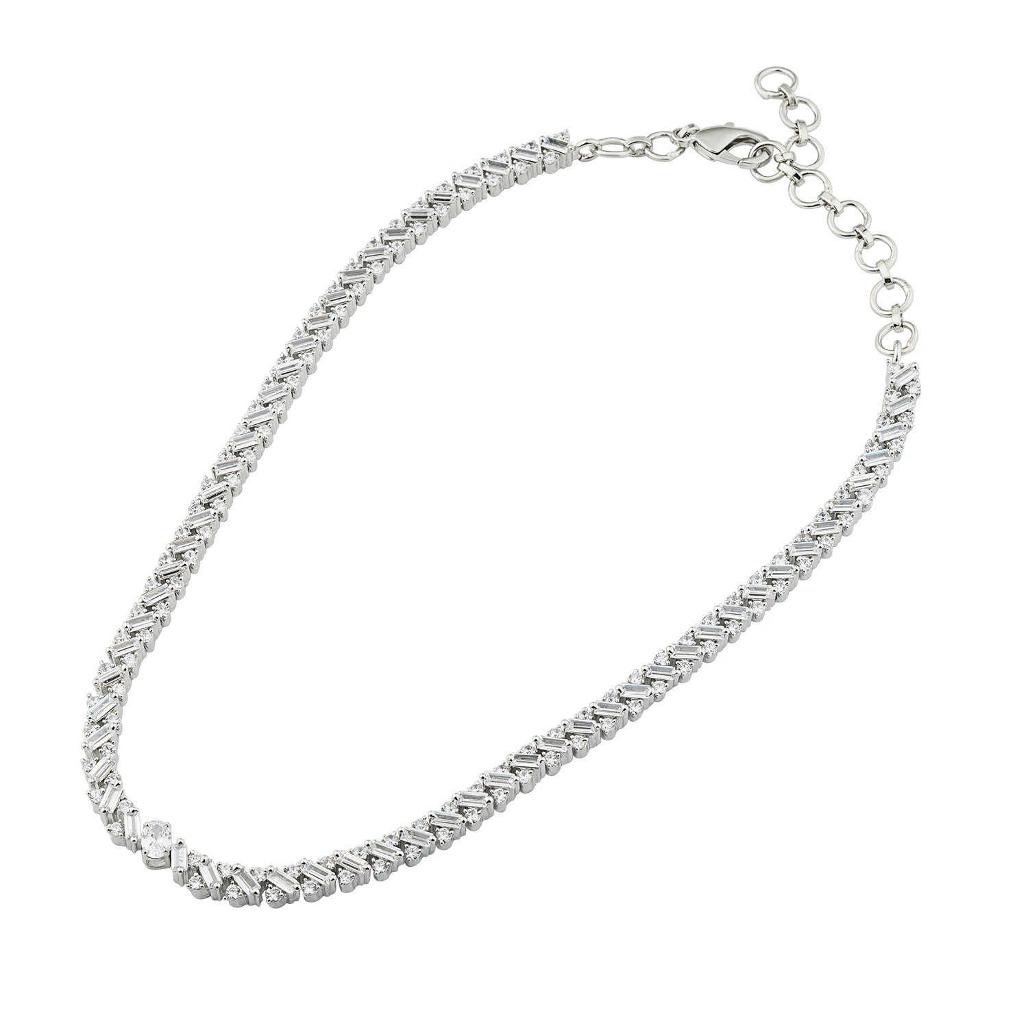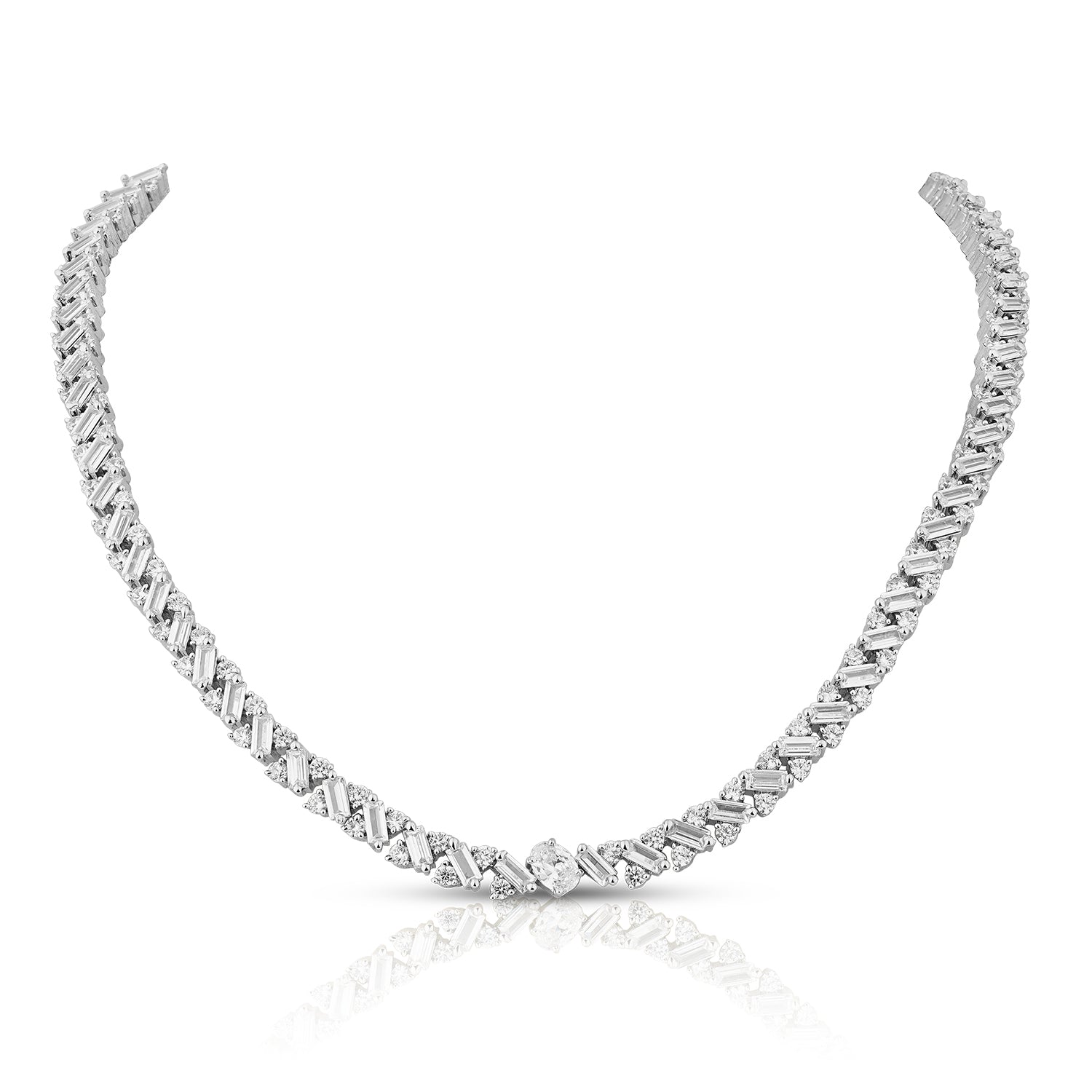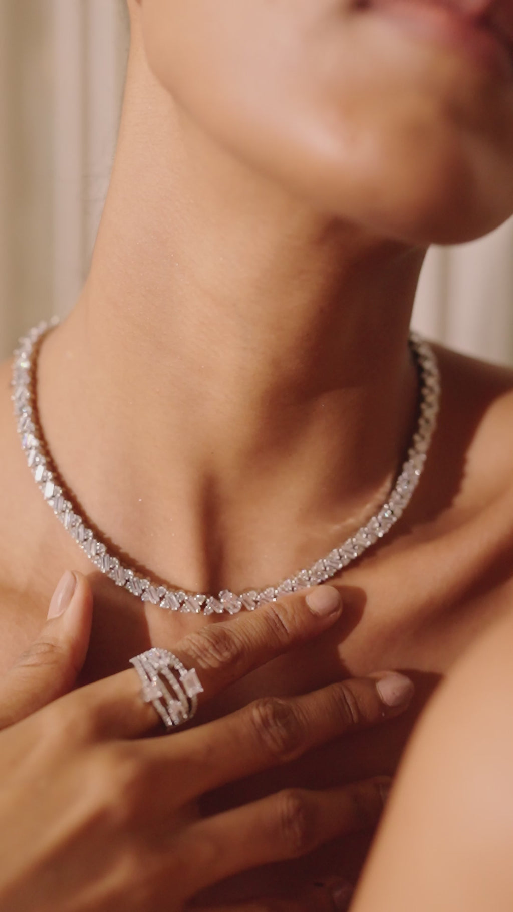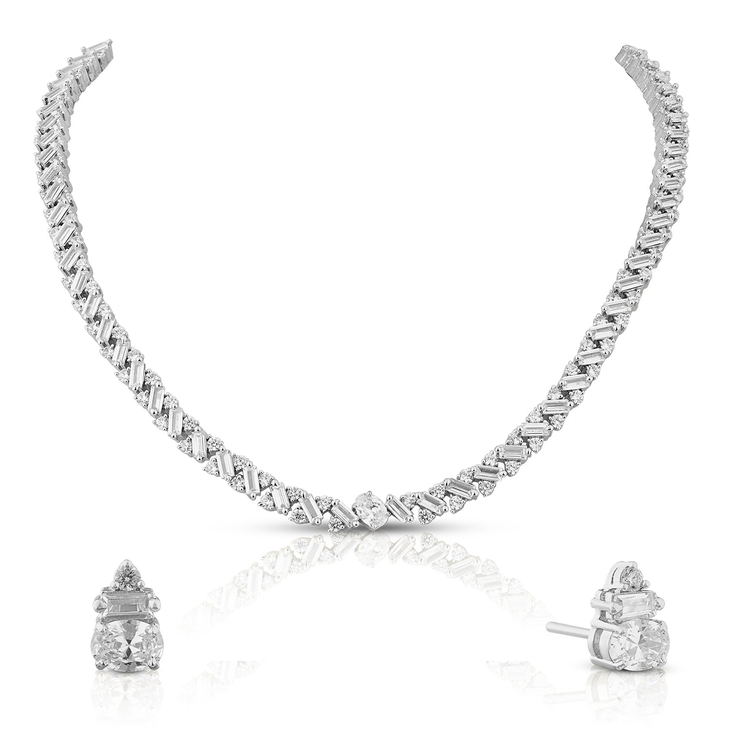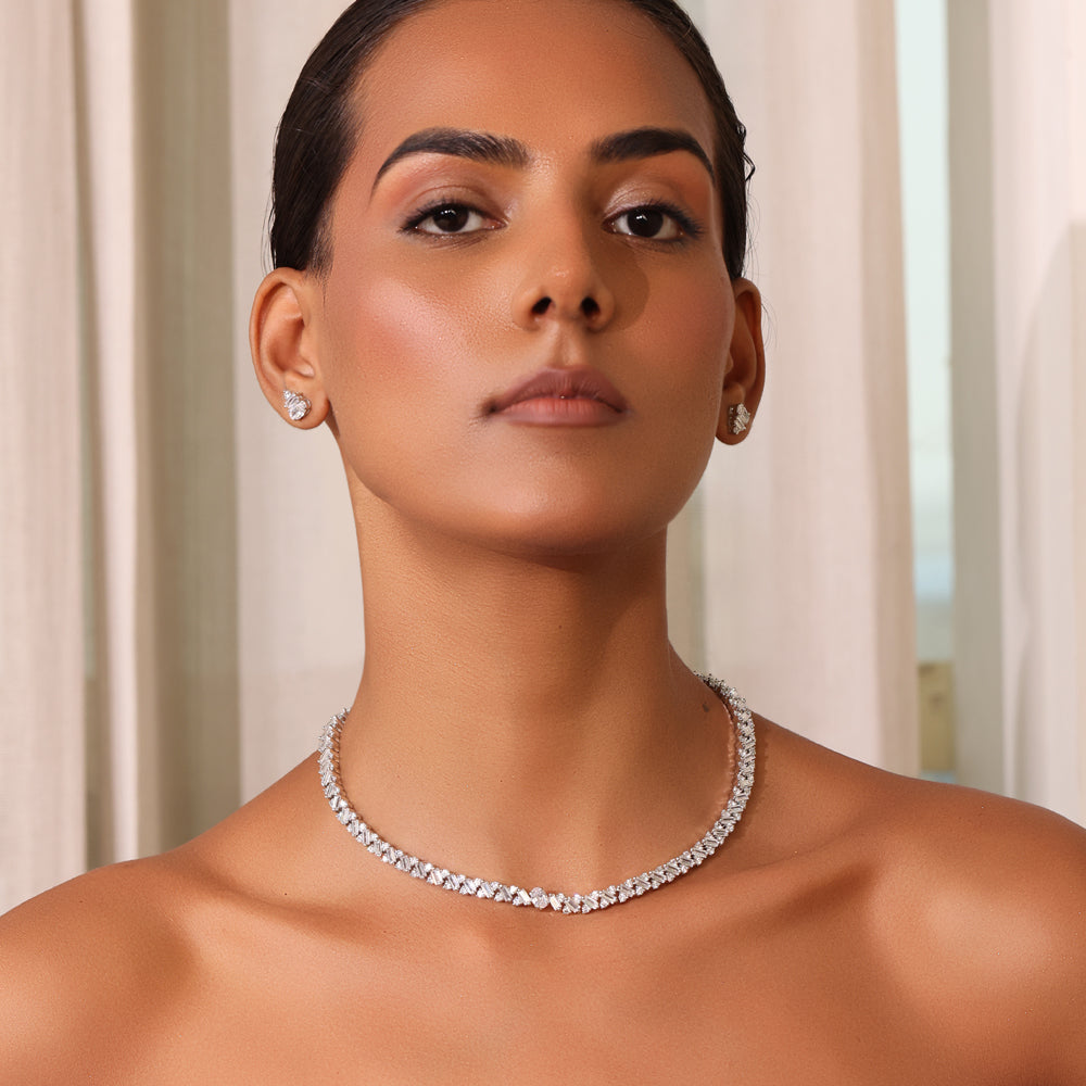 Graceful and refined, the Bellamy Necklace Set is a study in timeless beauty. A delicate arrangement of baguette and round-cut stones forms a fluid rhythm, shimmering with every movement like poetry in motion. The necklace curves gently along the neckline, its elegance heightened by the refined simplicity of its matching studs.