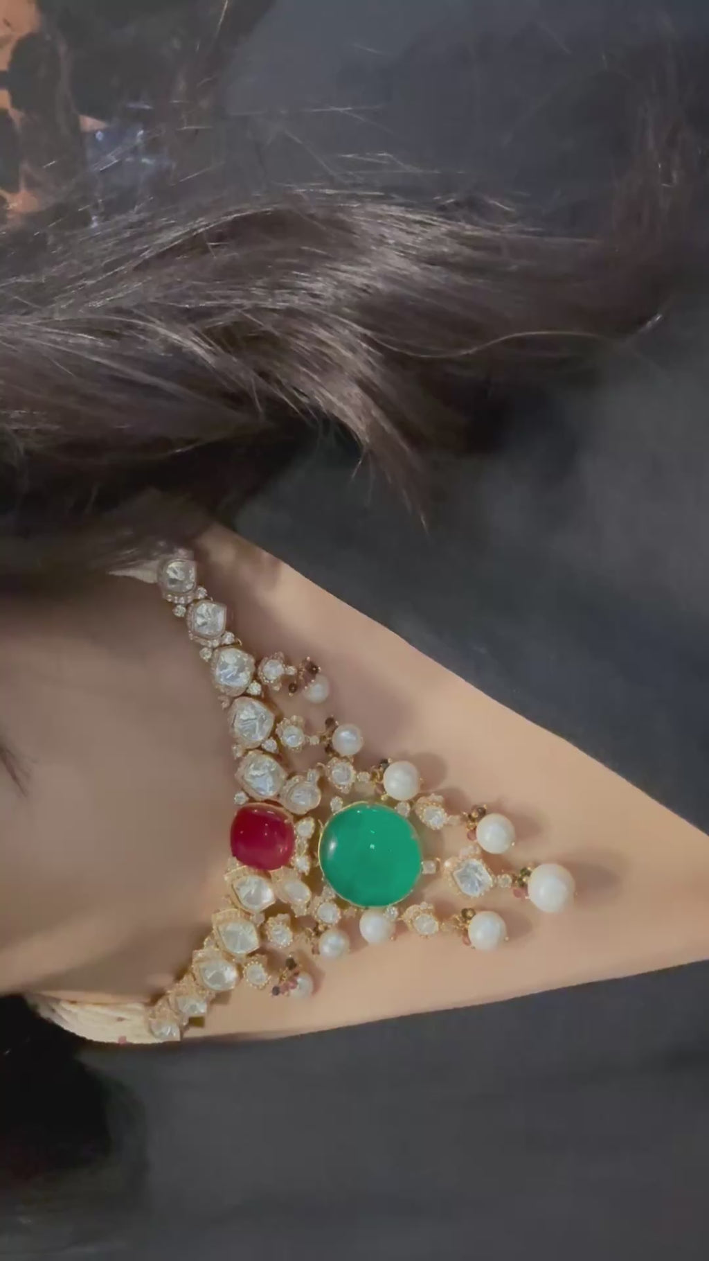This elegant sea green stone necklace set features intricate polki and delicate pearl drops. The perfect addition to any outfit, this set exudes sophistication and charm. Elevate your style with Eira - the ideal accessory for any occasion.