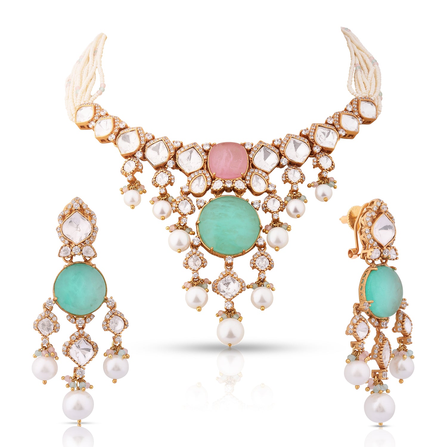 This elegant mint green stone necklace set features intricate polki and delicate pearl drops. The perfect addition to any outfit, this set exudes sophistication and charm. Elevate your style with Eira - the ideal accessory for any occasion.