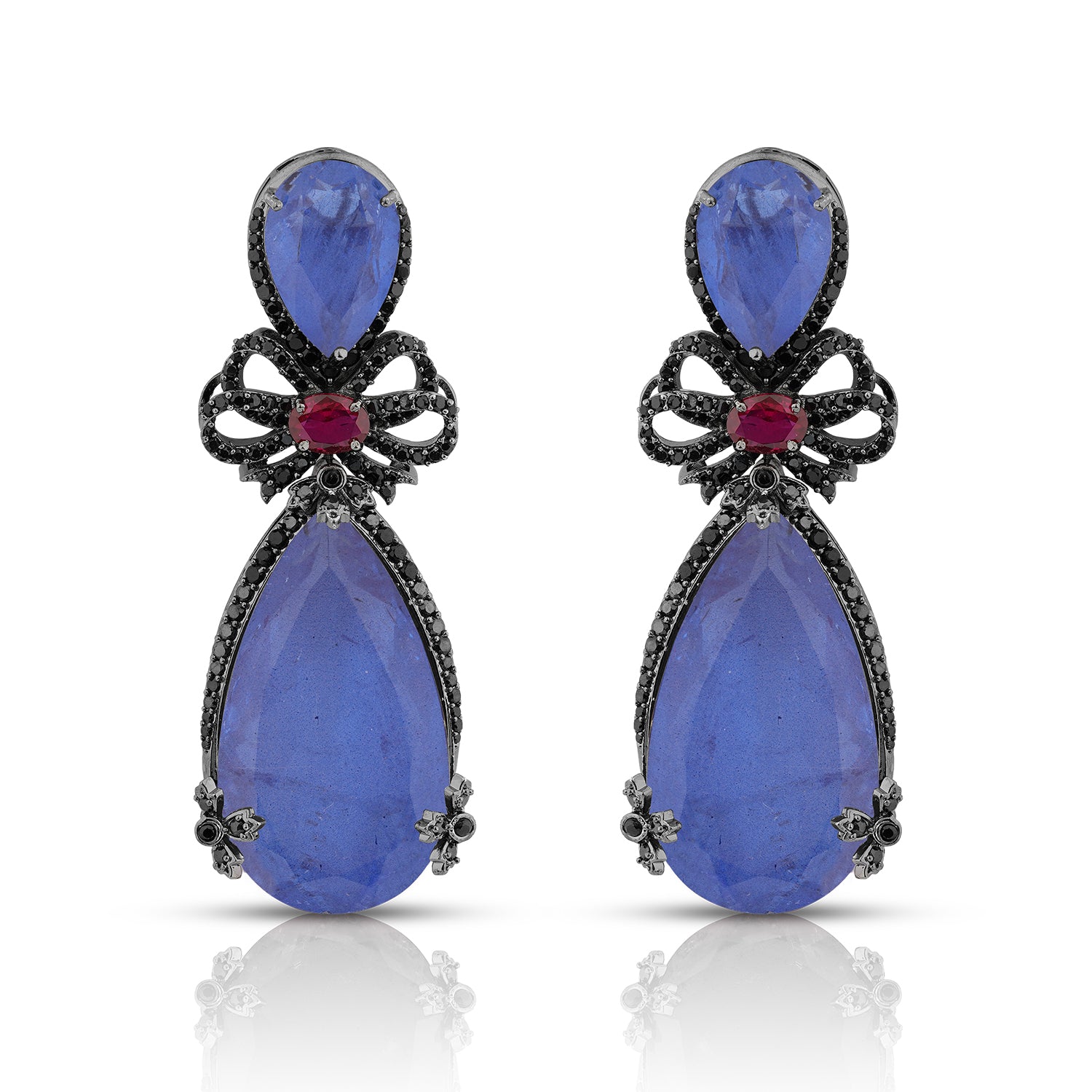 The Ivy Dangle Earrings are a striking blend of romance and regality. Designed with an opulent teardrop silhouette in deep crimson, each earring is adorned with a delicate bow motif, encrusted with dark accents that heighten its drama.