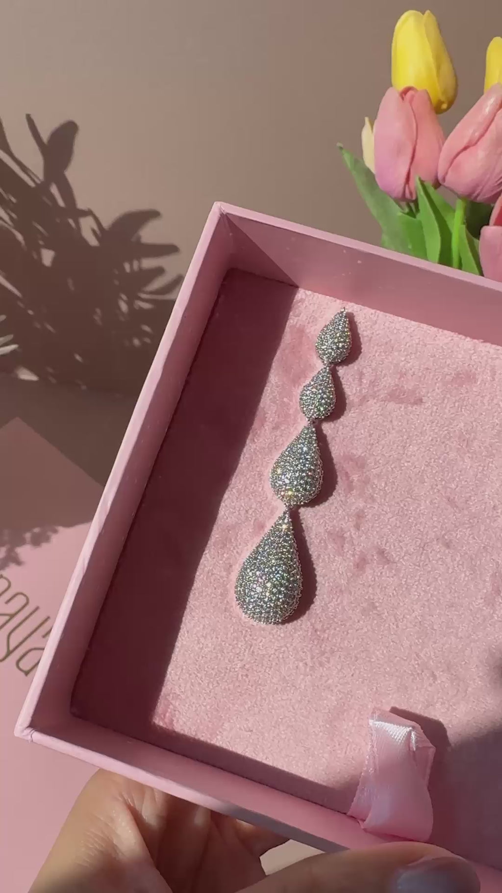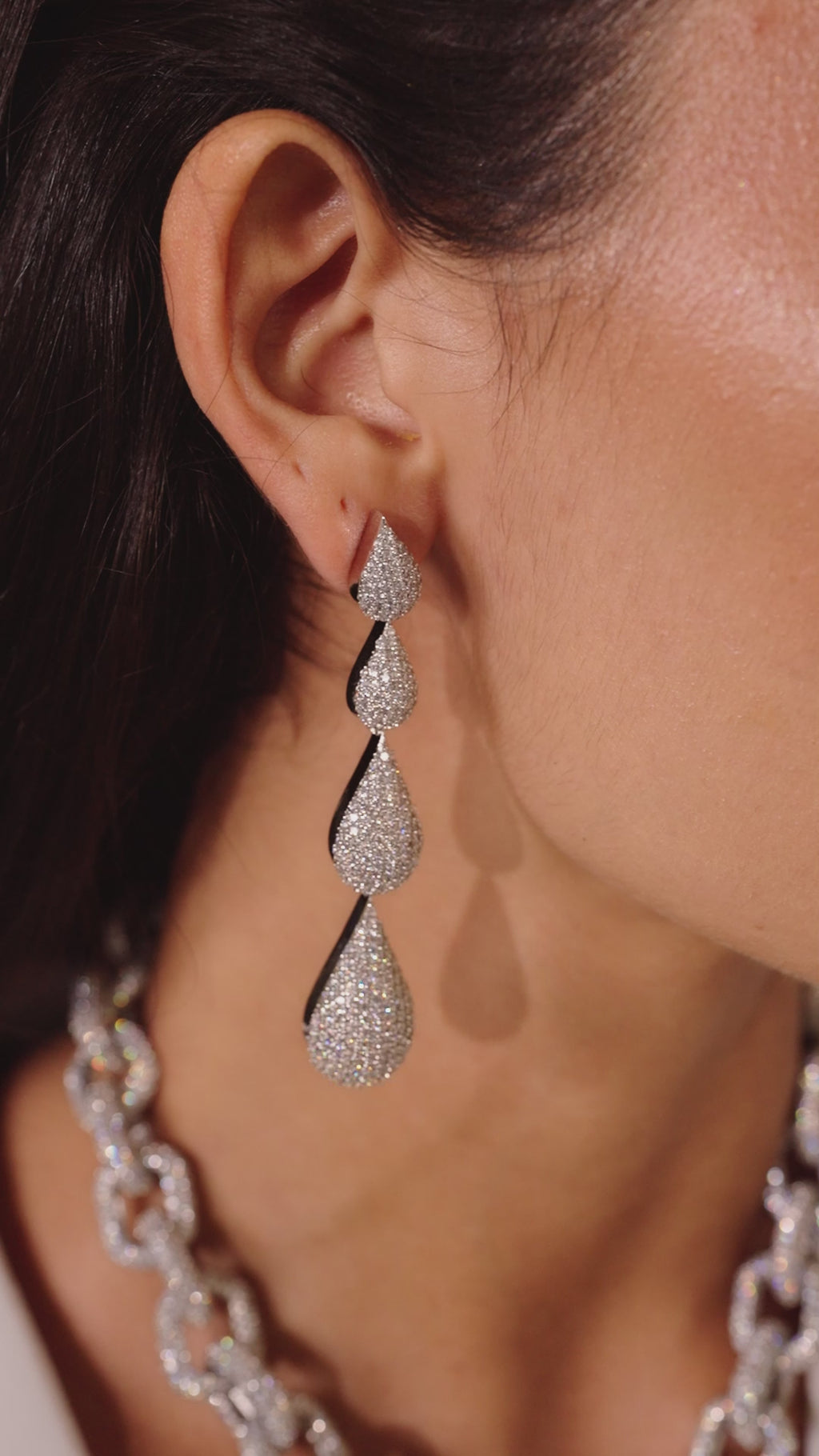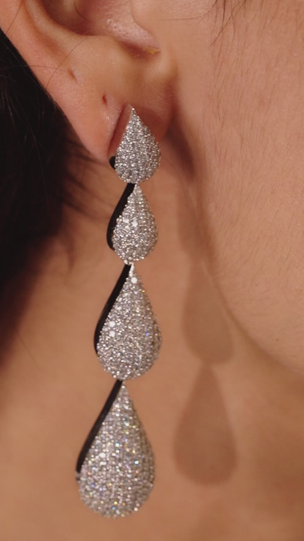 A true red-carpet-worthy piece, these cascading teardrop earrings are a glittering spectacle of movement and light. Composed entirely in cubic zirconia, each tier catches the light from every angle. Their graceful silhouette and shimmering design make them an instant statement—bold yet refined.
