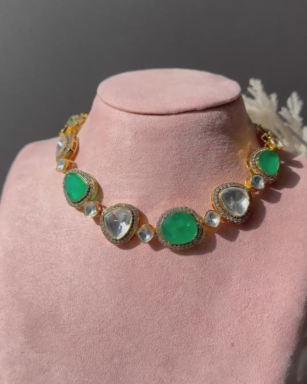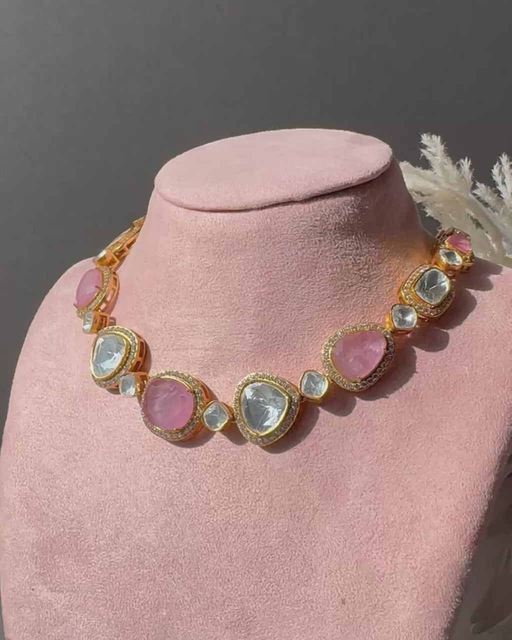 Make a statement with the Raaya Necklace Set, a perfect blend of modern elegance and traditional craftsmanship. Crafted from high-quality gold-plated Italian brass, it features vibrant semi-precious pink stones paired with dazzling Polki moissanite stones enhanced with pure silver foiling.