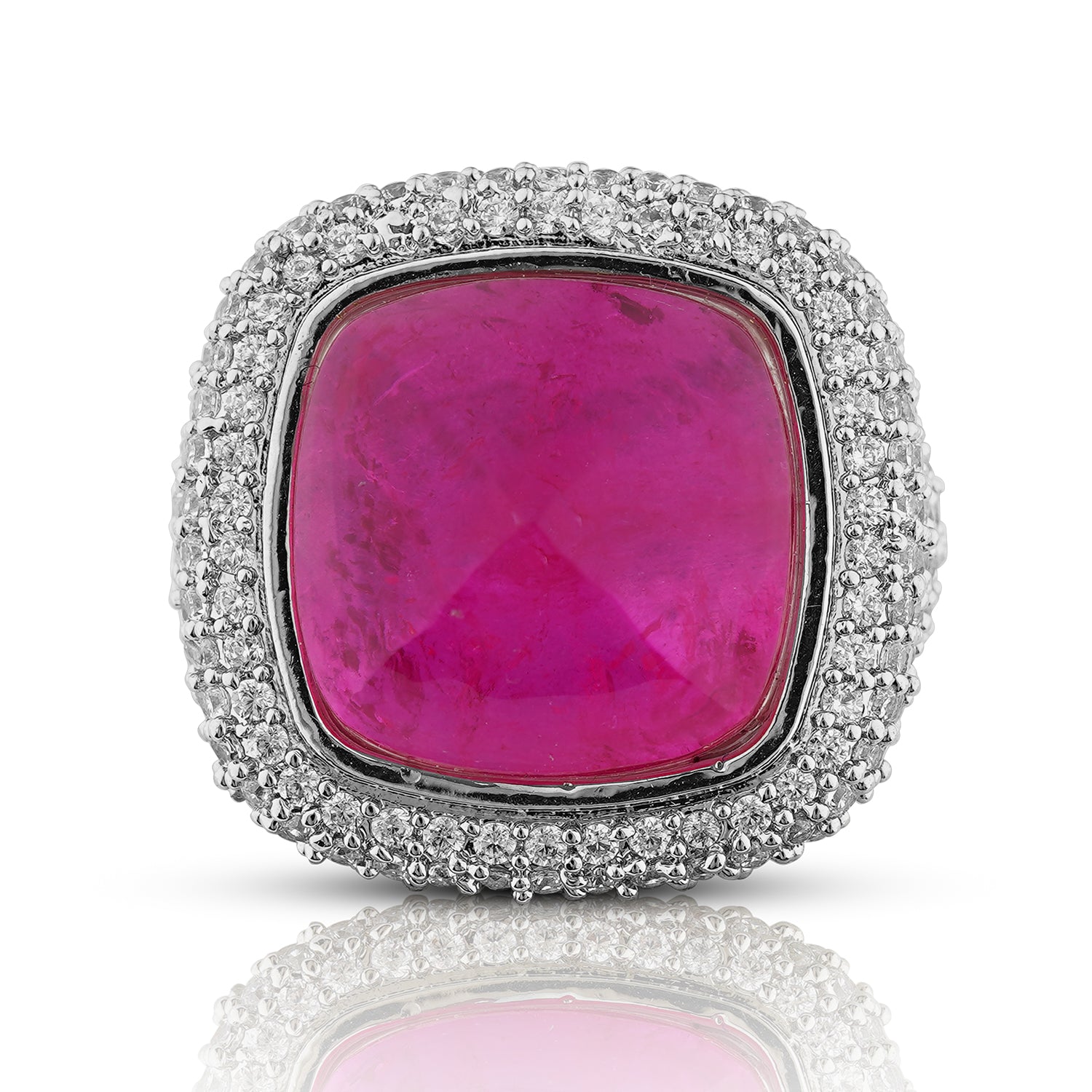 The Caroline Ring is bold, luminous, and unapologetically glamorous. At its center lies a striking cushion-cut ruby-hued stone, rich in depth and framed by a halo of shimmering CZ stones. The wide, pavé-set band adds texture and brilliance, making this piece an instant statement-maker.