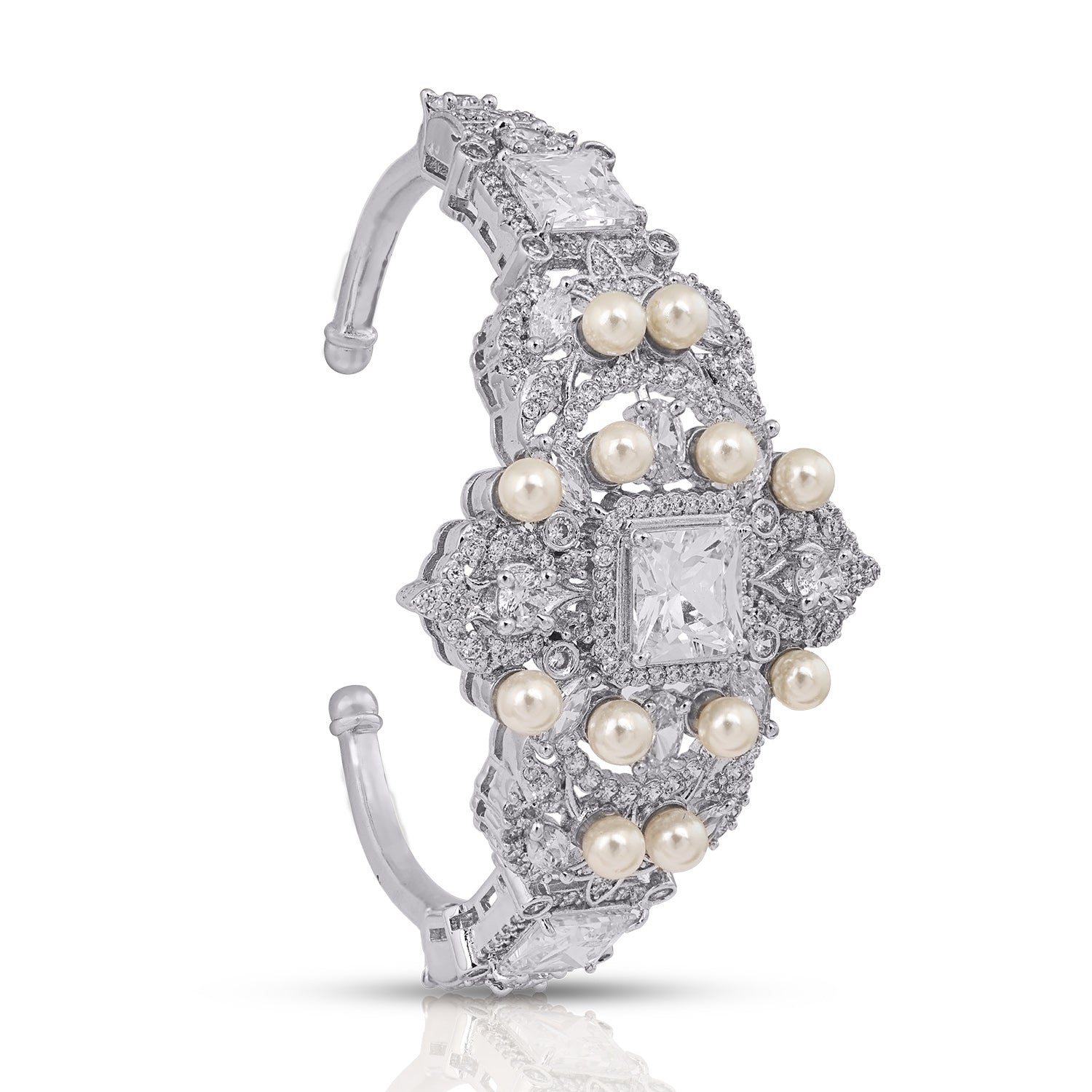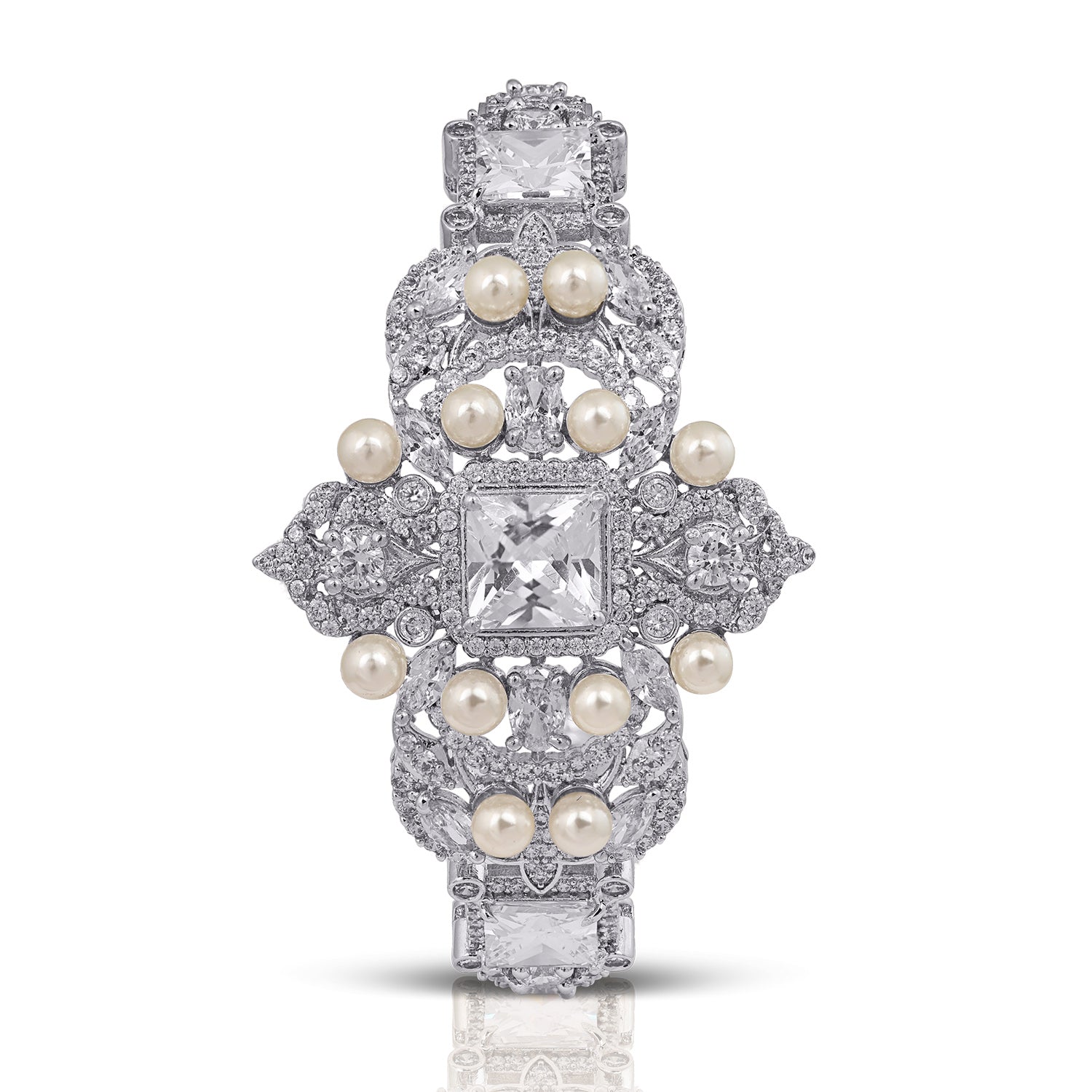 An ode to timeless grandeur, the Arwa Bracelet is a celebration of intricate craftsmanship and luminous elegance. A sculpted central motif, adorned with brilliant-cut stones and delicate pearls, forms the heart of this design — radiating refined opulence from every angle.
